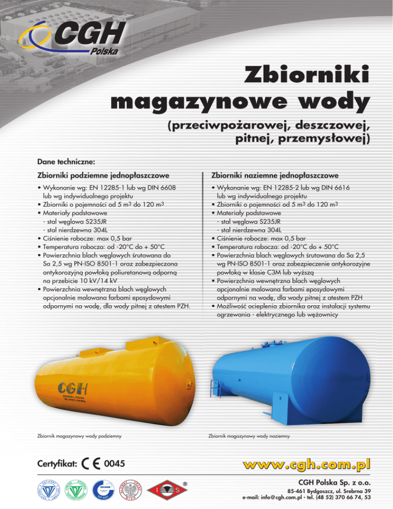 Zbiorniki magazynowe wody (przeciwpo˝arowej, deszczowej, pitnej, przemys∏owej) Dane techniczne: Zbiorniki podziemne jednop∏aszczowe Zbiorniki naziemne jednop∏aszczowe • Wykonanie wg: EN 12285-1 lub wg DIN 6608 lub wg indywidualnego projektu • Zbiorniki o pojemnoÊci od 5 m3 do 120 m3 • Materia∏y podstawowe - stal w´glowa S235JR - stal nierdzewna 304L • CiÊnienie robocze: max 0,5 bar • Temperatura robocza: od -20°C do + 50°C • Powierzchnia blach w´glowych Êrutowana do Sa 2,5 wg PN-ISO 8501-1 oraz zabezpieczona antykorozyjnà pow∏okà poliuretanowà odpornà na przebicie 10 kV/14 kV • Powierzchnia wewn´trzna blach w´glowych opcjonalnie malowana farbami eposydowymi odpornymi na wod´, dla wody pitnej z atestem PZH. • Wykonanie wg: EN 12285-2 lub wg DIN 6616 lub wg indywidualnego projektu • Zbiorniki o pojemnoÊci od 5 m3 do 120 m3 • Materia∏y podstawowe - stal w´glowa S235JR - stal nierdzewna 304L • CiÊnienie robocze: max 0,5 bar • Temperatura robocza: od -20°C do + 50°C • Powierzchnia blach w´glowych Êrutowana do Sa 2,5 wg PN-ISO 8501-1 oraz zabezpieczenie antykorozyjne pow∏okà w klasie C3M lub wy˝szà • Powierzchnia wewn´trzna blach w´glowych opcjonalnie malowana farbami eposydowymi odpornymi na wod´, dla wody pitnej z atestem PZH • Mo˝liwoÊç ocieplenia zbiornika oraz instalacji systemu ogrzewania - elektrycznego lub w´˝ownicy Zbiornik magazynowy wody podziemny D 0045 DO Z O HN G TE C U U RZ OR Ñ Certyfikat: ICZN E Zbiornik magazynowy wody naziemny www.cgh.com.pl CGH Polska Sp. z o.o. 85-461 Bydgoszcz, ul. Srebrna 39 e-mail: [email protected] • tel. (48 52) 370 66 74, 53 Zbiorniki magazynowe wody (przeciwpo˝arowej, deszczowej, pitnej, przemys∏owej) Przeznaczenie Magazynowanie wody: • przeciwpo˝arowej • deszczowej • pitnej • przemys∏owej Podstawowe informacje techniczne PojemnoÊç zbiornika Ârednica zbiornika D∏ugoÊç zbiornika Masa zbiornika* W∏az V Dz Lo Lp [m3] [mm] [mm]1 [kg] 10 1600 5540 2100 13 1600 7040 2562 16 1600 8540 3072 10 2000 3660 2098 13 2000 4660 2553 16 2000 5660 3022 20 2000 6660 3493 25 2000 8660 4405 30 2000 10160 5163 35 2000 11660 5871 20 2500 4800 3685 25 2500 5800 4319 30 2500 6800 4949 40 2500 8800 6284 50 2500 10800 7540 60 2500 12800 8886 70 2500 14800 10137 40 2900 6900 6445 50 2900 8400 7740 60 2900 9900 8951 70 2900 11400 10146 80 2900 12900 11440 100 2900 15900 13855 * Orientacyjne wagi3000 zbiorników jednokomorowych 120 17900 16900 GruboÊç Êcianek klasa A klasa B DN S1 S1 [mm] [mm] [mm] 600 5 5 600 6 6 600 6 7 600 7 9 Cechy zbiorników naziemnych wykonywanych przez CGH Polska Sp. z o.o. • Perfekcyjny monta˝ dzi´ki automatycznej linii produkcyjnej Heinrichgluck. • Wykonanie spoin wewn´trznych i zewn´trznych metodà spawania ∏ukiem krytym przy u˝yciu najwy˝szej jakoÊci materia∏ów spawalniczych. • Oczyszczanie powierzchni do stopnia czystoÊci Sa 2,5 wg ISO 8501-1. • Badania nieniszczàce z∏àczy spawanych. D DO Z O HN G TE C U U RZ OR Ñ www.cgh.com.pl ICZN E CGH Polska Sp. z o.o. 85-461 Bydgoszcz, ul. Srebrna 39 e-mail: [email protected] • tel. (48 52) 370 66 74, 53