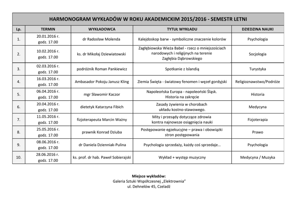 HARMONOGRAM WYKŁADÓW W ROKU AKADEMICKIM 2015/2016 - SEMESTR LETNI Lp. TERMIN WYKŁADOWCA TYTUŁ WYKŁADU DZIEDZINA NAUKI 1. 20.01.2016 r. godz. 17.00 dr Radosław Molenda Kalejdoskop barw - symboliczne znaczenie kolorów Psychologia 2. 10.02.2016 r. godz. 17.00 ks. dr Mikołaj Dziewiatowski Zagłębiowska Wieża Babel - rzecz o mniejszościach narodowych i religijnych na terenie Zagłębia Dąbrowskiego Socjologia 3. 02.03.2016 r. godz. 17.00 podróżnik Roman Pankiewicz Spotkanie z Islandią Turystyka 4. 16.03.2016 r. godz. 17.00 Ambasador Pokoju Janusz Kling Ziemia Święta - światowy fenomen i węzeł gordyjski Religioznawstwo/Podróże 5. 06.04.2016 r. godz. 17.00 mgr Sławomir Kaczor Napoleońska Europa - napoleoński Śląsk. Historia na zakręcie Historia 6. 20.04.2016 r. godz. 17.00 dietetyk Katarzyna Fibich Zasady żywienia w chorobach układu kostno-stawowego. Medycyna 7. 11.05.2016 r. godz. 17.00 fizjoterapeuta Marcin Ważny Mity i przesądy dotyczące zdrowia kontra najnowsze osiągnięcia nauki Fizjoterapia 8. 25.05.2016 r. godz. 17.00 prawnik Konrad Dziuba Postępowanie egzekucyjne – prawa i obowiązki stron postępowania Prawo 9. 08.06.2016 r. godz. 17.00 dr Daniela Dzienniak-Pulina Psychologia sprzedaży, każdy coś sprzedaje… Psychologia 10. 28.06.2016 r. godz. 17.00 ks. prof. dr hab. Paweł Sobierajski Wykład + występ muzyczny Medycyna / Muzyka Miejsce wykładów: Galeria Sztuki Współczesnej „Elektrownia” ul. Dehnelów 45, Czeladź