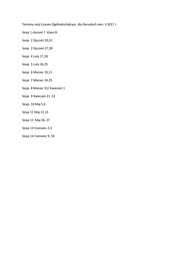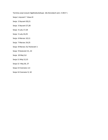 Terminy sesji Liceum Ogólnokształcące dla Dorosłych sem. II 2017 r. Sesja 1 styczeń 7 klasa III Sesja 2 Styczeń 20,21 Sesja 3 Styczeń 27,28 Sesja 4 Luty 17,18 Sesja 5 Luty 24,25 Sesja 6 Marzec 10,11 Sesja 7 Marzec 24,25 Sesja 8 Marzec 31/ Kwiecień 1 Sesja 9 Kwiecień 21, 22 Sesja 10 Maj 5,6 Sesja 11 Maj 12,13 Sesja 12 Maj 26, 27 Sesja 13 Czerwiec 2,3 Sesja 14 Czerwiec 9, 10