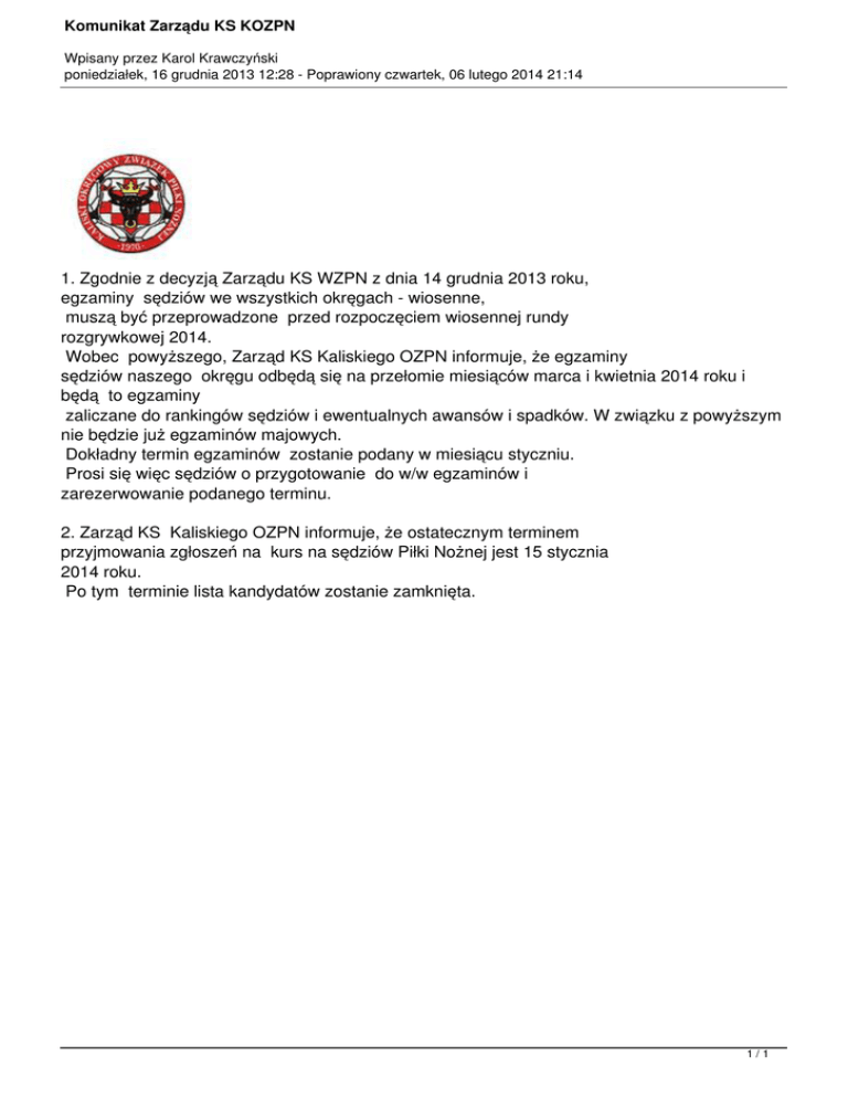 Komunikat Zarządu KS KOZPN Wpisany przez Karol Krawczyński poniedziałek, 16 grudnia 2013 12:28 - Poprawiony czwartek, 06 lutego 2014 21:14 1. Zgodnie z decyzją Zarządu KS WZPN z dnia 14 grudnia 2013 roku, egzaminy sędziów we wszystkich okręgach - wiosenne, muszą być przeprowadzone przed rozpoczęciem wiosennej rundy rozgrywkowej 2014. Wobec powyższego, Zarząd KS Kaliskiego OZPN informuje, że egzaminy sędziów naszego okręgu odbędą się na przełomie miesiąców marca i kwietnia 2014 roku i będą to egzaminy zaliczane do rankingów sędziów i ewentualnych awansów i spadków. W związku z powyższym nie będzie już egzaminów majowych. Dokładny termin egzaminów zostanie podany w miesiącu styczniu. Prosi się więc sędziów o przygotowanie do w/w egzaminów i zarezerwowanie podanego terminu. 2. Zarząd KS Kaliskiego OZPN informuje, że ostatecznym terminem przyjmowania zgłoszeń na kurs na sędziów Piłki Nożnej jest 15 stycznia 2014 roku. Po tym terminie lista kandydatów zostanie zamknięta. 1/1