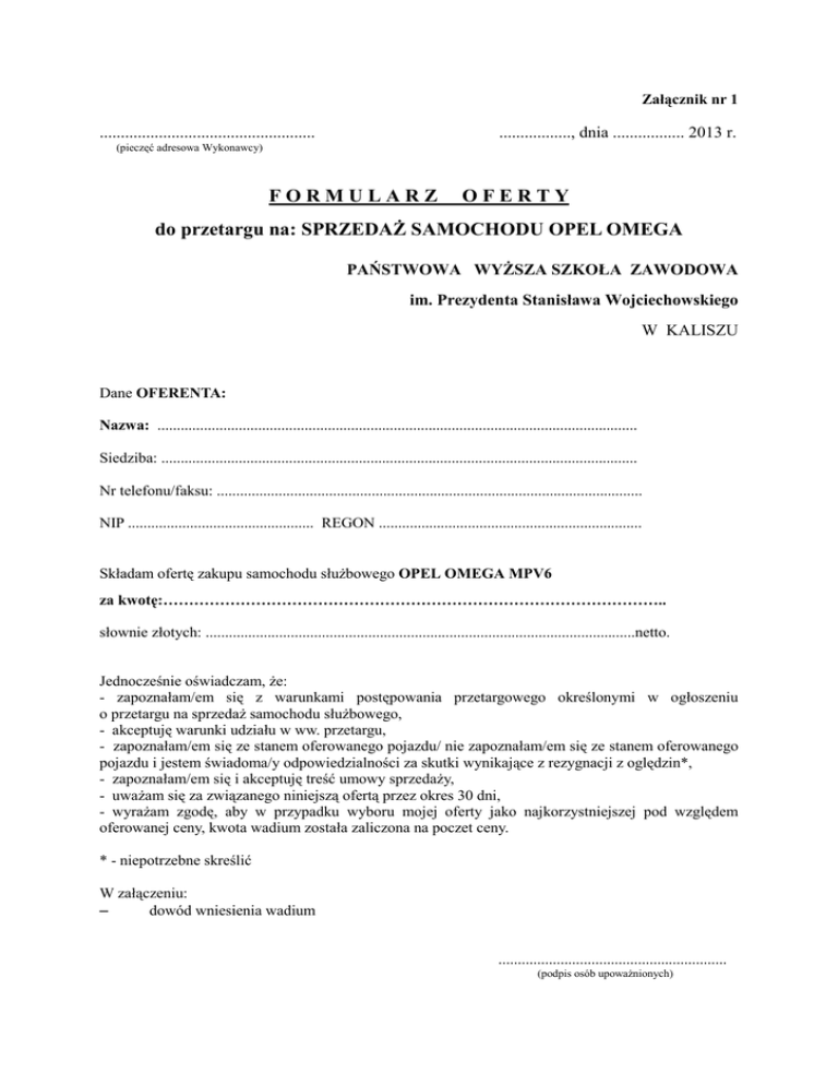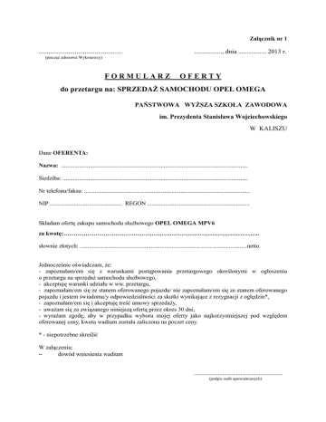 Załącznik nr 1 ................................................... ................., dnia ................. 2013 r. (pieczęć adresowa Wykonawcy) FORMULARZ OFERTY do przetargu na: SPRZEDAŻ SAMOCHODU OPEL OMEGA PAŃSTWOWA WYŻSZA SZKOŁA ZAWODOWA im. Prezydenta Stanisława Wojciechowskiego W KALISZU Dane OFERENTA: Nazwa: ............................................................................................................................ Siedziba: ........................................................................................................................... Nr telefonu/faksu: .............................................................................................................. NIP ................................................ REGON .................................................................... Składam ofertę zakupu samochodu służbowego OPEL OMEGA MPV6 za kwotę:…………………………………………………………………………………….. słownie złotych: ...............................................................................................................netto. Jednocześnie oświadczam, że: - zapoznałam/em się z warunkami postępowania przetargowego określonymi w ogłoszeniu o przetargu na sprzedaż samochodu służbowego, - akceptuję warunki udziału w ww. przetargu, - zapoznałam/em się ze stanem oferowanego pojazdu/ nie zapoznałam/em się ze stanem oferowanego pojazdu i jestem świadoma/y odpowiedzialności za skutki wynikające z rezygnacji z oględzin*, - zapoznałam/em się i akceptuję treść umowy sprzedaży, - uważam się za związanego niniejszą ofertą przez okres 30 dni, - wyrażam zgodę, aby w przypadku wyboru mojej oferty jako najkorzystniejszej pod względem oferowanej ceny, kwota wadium została zaliczona na poczet ceny. * - niepotrzebne skreślić W załączeniu: – dowód wniesienia wadium ........................................................... (podpis osób upoważnionych)