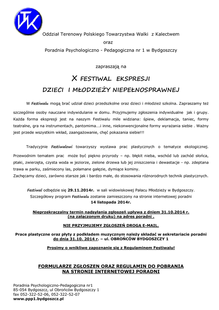 Oddział Terenowy Polskiego Towarzystwa Walki z Kalectwem oraz Poradnia Psychologiczno - Pedagogiczna nr 1 w Bydgoszczy zapraszają na X FESTIWAL EKSPRESJI DZIECI I MŁODZIEŻY NIEPEŁNOSPRAWNEJ W Festiwalu mogą brać udział dzieci przedszkolne oraz dzieci i młodzież szkolna. Zapraszamy też szczególnie osoby nauczane indywidulanie w domu. Przyjmujemy zgłoszenia indywidualne jak i grupy. Każda forma ekspresji jest na naszym Festiwalu mile widziana: śpiew, deklamacja, taniec, formy teatralne, gra na instrumentach, pantomima….i inne, niekonwencjonalne formy wyrażania siebie . Ważny jest przede wszystkim wkład, zaangażowanie, chęć pokazania siebie!!! Tradycyjnie Festiwalowi towarzyszy wystawa prac plastycznych o tematyce ekologicznej. Przewodnim tematem prac może być piękno przyrody – np. błękit nieba, wschód lub zachód słońca, ptaki, zwierzęta, czysta woda w jeziorze, zielone drzewa lub jej zniszczenia i dewastacje - np. zdeptana trawa w parku, zaśmiecony las, połamane gałęzie, dymiące kominy. Zachęcamy dzieci, zarówno starsze jak i bardzo małe, do stosowania różnorodnych technik plastycznych. Festiwal odbędzie się 29.11.2014r. w sali widowiskowej Pałacu Młodzieży w Bydgoszczy. Szczegółowy program Festiwalu zostanie zamieszczony na stronie internetowej poradni 14 listopada 2014r. Nieprzekraczalny termin nadsyłania zgłoszeń upływa z dniem 31.10.2014 r. (na załączonym druku) na adres poradni . NIE PRZYJMUJEMY ZGŁOSZEŃ DROGĄ E-MAIL. Prace plastyczne oraz płyty z podkładem muzycznym należy składać w sekretariacie poradni do dnia 31.10. 2014 r. – ul. OBROŃCÓW BYDGOSZCZY 1 Prosimy o wnikliwe zapoznanie się z Regulaminem Festiwalu! FORMULARZE ZGŁOSZEN ORAZ REGULAMIN DO POBRANIA NA STRONIE INTERNETOWEJ PORADNI Poradnia Psychologiczno-Pedagogiczna nr1 85-054 Bydgoszcz, ul Obrońców Bydgoszczy 1 fax 052-322-52-06, 052-322-52-07 www.ppp1.bydgoszcz.pl Bieżących informacji udzielają: mgr Anna Krawczyk – psycholog (tel. kom. 608-248-960) mgr Ewa Gabruś –Tłoczyńska – pedagog (tel. kom. 604-453-564) Zgłoszenie uczestnictwa w: X FESTIWALU EKSPRESJI DZIECI I MŁODZIEŻY NIEPEŁNOSPRAWNEJ w dniu 29.11.2014r. ( WYSTĘPY SCENICZNE ) Prosimy o wypełnianie zgłoszenia literami drukowanymi !!! ________________________________________________________________________ Imię i nazwisko uczestnika lub nazwa grupy (w przypadku grupy proszę podać imiona i nazwiska uczestników oraz wiek każdego uczestnika) ____________________________________________________________________________ ____________________________________________________________________________ ________________ ___________________ Szkoła Klasa _________________ Wiek __________________________________________________________________________ Imię i nazwisko oraz telefon kontaktowy do opiekuna przygotowującego występ ____________________________________________________________________________ Forma ekspresji (np. teatrzyk, deklamacja, śpiew, pantomima) ____________________________________________________________________________ Krótki opis formy, dokładny tytuł (imię i nazwisko autora lub wykonawcy (w przypadku piosenki), dokładny tytuł) __________________________________________________________________________________________________________________ _______________________________________________ Przewidziana długość występu ____________________________________________________________________________ Rodzaj podkładu muzycznego __________________________________________________________________________ Ilość i rodzaj potrzebnych mikrofonów Płyty z podkładem muzycznym należy składać w sekretariacie poradni do dnia 31.10. 2014 r. – ul. OBROŃCÓW BYDGOSZCZY 1 Akceptuję warunki regulaminu festiwalu __________________________ Podpis opiekuna ucznia Zgłoszenie uczestnictwa w: X FESTIWALU EKSPRESJI DZIECI I MŁODZIEŻY NIEPEŁNOSPRAWNEJ „Konkurs ekologiczny” w dniu 29.11.2014r. (PRACE PLASTCZNE) Prosimy o wypełnianie zgłoszenia literami drukowanymi !!! ________________________________________________________________________ Imię i nazwisko autora pracy (w przypadku grupy proszę podać imiona i nazwiska uczestników oraz wiek każdego uczestnika) ____________________________________________________________________________ ____________________________________________________________________________ ____________________________________________________________________________ ________________ Szkoła ___________________ Klasa _________________ Wiek __________________________________________________________________________ Imię i nazwisko oraz telefon kontaktowy do opiekuna uczniów przygotowujących prace ____________________________________________________________________________ Tytuł pracy Bardzo prosimy o umieszczenie etykiety (imię i nazwisko twórcy, placówka oraz tytuł) na awersie pracy !!! Prace plastyczne należy składać w sekretariacie poradni do dnia 31.10. 2014 r. – ul. OBROŃCÓW BYDGOSZCZY 1 Akceptuję warunki regulaminu festiwalu __________________________ Podpis opiekuna ucznia REGULAMIN X FESTIWALU EKSPRESJI DZIECI I MŁODZIEŻY NIEPEŁNOSPRAWNEJ 1. Festiwal jest przeglądem ekspresji dzieci i młodzieży niepełnosprawnej, który nie przybiera formy konkursu. 2. Uczestnikami festiwalu mogą być dzieci i młodzież niepełnosprawna zamieszkała w Bydgoszczy lub (i) uczęszczająca do bydgoskich placówek oświatowych, Warsztatów Terapii Zajęciowej, stowarzyszeń działających na terenie miasta. 3. Występy sceniczne mogą mieć formę indywidualną lub grupową. 4. Zgłoszenia mogą być dokonywane przez placówki oraz indywidualne przez rodziców lub opiekunów. 5. Zgłoszenie musi być dokonane w formie pisemnej, wyłącznie na formularzu zgłoszeń na adres Poradni w nieprzekraczalnym terminie do 31.10.2014r. 6. Przekroczenie terminu zgłoszenia jest równoznaczne z niezakwalifikowaniem dziecka do udziału w festiwalu. 7.