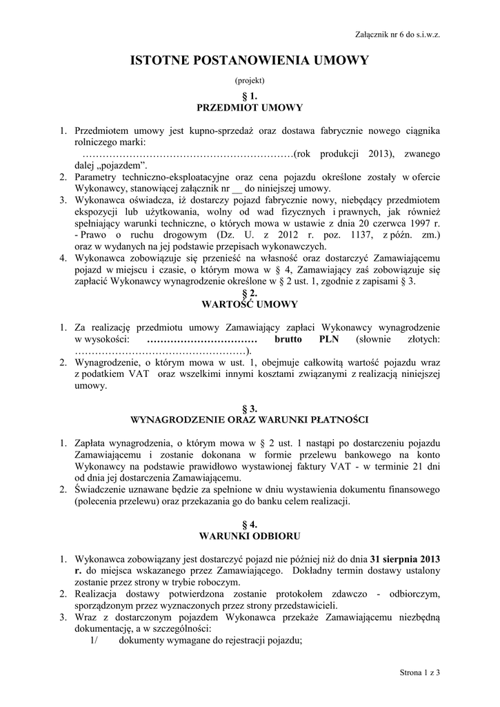 Załącznik nr 6 do s.i.w.z. ISTOTNE POSTANOWIENIA UMOWY (projekt) § 1. PRZEDMIOT UMOWY 1. Przedmiotem umowy jest kupno-sprzedaż oraz dostawa fabrycznie nowego ciągnika rolniczego marki: ………………………………………………………(rok produkcji 2013), zwanego dalej „pojazdem”. 2. Parametry techniczno-eksploatacyjne oraz cena pojazdu określone zostały w ofercie Wykonawcy, stanowiącej załącznik nr __ do niniejszej umowy. 3. Wykonawca oświadcza, iż dostarczy pojazd fabrycznie nowy, niebędący przedmiotem ekspozycji lub użytkowania, wolny od wad fizycznych i prawnych, jak również spełniający warunki techniczne, o których mowa w ustawie z dnia 20 czerwca 1997 r. - Prawo o ruchu drogowym (Dz. U. z 2012 r. poz. 1137, z późn. zm.) oraz w wydanych na jej podstawie przepisach wykonawczych. 4. Wykonawca zobowiązuje się przenieść na własność oraz dostarczyć Zamawiającemu pojazd w miejscu i czasie, o którym mowa w § 4, Zamawiający zaś zobowiązuje się zapłacić Wykonawcy wynagrodzenie określone w § 2 ust. 1, zgodnie z zapisami § 3. § 2. WARTOŚĆ UMOWY 1. Za realizację przedmiotu umowy Zamawiający zapłaci Wykonawcy wynagrodzenie w wysokości: …………………………… brutto PLN (słownie złotych: ……………………………………………). 2. Wynagrodzenie, o którym mowa w ust. 1, obejmuje całkowitą wartość pojazdu wraz z podatkiem VAT oraz wszelkimi innymi kosztami związanymi z realizacją niniejszej umowy. § 3. WYNAGRODZENIE ORAZ WARUNKI PŁATNOŚCI 1. Zapłata wynagrodzenia, o którym mowa w § 2 ust. 1 nastąpi po dostarczeniu pojazdu Zamawiającemu i zostanie dokonana w formie przelewu bankowego na konto Wykonawcy na podstawie prawidłowo wystawionej faktury VAT - w terminie 21 dni od dnia jej dostarczenia Zamawiającemu. 2. Świadczenie uznawane będzie za spełnione w dniu wystawienia dokumentu finansowego (polecenia przelewu) oraz przekazania go do banku celem realizacji. § 4. WARUNKI ODBIORU 1. Wykonawca zobowiązany jest dostarczyć pojazd nie później niż do dnia 31 sierpnia 2013 r. do miejsca wskazanego przez Zamawiającego. Dokładny termin dostawy ustalony zostanie przez strony w trybie roboczym. 2. Realizacja dostawy potwierdzona zostanie protokołem zdawczo - odbiorczym, sporządzonym przez wyznaczonych przez strony przedstawicieli. 3. Wraz z dostarczonym pojazdem Wykonawca przekaże Zamawiającemu niezbędną dokumentację, a w szczególności: 1/ dokumenty wymagane do rejestracji pojazdu; Strona 1 z 3 Załącznik nr 6 do s.i.w.z. 2/ 3/ 4/ 5/ 6/ książki gwarancyjne pojazdu w języku polskim; instrukcję obsługi pojazdu w języku polskim, świadectwo homologacji pojazdu wystawione zgodnie z ustawą Prawo o ruchu drogowym; dokumenty określające zasady świadczenia serwisu gwarancyjnego i pogwarancyjnego; wykaz punktów serwisowych na terenie kraju uprawnionych do napraw gwarancyjnych; § 5. GWARANCJA 1. Zamawiający może realizować uprawnienia z tytułu rękojmi za wady niezależnie od uprawnień wynikających z udzielonej mu gwarancji jakości. 2. Wykonawca udzieli na dostarczony pojazd następujących gwarancji jakości: 1) ___ miesięcznej gwarancji na ciągnik rolniczy oraz wyposażenie; 3. Bieg okresu gwarancji określony w ust. 2 rozpocznie się od dnia odbioru pojazdu i sporządzenia protokołu zdawczo-odbiorczego, o którym mowa w § 4 ust. 2. 4. Wykonawca zapewni w odniesieniu do sprzedanego pojazdu usługi serwisu gwarancyjnego i pogwarancyjnego. 5. Zamawiający zastrzega sobie prawo do montażu w zakupionym pojeździe środków łączności radiowej lub innego wyposażenia służbowego bez utraty gwarancji. 6. Wykonawca zapewni w okresie gwarancji oraz po jej upływie obsługę techniczną zakupionego pojazdu w autoryzowanym serwisie producenta położonym w odległości nieprzekraczającej 100 km od siedziby Zamawiającego, znajdującej się w Brodach przy ul. Kilińskiego 4. 7. Zgłaszanie przez Zamawiającego awarii (usterek) pojazdu następowało będzie w dni robocze, w co najmniej jednej z podanych form: 1) telefonicznie pod nr: ______________, 2) faxem na numer tel.: ______________, 3) e-mailem pod adres: ______________, 4) pisemnie na wskazany w umowie adres Wykonawcy . 8. W okresie gwarancji wszelkie koszty związane z usuwaniem stwierdzonych awarii (usterek) w tym obejmujące dojazd serwisanta oraz wymianę materiałów i części zamiennych (za wyjątkiem materiałów i części eksploatacyjnych podlegających naturalnemu zużyciu) ponosi Wykonawca. 9. Wykonawca zobowiązuje się, że okres naprawy pojazdu w okresie gwarancji nie będzie trwał dłużej niż 5 dni roboczych, licząc od dnia zgłoszenia przez Zamawiającego awarii (usterki) w sposób przewidziany w ust. 7. 10. W przypadku, gdy usunięcie awarii (usterki) w terminie przewidzianym w ust. 9 nie będzie możliwe, np. wobec konieczności sprowadzenia części zamiennych lub podzespołów z zagranicy, strony uzgodnią nowy termin naprawy, który będzie terminem wiążącym. 11. Okresy gwarancji zostaną odpowiednio przedłużone o czas naprawy pojazdu, a w przypadku wymiany jego części składowych lub podzespołów, okresy te zaczną biec od nowa. 12. W przypadku sprzeczności między zapisami w umowie dotyczącymi gwarancji, a warunkami gwarancji określonymi w dokumentach gwarancyjnych, pierwszeństwo mają zapisy zawarte w niniejszej umowie. 13. Za dni robocze, o których mowa w niniejszym paragrafie, uznaje się dni tygodnia od poniedziałku do piątku. Strona 2 z 3 Załącznik nr 6 do s.i.w.z. § 6. KARY UMOWNE I PRAWO ODSTĄPIENIA 1. Niedotrzymanie terminu zapłaty należnego Wykonawcy wynagrodzenia spowoduje naliczenie ustawowych odsetek. 2. W przypadku przekroczenia terminu dostawy określonego w § 4 ust. 1 oraz terminu naprawy wynikającego z § 5 ust. 9 i 10 umowy Wykonawca może być obciążony karą umowną w wysokości 0,1% wynagrodzenia, o którym mowa w § 2 ust. 1 umowy, za każdy dz