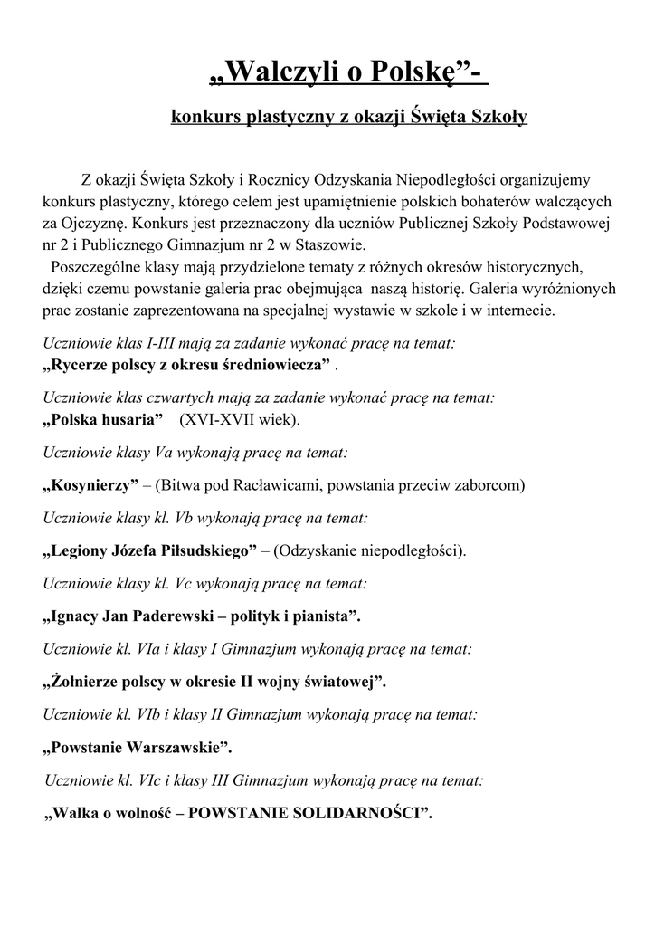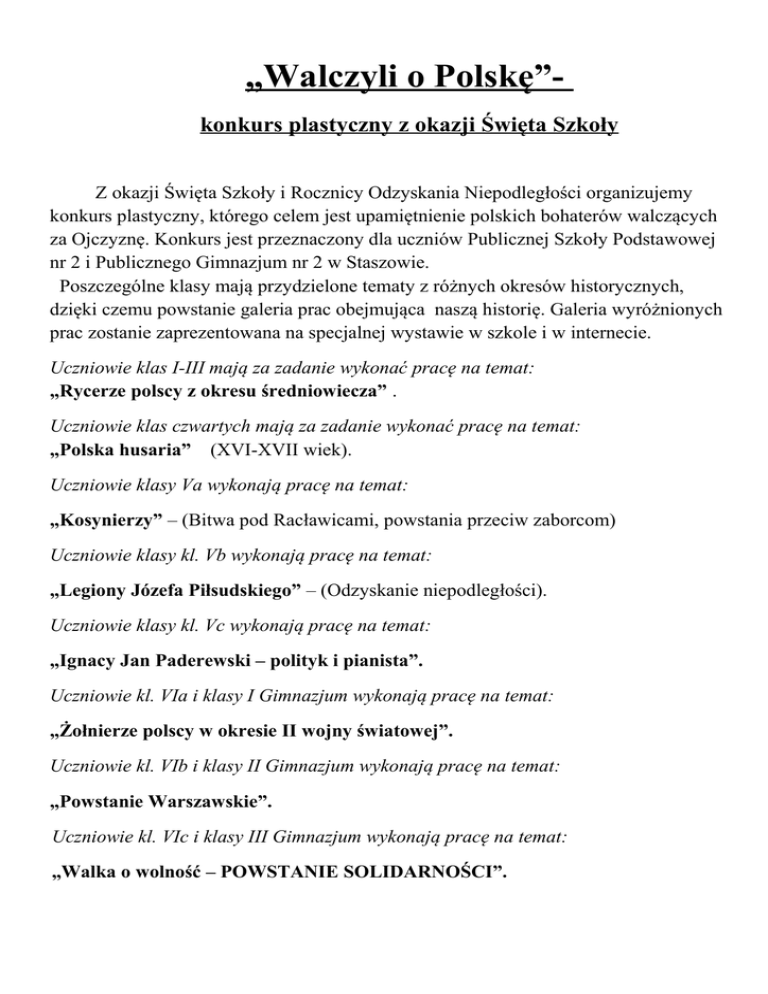 „Walczyli o Polskę”konkurs plastyczny z okazji Święta Szkoły Z okazji Święta Szkoły i Rocznicy Odzyskania Niepodległości organizujemy konkurs plastyczny, którego celem jest upamiętnienie polskich bohaterów walczących za Ojczyznę. Konkurs jest przeznaczony dla uczniów Publicznej Szkoły Podstawowej nr 2 i Publicznego Gimnazjum nr 2 w Staszowie. Poszczególne klasy mają przydzielone tematy z różnych okresów historycznych, dzięki czemu powstanie galeria prac obejmująca naszą historię. Galeria wyróżnionych prac zostanie zaprezentowana na specjalnej wystawie w szkole i w internecie. Uczniowie klas I-III mają za zadanie wykonać pracę na temat: „Rycerze polscy z okresu średniowiecza” . Uczniowie klas czwartych mają za zadanie wykonać pracę na temat: „Polska husaria” (XVI-XVII wiek). Uczniowie klasy Va wykonają pracę na temat: „Kosynierzy” – (Bitwa pod Racławicami, powstania przeciw zaborcom) Uczniowie klasy kl. Vb wykonają pracę na temat: „Legiony Józefa Piłsudskiego” – (Odzyskanie niepodległości). Uczniowie klasy kl. Vc wykonają pracę na temat: „Ignacy Jan Paderewski – polityk i pianista”. Uczniowie kl. VIa i klasy I Gimnazjum wykonają pracę na temat: „Żołnierze polscy w okresie II wojny światowej”. Uczniowie kl. VIb i klasy II Gimnazjum wykonają pracę na temat: „Powstanie Warszawskie”. Uczniowie kl. VIc i klasy III Gimnazjum wykonają pracę na temat: „Walka o wolność – POWSTANIE SOLIDARNOŚCI”. Cele konkursu plastycznego : 1. Poszerzanie wiedzy o historii Polski. 2. Zachęcenie uczniów do samodzielnego poszukiwania informacji. 3. Wykazanie się inwencją twórczą i doskonalenie umiejętności warsztatowych. 4. Wychowanie dzieci i młodzieży przez sztukę i dla sztuki. 5. Prezentacja dorobku dzieci i młodzieży. Komisja konkursowa oceniać będzie: zgodność z tematyką, estetykę pracy i oryginalność. Regulamin konkursu 1. Uczestnicy konkursu mają za zadanie wykonać pracę plastyczną na podany temat. 2. Każdy uczestnik może przekazać tylko jedną pracę. Praca może być indywidualna lub zbiorowa (np. klasowa). 3. Praca plastyczna może być wykonana techniką dowolną. 4. Format prac: A3 (297x420) 5. Dopuszcza się układ pracy pionowy lub poziomy. 6. Prace należy składać w bibliotece szkolnej do dnia 31.10.2014 r. (piątek). 8. Jury dokona selekcji prac i wyłoni zwycięzców. 9. Konkurs zakończy wystawa pokonkursowa. Prace będą zaprezentowane na terenie naszej szkoły i w internetowym `wydaniu „Gazety Szkolnej”. 10. Laureaci zostaną nagrodzeni dn. 10.11.2014r. podczas obchodów Święta Szkoły. 11. Autorzy wyróżnionych prac otrzymają oceny celujące z plastyki, pamiątkowe dyplomy i nagrody książkowe. Wszystkim twórcom życzymy natchnienia i sukcesów!!!