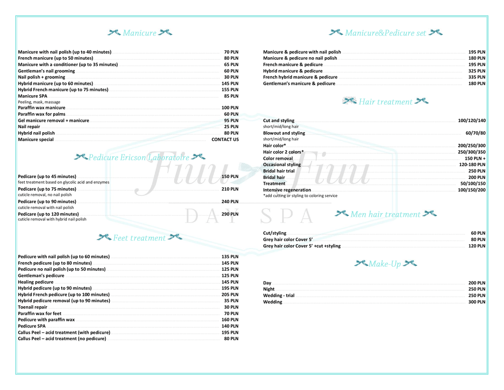 Manicure with nail polish (up to 40 minutes)……..………………………………………………………………………… 70 PLN French manicure (up to 50 minutes)……..…..………………………………………………………………………………….. 80 PLN Manicure with a conditioner (up to 35 minutes)……..……………………………………………………………………. 65 PLN Gentleman’s nail grooming…………..………………………………………………………………………………………………. 60 PLN Nail polish + grooming …………….……………………………………………………………………………………………………. 30 PLN Hybrid manicure (up to 60 minutes)…………………….……………………………………..………………………………… 145 PLN Hybrid French manicure (up to 75 minutes)………………….………………………………………………………………. 155 PLN Manicure SPA………………………………………………………………………………………………………………………….……. 85 PLN Manicure & pedicure with nail polish …………………………………………………..………………………………………. Manicure & pedicure no nail polish…...……………………………………………..………………………………………….. French manicure & pedicure……………………………………..………………………………………………………………….. Hybrid manicure & pedicure……………………..………………………………………………………………………………… French hybrid manicure & pedicure ……………….....………………………………………………………………………. Gentleman’s manicure & pedicure……..………………………………………………………………………………………. 195 PLN 180 PLN 195 PLN 325 PLN 335 PLN 180 PLN Peeling, mask, massage Paraffin wax manicure…………………………………………………………………………………………..………………………. 100 PLN Paraffin wax for palms………….……………………………………………………………………………………………………….. 60 PLN Gel manicure removal + manicure…………………………………………………………………………………………………. 95 PLN Nail repair ……………….……………………………………………………………………………………………………………………. 25 PLN Hybrid nail polish …………..….………………………………………………………………………………………………………….. 80 PLN Manicure special …………………………………………………………………………………………………………..……. CONTACT US Cut and styling………..………………..…………………………………..…………………………………..…………………… 100/120/140 short/mid/long hair Blowout and styling……………………………………………………..…………………………………………………………….. 60/70/80 short/mid/long hair Pedicare (up to 75 minutes) …………………………………………………………………………………………………………. 210 PLN Hair color*…………………………..…………………………………..…………………………………..………………………… 200/250/300 Hair color 2 colors*…………………………..…………………………………..…………………………………..…………… 250/300/350 Color removal…………………………..…………………………………..……………………………………..……………………. 150 PLN + Occasional styling…………………………..…………………………………..…………………………………..……………… 120-180 PLN Bridal hair trial…………………………..…………………………………..…………………………………..…………………………. 250 PLN Bridal hair ………………………………………………………………………………………….………………………..………………… 200 PLN Treatment…………………………..…………………………………..……………………………….……………..……………… 50/100/150 …………………..…… Intensive regeneration…………………………..…………………………………..…………………………………..……… 100/150/200 cuticle removal, no nail polish *add cutting or styling to coloring service Pedicare (up to 45 minutes) …………………………………………………………………………………………………………. 150 PLN feet treatment based on glycolic acid and enzymes Pedicare (up to 90 minutes) …………………………………………………………………………………………………………. 240 PLN cuticle removal with nail polish Pedicare (up to 120 minutes) ……………………………………………………………………………………..………………… 290 PLN cuticle removal with hybrid nail polish Cut/styling…………………………..…………………………………..…………………………………..……………………………..… 60 PLN …..……… Grey hair color Cover 5’…………………..…………………………..…………….…………………………………
