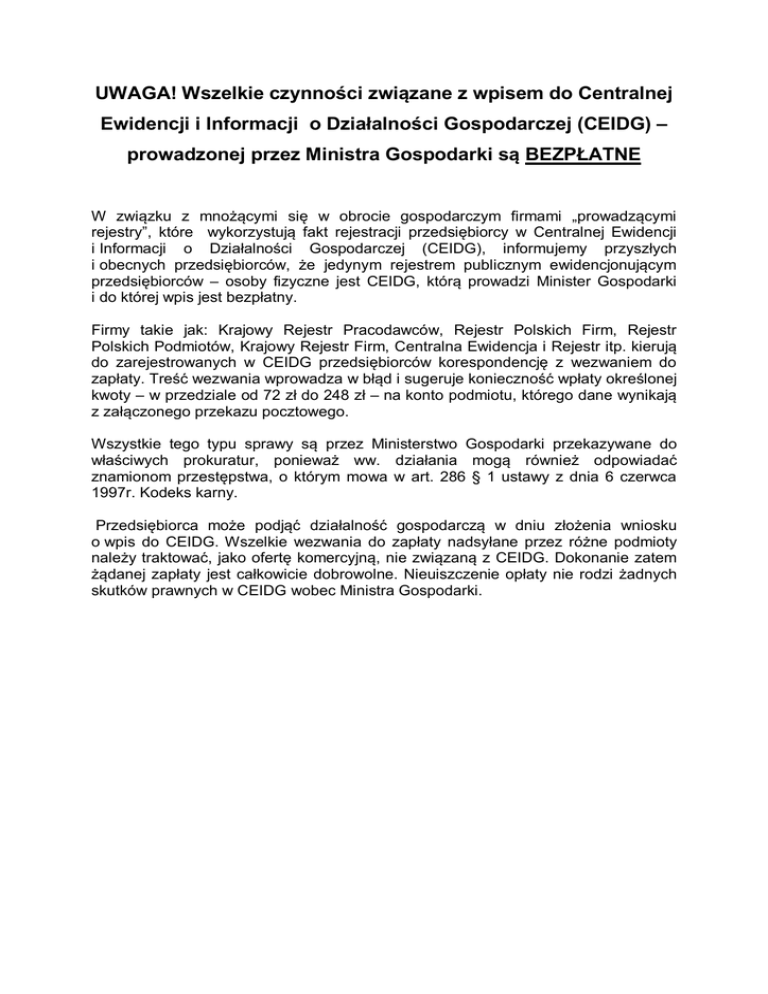 UWAGA! Wszelkie czynności związane z wpisem do Centralnej Ewidencji i Informacji o Działalności Gospodarczej (CEIDG) – prowadzonej przez Ministra Gospodarki są BEZPŁATNE W związku z mnożącymi się w obrocie gospodarczym firmami „prowadzącymi rejestry”, które wykorzystują fakt rejestracji przedsiębiorcy w Centralnej Ewidencji i Informacji o Działalności Gospodarczej (CEIDG), informujemy przyszłych i obecnych przedsiębiorców, że jedynym rejestrem publicznym ewidencjonującym przedsiębiorców – osoby fizyczne jest CEIDG, którą prowadzi Minister Gospodarki i do której wpis jest bezpłatny. Firmy takie jak: Krajowy Rejestr Pracodawców, Rejestr Polskich Firm, Rejestr Polskich Podmiotów, Krajowy Rejestr Firm, Centralna Ewidencja i Rejestr itp. kierują do zarejestrowanych w CEIDG przedsiębiorców korespondencję z wezwaniem do zapłaty. Treść wezwania wprowadza w błąd i sugeruje konieczność wpłaty określonej kwoty – w przedziale od 72 zł do 248 zł – na konto podmiotu, którego dane wynikają z załączonego przekazu pocztowego. Wszystkie tego typu sprawy są przez Ministerstwo Gospodarki przekazywane do właściwych prokuratur, ponieważ ww. działania mogą również odpowiadać znamionom przestępstwa, o którym mowa w art. 286 § 1 ustawy z dnia 6 czerwca 1997r. Kodeks karny. Przedsiębiorca może podjąć działalność gospodarczą w dniu złożenia wniosku o wpis do CEIDG. Wszelkie wezwania do zapłaty nadsyłane przez różne podmioty należy traktować, jako ofertę komercyjną, nie związaną z CEIDG. Dokonanie zatem żądanej zapłaty jest całkowicie dobrowolne. Nieuiszczenie opłaty nie rodzi żadnych skutków prawnych w CEIDG wobec Ministra Gospodarki.
