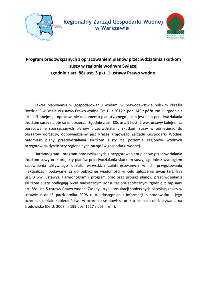 Regionalny Zarząd Gospodarki Wodnej w Warszawie Program prac związanych z opracowaniem planów przeciwdziałania skutkom suszy w regionie wodnym Świeżej zgodnie z art. 88s ust. 3 pkt. 1 ustawy Prawo wodne. Zakres planowania w gospodarowaniu wodami w prawodawstwie polskim określa Rozdział 3 w Dziale VI ustawy Prawo wodne (Dz. U. z 2012 r. poz. 145 z późn. zm.), i zgodnie z art. 113 obejmuje opracowanie dokumentu planistycznego jakim jest plan przeciwdziałania skutkom suszy na obszarze dorzecza. Zgodnie z art. 88s ust. 1 i ust. 2 ww. ustawy kolejno, za opracowanie sporządzanych planów przeciwdziałania skutkom suszy w odniesieniu do obszarów dorzeczy, odpowiedzialny jest Prezes Krajowego Zarządu Gospodarki Wodnej natomiast plany przeciwdziałania skutkom suszy na poziomie regionów wodnych przygotowują dyrektorzy regionalnych zarządów gospodarki wodnej. Harmonogram i program prac związanych z przygotowaniem planów przeciwdziałania skutkom suszy oraz projekty planów przeciwdziałania skutkom suszy, zgodnie z wymogiem zapewnienia aktywnego udziału wszystkich zainteresowanych w ich przygotowaniu i aktualizacji podawane są do publicznej wiadomości w celu zgłoszenia uwag (art. 88s ust. 3 ww. ustawy). Harmonogram i program prac oraz projekt planów przeciwdziałania skutkom suszy podlegają 6-cio miesięcznym konsultacjom społecznym zgodnie z zapisami art. 88s ust. 5 ustawy Prawo wodne. Zasady i tryb konsultacji społecznych określają zapisy w ustawie z dnia3 października 2008 r. o udostępnianiu informacji o środowisku i jego ochronie, udziale społeczeństwa w ochronie środowiska oraz o ocenach oddziaływania na środowisko (Dz.U. 2008 nr 199 poz. 1227 z późn. zm.). Regionalny Zarząd Gospodarki Wodnej W Warszawie ZADANIE I Harmonogram i program prac związanych ze sporządzaniem planów przeciwdziałania skutkom suszy w regionie wodnym 01.05-31.12.2014 Podzadania: 1. Opracowanie harmonogramu i programu prac Dla obszaru regionu wodnego Świeżej został opracowany harmonogram i program prac związanych z przygotowaniem planów przeciwdziałania skutkom suszy w regionie wodnym Świeżej zgodnie z art. 88s ust. 3 pkt. 1 ustawy Prawo wodne. Zakres programu prac wynika z art. 88r oraz art. 88s ustawy Prawo wodne. 2. Proces konsultacji społecznych harmonogramu i programu prac: RZGW w Warszawie na podstawie art. 88s ust. 3 pkt 1 prowadzi konsultacje społeczne harmonogramu i programu prac związanych z przygotowaniem planów przeciwdziałania skutkom suszy. Harmonogram i program prac będą podlega 6-cio miesięcznym konsultacjom społecznym zgodnie z zapisami art. 88s ust. 5 ustawy Prawo wodne. Tryb i zasady podania do publicznej wiadomości informacji o rozpoczęciu konsultacji określają zapisy ustawy z dnia 3 października 2008 r. o udostępnianiu informacji o środowisku i jego ochronie, udziale społeczeństwa w ochronie środowiska oraz o ocenach oddziaływania na środowisko. Harmonogram i program prac został również ogłoszony na stronie RZGW w Warszawie. Podczas procesu konsultacji społecznych będą prowadzone spotkania konsultacyjne na terenie regionu wodnego Świeżej. a. Ogłoszenie rozpoczęcia 6-cio miesięcznych konsultacji społecznych harmonogramu i programu prac Podanie do publicznej wiadomości informacji o rozpoczęciu 6-cio miesięcznych konsultacji społecznych harmonogramu i programu prac jest przeprowadzone zgodnie z art. 88s ust. 3-5 ustawy Prawo wodne w trybie określonym w art. 39 ustawy z dnia 3 października 2008 r. o udostępnianiu informacji o środowisku i jego ochronie, udziale społeczeństwa w ochronie środowiska oraz o ocenach oddziaływania na środowisko. Podanie informacji do publicznej wiadomości zostało przeprowadzone poprzez udostępnienie wiadomości na stronie Biuletynu Informacji Publicznej, ogłoszenie informacji w sposób zwyczajowo przyjęty w siedzibie RZGW w Warszawie oraz na stronie internetowej RZGW w Warszawie. Ponadto zawiadomienia o konsultacjach społecznych zostały przekazane do właściwych jednostek administracji samorządowej i rządowej z prośbą o udostępnienie ich w sposób zwyczajowo przyjęty. –2– Regionalny Zarząd Gospodarki Wodnej W Warszawie b. Zgłaszanie uwag i wniosków do harmonogramu i programu prac Zgłaszanie uwag i wniosków do harmonogramu i programu prac związanych z przygotowaniem planów przeciwdziałania skutkom suszy w regionie wodnym Świeżej, możliwe jest od dnia ogłoszenia rozpoczęcia konsultacji społecznych do daty ich zakończenia. Uwagi i wnioski wniesione po dacie zakończenia konsultacji społecznych nie zostaną uwzględnione. Formularz zbierania uwag został udostępniony na stronie internetowej RZGW w Warszawie (www.warszawa.rzgw.gov.pl) w zakładce Konsultacje społeczne/Susza. Formularz stanowi Załącznik do Obwieszczenia Dyrektora Regionalnego Zarządu Gospodarki Wodnej w Warszawie o sporządzeniu projektu harmonogramu i programu prac związanych z przygotowaniem planu przeciwdziałania skutkom suszy w regionie wodnym Świeżej. Uwagi będą także zbierane podczas spotkań konsultacyjnych. c. Analiza zgłoszonych uwag podczas konsultacji społecznych Po zakończeniu okresu zgłaszania uwag i wniosków do harmonogramu i programu prac związanych z przygotowaniem planów przeciwdziałania skutkom suszy w regionie wodnym Świeżej zostanie przeprowadzona ich analiza. Analiza obejmie wszystkie zgłoszone w terminie uwagi i wnioski, w myśl art. 41 ustawy o udostępnianiu informacji o środowisku i jego ochronie, udziale społeczeństwa w ochronie środowiska oraz o ocenach oddziaływania na środowisko, uwagi lub wnioski złożone po terminie zakończenia konsultacji społecznych nie będą uwzględniane. RZGW w Warszawie rozpatrzy wszystkie zgłoszone w terminie uwagi i wnioski do harmonogramu i programu prac; przyjmie wnioski i uwagi wymagające uwzględnienia w opracowaniu ostatecznej wersji harmonogramu i planu. Wyniki analizy posłużą do przygo