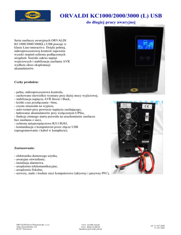 ORVALDI KC1000/2000/3000 (L) USB do długiej pracy awaryjnej Seria zasilaczy awaryjnych ORVALDI KC1000/2000/3000(L) USB pracuje w klasie Line-interactive. Dzięki pełniej, mikroprocesorowej kontroli zapewnia wysoki stopień ochrony podłączonych urządzeń. Szeroki zakres napięć wejściowych i stabilizacja zasilania AVR wydłuża okres eksploatacji akumulatorów. Cechy produktu: - pełna, mikroprocesorowa kontrola, - zachowano niewielkie wymiary przy dużej mocy wyjściowej, - stabilizacja napięcia AVR Boost i Buck, - krótki czas przełączania <6ms, - czysta sinusoida na wyjściu, - auto-restart przy powrocie napięcia zasilającego, - ładowanie akumulatorów przy wyłączonym UPSie, - funkcja zimnego startu pozwala na uruchomienie zasilacza bez zasilania z sieci, - ochrona antyprzepięciowa RJ11/RJ45, - komunikacja z komputerem przez złącze USB (oprogramowanie i kabel w komplecie), Zastosowanie: - elektronika domowego użytku, - awaryjne oświetlenie, - instalacja alarmowa, - urządzenia telekomunikacyjne, - urządzenia fiskalne, - serwery, małe i średnie sieci komputerowe (aktywny i pasywny PFC), ORVALDI Power Protection Sp. z o.o. Aleje Jerozolimskie 123 02-017 Warszawa www. orvaldi.com.pl www. sklep.orvaldi.pl [email protected] tel: 71 347 2820 71 315 1603 Dane techniczne: Model Moc pozorna/moc czynna WEJŚCIE Zakres napięcia Zakres częstotliwości WYJŚCIE Napięcie wyjściowe Stabilizacja napięcia (tryb bateryjny) ORVALDI KC1000 ORVALDI KC2000 ORVALDI KC3000 1000VA/700W 2000VA/1400W 3000VA/2100W 145-280VAC 45~55Hz 230V ±3% Stabilizacja częstotliwości (tryb bateryjny) 50 Hz ±0.1 Hz Czas przełączania <6ms Kształt napięcia (tryb bateryjny) AKUMULATORY Typ i ilość Ładowanie OCHRONA Pełne zabezpieczenie FIZYCZNE Wymiary G x S x W [mm] Waga netto (kg) Gniazda wyjściowe Wilgotność Poziom hałasu ZARZĄDZANIE Port USB ORVALDI Power Protection Sp. z o.o. Aleje Jerozolimskie 123 02-017 Warszawa Pełna sinusoida 12V 2 szt. (24V dc) 12V 4 szt. (48V dc) max 15A 12V 4 szt. (48V dc) Przeciążenie, zwarcie, rozładowanie i przeładowanie 400 x 144 x 217 15 430 x 195 x 346 18 2 szt schuko (okrągłe, uniwersalne) 0-90 % przy 0- 40°C (bez kondensacji) Poniżej 50 dB 20 Oprogramowanie pod Windows 2000/2003/XP/Vista/2008, Windows 7, Windows 8, Linux, Unix i MAC www. orvaldi.com.pl www. sklep.orvaldi.pl [email protected] tel: 71 347 2820 71 315 1603