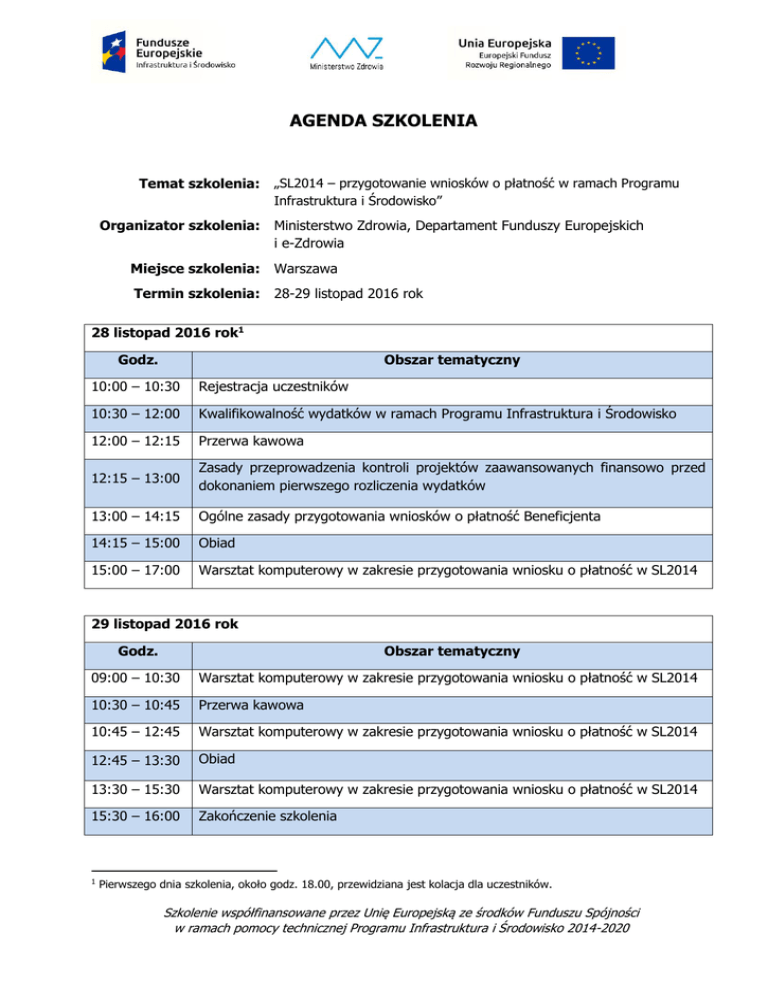 AGENDA SZKOLENIA Temat szkolenia: „SL2014 – przygotowanie wniosków o płatność w ramach Programu Infrastruktura i Środowisko” Organizator szkolenia: Ministerstwo Zdrowia, Departament Funduszy Europejskich i e-Zdrowia Miejsce szkolenia: Warszawa Termin szkolenia: 28-29 listopad 2016 rok 28 listopad 2016 rok1 Godz. Obszar tematyczny 10:00 – 10:30 Rejestracja uczestników 10:30 – 12:00 Kwalifikowalność wydatków w ramach Programu Infrastruktura i Środowisko 12:00 – 12:15 Przerwa kawowa 12:15 – 13:00 Zasady przeprowadzenia kontroli projektów zaawansowanych finansowo przed dokonaniem pierwszego rozliczenia wydatków 13:00 – 14:15 Ogólne zasady przygotowania wniosków o płatność Beneficjenta 14:15 – 15:00 Obiad 15:00 – 17:00 Warsztat komputerowy w zakresie przygotowania wniosku o płatność w SL2014 29 listopad 2016 rok Godz. Obszar tematyczny 09:00 – 10:30 Warsztat komputerowy w zakresie przygotowania wniosku o płatność w SL2014 10:30 – 10:45 Przerwa kawowa 10:45 – 12:45 Warsztat komputerowy w zakresie przygotowania wniosku o płatność w SL2014 12:45 – 13:30 Obiad 13:30 – 15:30 Warsztat komputerowy w zakresie przygotowania wniosku o płatność w SL2014 15:30 – 16:00 Zakończenie szkolenia 1 Pierwszego dnia szkolenia, około godz. 18.00, przewidziana jest kolacja dla uczestników. Szkolenie współfinansowane przez Unię Europejską ze środków Funduszu Spójności w ramach pomocy technicznej Programu Infrastruktura i Środowisko 2014-2020