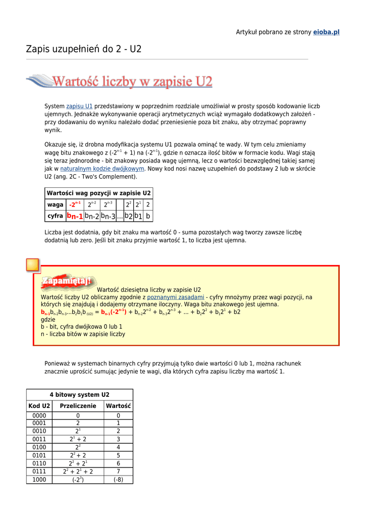 Artykuł pobrano ze strony eioba.pl Zapis uzupełnień do 2 - U2 System zapisu U1 przedstawiony w poprzednim rozdziale umożliwiał w prosty sposób kodowanie liczb ujemnych. Jednakże wykonywanie operacji arytmetycznych wciąż wymagało dodatkowych założeń przy dodawaniu do wyniku należało dodać przeniesienie poza bit znaku, aby otrzymać poprawny wynik. Okazuje się, iż drobna modyfikacja systemu U1 pozwala ominąć te wady. W tym celu zmieniamy wagę bitu znakowego z (-2n-1 + 1) na (-2n-1), gdzie n oznacza ilość bitów w formacie kodu. Wagi stają się teraz jednorodne - bit znakowy posiada wagę ujemną, lecz o wartości bezwzględnej takiej samej jak w naturalnym kodzie dwójkowym. Nowy kod nosi nazwę uzupełnień do podstawy 2 lub w skrócie U2 (ang. 2C - Two's Complement). Wartości wag pozycji w zapisie U2 waga -2n-1 2n-2 2n-3 22 21 2 cyfra bn-1 bn-2 bn-3 ... b2 b1 b Liczba jest dodatnia, gdy bit znaku ma wartość 0 - suma pozostałych wag tworzy zawsze liczbę dodatnią lub zero. Jeśli bit znaku przyjmie wartość 1, to liczba jest ujemna. Wartość dziesiętna liczby w zapisie U2 Wartość liczby U2 obliczamy zgodnie z poznanymi zasadami - cyfry mnożymy przez wagi pozycji, na których się znajdują i dodajemy otrzymane iloczyny. Waga bitu znakowego jest ujemna. n-1 n-2 n-3 2 1 bn-1bn-2bn-3...b2b1b (U2) = bn-1(-2 ) + bn-22 + bn-32 + ... + b22 + b12 + b2 gdzie b - bit, cyfra dwójkowa 0 lub 1 n - liczba bitów w zapisie liczby Ponieważ w systemach binarnych cyfry przyjmują tylko dwie wartości 0 lub 1, można rachunek znacznie uprościć sumując jedynie te wagi, dla których cyfra zapisu liczby ma wartość 1. 4 bitowy system U2 Kod U2 Przeliczenie Wartość 0000 0001 0010 0011 0100 0101 0110 0111 1000 0 2 21 21 + 2 22 22 + 2 22 + 21 2 2 + 21 + 2 (-23) 0 1 2 3 4 5 6 7 (-8) 1001 1010 1011 1100 1101 1110 1111 3 (-2 ) + 2 (-23) + 21 (-23) + 21 + 2 3 2 (-2 ) + 2 3 2 (-2 ) + 2 + 2 (-23) + 22 + 21 (-23) + 22 + 21 + 2 (-7) (-6) (-5) (-4) (-3) (-2) (-1) W tabelce obok zebraliśmy wszystkie możliwe do utworzenia 4-ro bitowe liczby w zapisie U2. Zauważ, iż w przeciwieństwie do poprzednio opisanych systemów ZM i U1 w tym systemie wartość 0 ma tylko jedną reprezentację 0000, a liczb ujemnych jest o 1 więcej niż dodatnich (-8 .. -1, 1 .. 7). Najstarszy bit określa znak liczby. Jeśli jest równy 0, liczba jest dodatnia i resztę zapisu możemy potraktować jak liczbę w naturalnym kodzie dwójkowym. 01101011(U2) = 64 + 32 + 8 + 2 + 1 = 107(10). n-1 Jeśli bit znaku ustawiony jest na 1, to liczba ma wartość ujemną. Bit znaku ma wagę (-2 ), gdzie n oznacza liczbę bitów w wybranym formacie U2. Reszta bitów jest zwykłą liczbą w naturalnym kodzie dwójkowym. Wagę bitu znakowego i wartość pozostałych bitów sumujemy otrzymując wartość liczby U2: 11101011(U2) = (-27) + 64 + 32 + 8 + 2 + 1 = -128 + 107 = (-21)(10). Zwróć uwagę, iż postać ujemna liczby U2 nie jest już tak czytelna dla nas jak w przypadku kodów ZM (tylko zmiana bitu znaku) i U1 (negacja wszystkich bitów). Liczbę przeciwną do danej liczby U2 uzyskujemy na dwa sposoby: Sposób 1 - procedura wyznaczania liczby przeciwnej w kodzie U2 1. Dokonać negacji wszystkich bitów zapisu liczby U2. 2. Do wyniku dodać 1. Wyznaczyć liczbę przeciwną w kodzie U2 do danej liczby 01101110(U2). 1. Dokonujemy negacji (zmianę na wartości przeciwne) wszystkich bitów liczby U2: NOT 01101110 10010001 1. Do wyniku negacji dodajemy 1: 10010001 + 00000001 10010010 Liczbą przeciwną do 01101110(U2) jest 10010010(U2). Aby się o tym przekonać, obliczmy wartości dziesiętne obu liczb: 01101110(U2) = 64 + 32 + 8 + 4 + 2 = 110(10). 10010010(U2) = (-128) + 16 + 2 = (-128) + 18 = (-110)(10). Zwróć uwagę, iż tym sposobem nie da się otrzymać liczby przeciwnej do najmniejszej liczby ujemnej (bit znaku ustawiony na 1, a wszystkie pozostałe bity równe 0). Na przykład dla 4 bitowego kodu U2 otrzymujemy: (-8)(10) = 1000(U2) ; NOT(1000) = 0111; 0111 + 0001 = 1000, a to jest ta sama liczba wyjściowa. Oczywistym wyjaśnieniem tego faktu jest to, iż najmniejsza w danym formacie U2 liczba ujemna nie posiada w tym formacie swojego odpowiednika po stronie dodatniej, gdyż suma wszystkich wag dodatnich jest o 1 mniejsza od modułu wagi ujemnej bitu znakowego. Sposób 2 - procedura wyznaczania liczby przeciwnej w kodzie U2 1. Przejść do pierwszego od prawej strony bitu zapisu liczby. 2. Do wyniku przepisać kolejne bity 0, aż do napotkania bitu o wartości 1, który również przepisać. 3. Wszystkie pozostałe bity przepisać zmieniając ich wartość na przeciwną. Ten drugi sposób jest o wiele prostszy, ponieważ nie wymaga od nas dodawania. Możemy go zastosować prawie bezmyślnie do dowolnie długich liczb U2. Znaleźć liczbę przeciwną w kodzie U2 do danej liczby 1100100010111010111010010100001000000(U2). Bez paniki, pokażemy w kolejnych krokach, jak to zadanie wykonać: 1. Analizę liczby rozpoczynamy ostatniej cyfry zapisu liczby. Przesuwamy się w lewą stronę. Do wyniku przepisujemy wszystkie kolejne bity o wartości 0, aż do napotkania bitu 1. Liczba U2 Liczba przeciwna U2 1100100010111010111010010100001000000 000000 1. Napotkany bit 1 również przepisujemy do wyniku bez zmian: Liczba U2 Liczba przeciwna U2 1100100010111010111010010100001000000 1000000 1. Pozostałe bity przepisujemy zmieniając ich stan na przeciwny. To wszystko. Liczba U2 1100100010111010111010010100001000000 Liczba przeciwna U2 0011011101000101000101101011111000000 Również drugi sposób zawodzi przy wyznaczaniu liczby przeciwnej do najmniejszej liczby ujemnej w danym formacie U2. Dlatego na wartość tę należy zwrócić szczególną uwagę. Dla liczb dodatnich nie ma problemu z przeliczaniem na kod U2. Wystarczy znaleźć reprezentację dwójkową danej wartości liczbowej, a następnie uzupełnić ją bitami 0 do długości formatu kodu U2. Wyznaczyć 8-mio bitowy kod U2 dla liczby dziesiętnej 27(10). 27(10) = 16