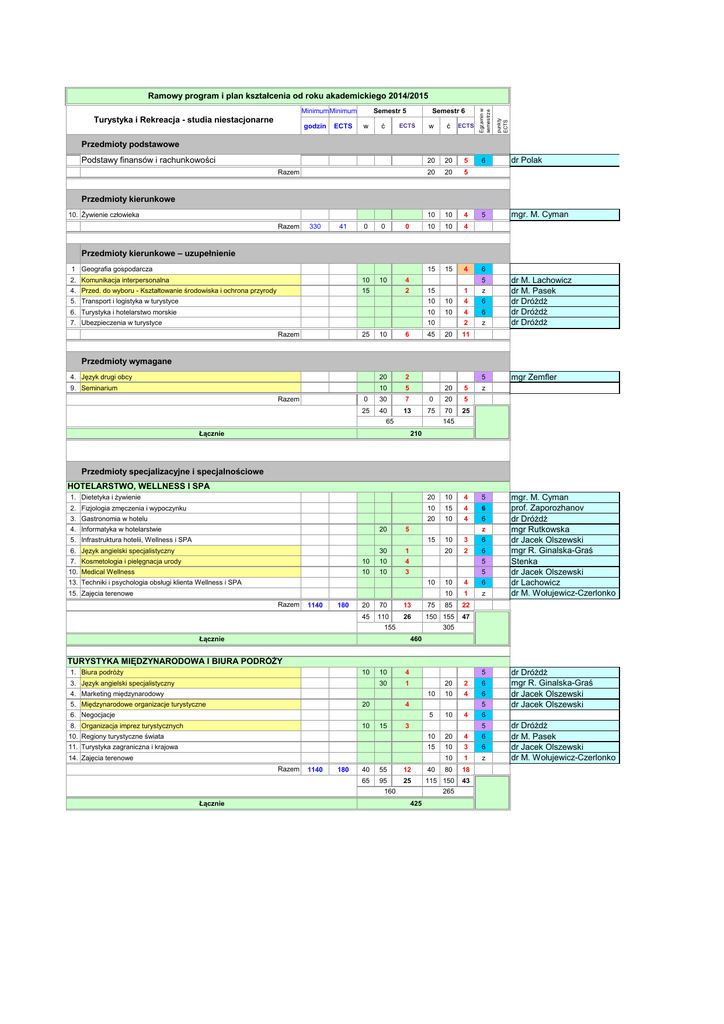 godzin ECTS Semestr 5 w ć Semestr 6 ECTS w ć ECTS punkty ECTS MinimumMinimum Turystyka i Rekreacja - studia niestacjonarne Egzamin w semestrze Ramowy program i plan kształcenia od roku akademickiego 2014/2015 Przedmioty podstawowe Podstawy finansów i rachunkowości Razem 20 20 5 20 20 5 10 10 4 10 10 4 15 15 4 6 dr Polak 5 mgr. M. Cyman Przedmioty kierunkowe 10. Żywienie człowieka Razem 330 41 0 0 0 2. Komunikacja interpersonalna 10 10 4 4. Przed. do wyboru - Kształtowanie środowiska i ochrona przyrody 15 Przedmioty kierunkowe – uzupełnienie 1 Geografia gospodarcza 6 5. Transport i logistyka w turystyce 10 10 4 6 6. Turystyka i hotelarstwo morskie 10 10 4 6 7. Ubezpieczenia w turystyce 10 2 z dr M. Lachowicz dr M. Pasek dr Dróżdż dr Dróżdż dr Dróżdż 5 mgr Zemfler Razem 25 5 2 10 6 4. Język drugi obcy 20 2 9. Seminarium 10 5 15 45 1 z 20 11 20 5 Przedmioty wymagane Razem 0 30 7 0 20 5 25 40 13 75 70 25 65 z 145 Łącznie 210 Przedmioty specjalizacyjne i specjalnościowe HOTELARSTWO, WELLNESS I SPA 1. Dietetyka i żywienie 20 10 4 5 2. Fizjologia zmęczenia i wypoczynku 10 15 4 6 20 10 4 6 15 10 3 6 20 2 6 3. Gastronomia w hotelu 4. Informatyka w hotelarstwie 20 5 z 5. Infrastruktura hotelii, Wellness i SPA 6. Język angielski specjalistyczny 30 1 7. Kosmetologia i pielęgnacja urody 10 10 4 10. Medical Wellness 10 10 3 5 5 13. Techniki i psychologia obsługi klienta Wellness i SPA 10 15. Zajęcia terenowe Razem 1140 180 10 4 6 10 1 z 20 70 13 75 85 22 45 110 26 150 155 47 155 mgr. M. Cyman prof. Zaporozhanov dr Dróżdż mgr Rutkowska dr Jacek Olszewski mgr R. Ginalska-Graś Stenka dr Jacek Olszewski dr Lachowicz dr M. Wołujewicz-Czerlonko 305 Łącznie 460 TURYSTYKA MIĘDZYNARODOWA I BIURA PODRÓŻY 1. Biura podróży 10 3. Język angielski specjalistyczny 10 4 30 1 5 20 2 6 10 10 4 6 5 10 4 10. Regiony turystyczne świata 10 20 4 6 11. Turystyka zagraniczna i krajowa 15 10 3 6 10 1 z 4. Marketing międzynarodowy 5. Międzynarodowe organizacje turystyczne 20 4 5 6. Negocjacje 8. Organizacja imprez turystycznych 10 15 3 Razem 1140 180 40 55 12 40 80 18 65 95 25 115 150 43 160 Łącznie 6 5 14. Zajęcia terenowe 265 425 dr Dróżdż mgr R. Ginalska-Graś dr Jacek Olszewski dr Jacek Olszewski dr Dróżdż dr M. Pasek dr Jacek Olszewski dr M. Wołujewicz-Czerlonko