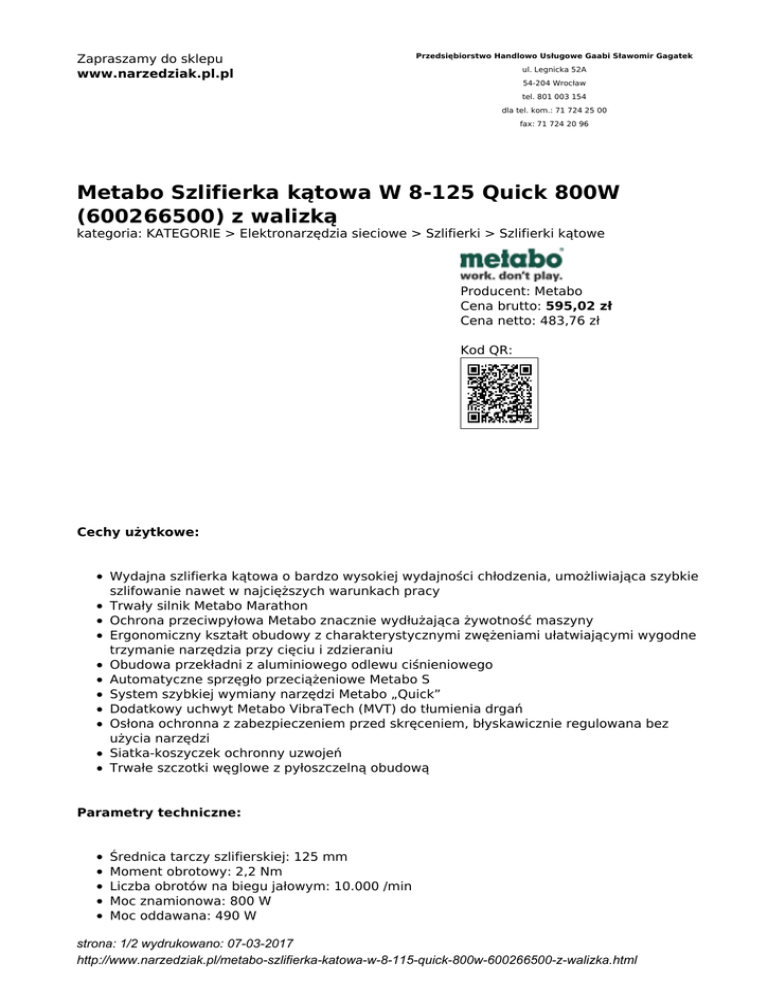 Zapraszamy do sklepu www.narzedziak.pl.pl Przedsiębiorstwo Handlowo Usługowe Gaabi Sławomir Gagatek ul. Legnicka 52A 54-204 Wrocław tel. 801 003 154 dla tel. kom.: 71 724 25 00 fax: 71 724 20 96 Metabo Szlifierka kątowa W 8-125 Quick 800W (600266500) z walizką kategoria: KATEGORIE > Elektronarzędzia sieciowe > Szlifierki > Szlifierki kątowe Producent: Metabo Cena brutto: 595,02 zł Cena netto: 483,76 zł Kod QR: Cechy użytkowe: Wydajna szlifierka kątowa o bardzo wysokiej wydajności chłodzenia, umożliwiająca szybkie szlifowanie nawet w najcięższych warunkach pracy Trwały silnik Metabo Marathon Ochrona przeciwpyłowa Metabo znacznie wydłużająca żywotność maszyny Ergonomiczny kształt obudowy z charakterystycznymi zwężeniami ułatwiającymi wygodne trzymanie narzędzia przy cięciu i zdzieraniu Obudowa przekładni z aluminiowego odlewu ciśnieniowego Automatyczne sprzęgło przeciążeniowe Metabo S System szybkiej wymiany narzędzi Metabo „Quick” Dodatkowy uchwyt Metabo VibraTech (MVT) do tłumienia drgań Osłona ochronna z zabezpieczeniem przed skręceniem, błyskawicznie regulowana bez użycia narzędzi Siatka-koszyczek ochronny uzwojeń Trwałe szczotki węglowe z pyłoszczelną obudową Parametry techniczne: Średnica tarczy szlifierskiej: 125 mm Moment obrotowy: 2,2 Nm Liczba obrotów na biegu jałowym: 10.000 /min Moc znamionowa: 800 W Moc oddawana: 490 W strona: 1/2 wydrukowano: 07-03-2017 http://www.narzedziak.pl/metabo-szlifierka-katowa-w-8-115-quick-800w-600266500-z-walizka.html Liczba obrotów przy obciążeniu: 7.000 /min Gwint wrzeciona: M 14 Ciężar (bez kabla): 1,8 kg Wyposażenie: Osłona Kołnierz podporowy nakrętka mocująca Quick uchwyt Metabo VibraTech (MVT) Walizka narzędziowa z tworzywa sztucznego Gwarancja XXL Elektronarzędzia Metabo słyną z wytrzymałości i niezawodności. A ponieważ tak rzadko zawodzą, Metabo wprowadziło dla Państwa rozszerzoną 3-letnią gwarancję XXL. Jeśli zarejestrują Państwo nasz produkt, standardowa gwarancja zostanie wydłużona do 3 lat strona: 2/2 wydrukowano: 07-03-2017 http://www.narzedziak.pl/metabo-szlifierka-katowa-w-8-115-quick-800w-600266500-z-walizka.html