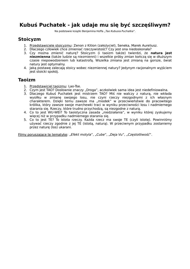 Kubuś Puchatek - jak udaje mu się być szczęśliwym? Na podstawie książki Benjamina Hoffa „Tao Kubusia Puchatka”. Stoicyzm 1. Przedstawiciele stoicyzmu: Zenon z Kition (założyciel), Seneka, Marek Aureliusz. 2. Dlaczego człowiek chce zmieniać rzeczywistość? Czy jest ona niedoskonała? 3. Czy można zmienić naturę? Stoicyzm (i taoizm także) twierdzi, że natura jest niezmienna (także ludzie są niezmienni) i wszelkie próby zmian kończą się w dłuższym czasie niepowodzeniem lub katastrofą. Wszelka zmiana jest zmianą na gorsze, świat natury jest optymalny. 4. Jaką postawę zalecają stoicy wobec niezmiennej natury? Jedynym racjonalnym wyjściem jest stoicki spokój. Taoizm 1. Przedstawiciel taoizmu: Lao-Tse. 2. Czym jest TAO? Dosłownie znaczy „Droga”, aczkolwiek sama idea jest niedefiniowalna. 3. Dlaczego Kubuś Puchatek jest mistrzem TAO? Miś nie walczy z naturą, nie wkłada wysiłku w zmianę swojego losu, nie czyni rzeczy niezgodnymi z ich własnym charakterem. Dzięki temu zawsze ma „miodek” w przeciwieństwie do pracowitego królika, który zawsze swoje marchewki traci w wyniku przeciwności losu i nadmiernego starania się. Rzeczy, które trudno przychodzą, są niezgodne z naturą. 4. Co to jest WU-WEI? To taoistyczna zasada „niedziałania”, w wyniku której zyskujemy więcej niż w przypadku nadmiernego starania się. 5. Co to jest TE? To istota rzeczy. Każda rzecz ma swoje TE (czyli istotę). Powinniśmy używać rzeczy zgodnie z jej TE (istotą, naturą). W przeciwnym przypadku zostaniemy przez naturę (los) ukarani. Filmy poruszające tę tematykę: „Efekt motyla”, „Cube”, „Deja Vu”, „Częstotliwość”.