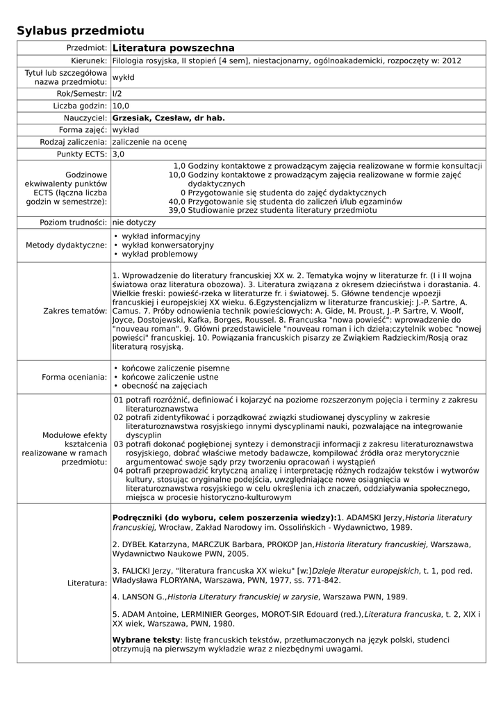 Sylabus przedmiotu Przedmiot: Literatura powszechna Kierunek: Filologia rosyjska, II stopień [4 sem], niestacjonarny, ogólnoakademicki, rozpoczęty w: 2012 Tytuł lub szczegółowa wykłd nazwa przedmiotu: Rok/Semestr: I/2 Liczba godzin: 10,0 Nauczyciel: Grzesiak, Czesław, dr hab. Forma zajęć: wykład Rodzaj zaliczenia: zaliczenie na ocenę Punkty ECTS: 3,0 1,0 Godziny kontaktowe z prowadzącym zajęcia realizowane w formie konsultacji 10,0 Godziny kontaktowe z prowadzącym zajęcia realizowane w formie zajęć dydaktycznych 0 Przygotowanie się studenta do zajęć dydaktycznych 40,0 Przygotowanie się studenta do zaliczeń i/lub egzaminów 39,0 Studiowanie przez studenta literatury przedmiotu Godzinowe ekwiwalenty punktów ECTS (łączna liczba godzin w semestrze): Poziom trudności: nie dotyczy • wykład informacyjny Metody dydaktyczne: • wykład konwersatoryjny • wykład problemowy 1. Wprowadzenie do literatury francuskiej XX w. 2. Tematyka wojny w literaturze fr. (I i II wojna światowa oraz literatura obozowa). 3. Literatura związana z okresem dzieciństwa i dorastania. 4. Wielkie freski: powieść-rzeka w literaturze fr. i światowej. 5. Główne tendencje wpoezji francuskiej i europejskiej XX wieku. 6.Egzystencjalizm w literaturze francuskiej: J.-P. Sartre, A. Zakres tematów: Camus. 7. Próby odnowienia technik powieściowych: A. Gide, M. Proust, J.-P. Sartre, V. Woolf, Joyce, Dostojewski, Kafka, Borges, Roussel. 8. Francuska "nowa powieść": wprowadzenie do "nouveau roman". 9. Główni przedstawiciele "nouveau roman i ich dzieła;czytelnik wobec "nowej powieści" francuskiej. 10. Powiązania francuskich pisarzy ze Zwiąkiem Radzieckim/Rosją oraz literaturą rosyjską. • końcowe zaliczenie pisemne Forma oceniania: • końcowe zaliczenie ustne • obecność na zajęciach Modułowe efekty kształcenia realizowane w ramach przedmiotu: 01 potrafi rozróżnić, definiować i kojarzyć na poziome rozszerzonym pojęcia i terminy z zakresu literaturoznawstwa 02 potrafi zidentyfikować i porządkować związki studiowanej dyscypliny w zakresie literaturoznawstwa rosyjskiego innymi dyscyplinami nauki, pozwalające na integrowanie dyscyplin 03 potrafi dokonać pogłębionej syntezy i demonstracji informacji z zakresu literaturoznawstwa rosyjskiego, dobrać właściwe metody badawcze, kompilować źródła oraz merytorycznie argumentować swoje sądy przy tworzeniu opracowań i wystąpień 04 potrafi przeprowadzić krytyczną analizę i interpretację różnych rodzajów tekstów i wytworów kultury, stosując oryginalne podejścia, uwzględniające nowe osiągnięcia w literaturoznawstwa rosyjskiego w celu określenia ich znaczeń, oddziaływania społecznego, miejsca w procesie historyczno-kulturowym Podręczniki (do wyboru, celem poszerzenia wiedzy):1. ADAMSKI Jerzy, Historia literatury francuskiej, Wrocław, Zakład Narodowy im. Ossolińskich - Wydawnictwo, 1989. 2. DYBEŁ Katarzyna, MARCZUK Barbara, PROKOP Jan,Historia literatury francuskiej, Warszawa, Wydawnictwo Naukowe PWN, 2005. 3. FALICKI Jerzy, "literatura francuska XX wieku" [w:] Dzieje literatur europejskich, t. 1, pod red. Władysława FLORYANA, Warszawa, PWN, 1977, ss. 771-842. Literatura: 4. LANSON G.,Historia Literatury francuskiej w zarysie, Warszawa PWN, 1989. 5. ADAM Antoine, LERMINIER Georges, MOROT-SIR Edouard (red.), Literatura francuska, t. 2, XIX i XX wiek, Warszawa, PWN, 1980. Wybrane teksty: listę francuskich tekstów, przetłumaczonych na język polski, studenci otrzymują na pierwszym wykładzie wraz z niezbędnymi uwagami. Konsultacje: piątek, godzina: 10-12, pokój 413 (Nowa Humanistyka) E-mail (w Instytucie Filologii Romańskiej):[email protected] Dodatkowe informacje: E-mail (domowy):[email protected] Podstawa zaliczenia wykładu: kolokwium ustne z problematyki wykładów oraz analiza wybranego tekstu literackiego (z listy lektur) pod kątem głównych struktur powieściowych (kompozycja, postacie, struktura czasowo-przestrzenna, główne wątki tematyczne). Dodatkowy plus ("+") dla osób mających 100 % obecność na wykładzie.