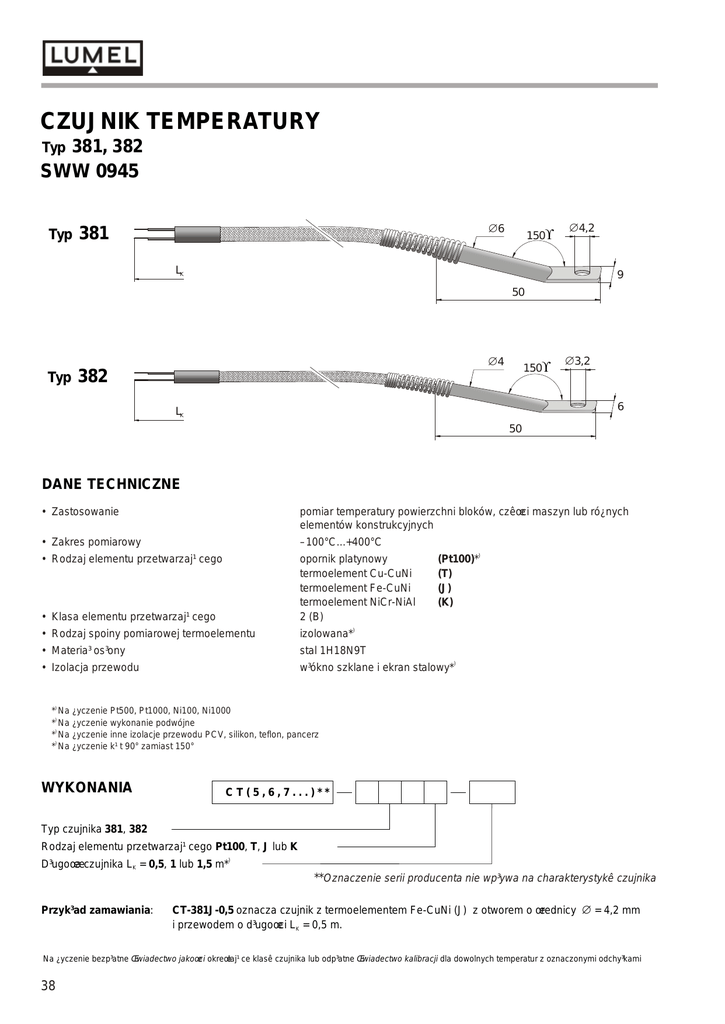 CZUJNIK TEMPERATURY 381, 382 SWW 0945 Typ Typ Æ6 381 150° Æ4,2 LK 9 50 Typ Æ4 382 150° Æ3,2 6 LK 50 DANE TECHNICZNE • Zastosowanie pomiar temperatury powierzchni bloków, czêœci maszyn lub ró¿nych elementów konstrukcyjnych • Zakres pomiarowy –100°C...+400°C • Rodzaj elementu przetwarzaj¹cego • Klasa elementu przetwarzaj¹cego opornik platynowy termoelement Cu-CuNi termoelement Fe-CuNi termoelement NiCr-NiAl 2 (B) • Rodzaj spoiny pomiarowej termoelementu izolowana*) • Materia³ os³ony stal 1H18N9T • Izolacja przewodu w³ókno szklane i ekran stalowy*) (Pt100)*) (T) (J) (K) *) Na ¿yczenie Pt500, Pt1000, Ni100, Ni1000 *) Na ¿yczenie wykonanie podwójne *) Na ¿yczenie inne izolacje przewodu PCV, silikon, teflon, pancerz *) Na ¿yczenie k¹t 90° zamiast 150° WYKONANIA CT(5,6,7...)** Typ czujnika 381, 382 Rodzaj elementu przetwarzaj¹cego Pt100, T, J lub K D³ugoœæ czujnika LK = 0,5, 1 lub 1,5 m*) **Oznaczenie serii producenta nie wp³ywa na charakterystykê czujnika Przyk³ad zamawiania: CT-381J-0,5 oznacza czujnik z termoelementem Fe-CuNi (J) z otworem o œrednicy Æ = 4,2 mm i przewodem o d³ugoœci LK = 0,5 m. Na ¿yczenie bezp³atne Œwiadectwo jakoœci okreœlaj¹ce klasê czujnika lub odp³atne Œwiadectwo kalibracji dla dowolnych temperatur z oznaczonymi odchy³kami 38
