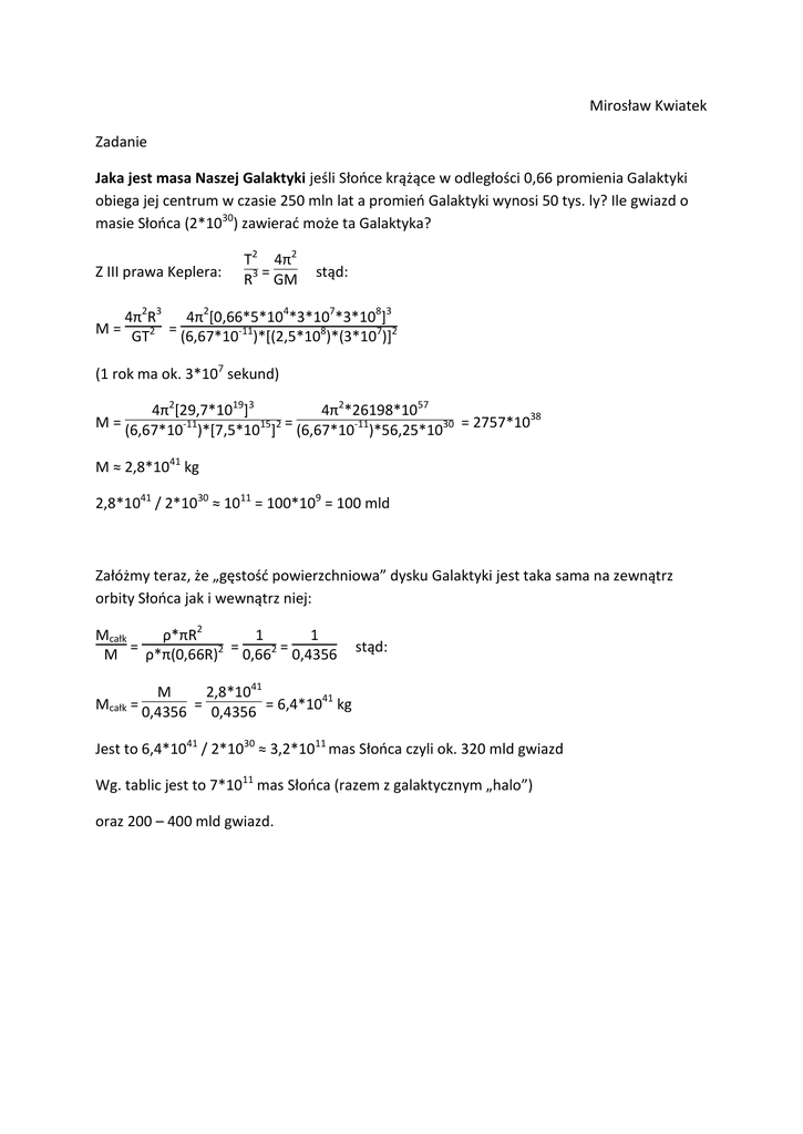Mirosław Kwiatek Zadanie Jaka jest masa Naszej Galaktyki jeśli Słooce krążące w odległości 0,66 promienia Galaktyki obiega jej centrum w czasie 250 mln lat a promieo Galaktyki wynosi 50 tys. ly? Ile gwiazd o masie Słooca (2*1030) zawierad może ta Galaktyka? Z III prawa Keplera: T2 4π2 R3 = GM stąd: 4π2R3 4π2[0,66*5*104*3*107*3*108]3 M = GT2 = (6,67*10-11)*[(2,5*108)*(3*107)]2 (1 rok ma ok. 3*107 sekund) 4π2[29,7*1019]3 4π2*26198*1057 M = (6,67*10-11)*[7,5*1015]2 = (6,67*10-11)*56,25*1030 = 2757*1038 M ≈ 2,8*1041 kg 2,8*1041 / 2*1030 ≈ 1011 = 100*109 = 100 mld Załóżmy teraz, że „gęstośd powierzchniowa” dysku Galaktyki jest taka sama na zewnątrz orbity Słooca jak i wewnątrz niej: Mcałk ρ*πR2 1 1 = 2 = 2= M ρ*π(0,66R) 0,66 0,4356 stąd: M 2,8*1041 Mcałk = 0,4356 = 0,4356 = 6,4*1041 kg Jest to 6,4*1041 / 2*1030 ≈ 3,2*1011 mas Słooca czyli ok. 320 mld gwiazd Wg. tablic jest to 7*1011 mas Słooca (razem z galaktycznym „halo”) oraz 200 – 400 mld gwiazd. Oszacowad promieo Wszechświata przy założeniu, że Wszechświat rozszerza się z km/s prędkością światła a stała Hubble’a wynosi 60 Mpc 1 parsek ≈ 3 lata świetlne więc 1 megaparsek = 3*106 ly 1 rok ma ok. 3*107 sekund Prawo Hubbla: ν = Hr (prędkośd oddalania się galaktyk jest proporcjonalna do odległości ν między nimi ). Stąd: r = H . Jeśli prędkośd będzie maksymalną możliwą to i odległośd będzie c też maksymalną możliwą a więc gdy ν = c to r = R czyli promieo Wszechświata Rx = H Rx = 300000 60 Mpc = 5000 Mpc = 5 Gpc = 5G(3ly) = 15Gly = 15 mld lat świetlnych. Stąd wynika i wiek Wszechświata – tablicowy = 13,7 mld lat Aby podad w metrach można podstawid H w Hz: 2,2*10-18 [1/s]. Wtedy R = 1,36*1026 m (w tablicach: 1,2*1026 a stała Hubbla = 72 ) Oszacowad ile galaktyk podobnych do Naszej Galaktyki zawiera Wszechświat? Średnia gęstośd Wszechświata wynosi 9,5*10-27 kg/m3 (kilka nukleonów w 1 m3). Najdalsze galaktyki są odległe o 13 mld ly (Obliczony wiek Wszechświata to 13,7 lat). Obliczona masa Naszej Galaktyki wynosi 6,4*1041 kg. Masa Wszechświata M = ρ*(4/3)πR3 ≈ 4ρR3 = 4*(9,5*10-27)*[(13*109)(3*107)(3*108)]3 M = 38*10-27*[117*1024]3 = 3,8*10-26*[1,17*1026]3 = 3,8*1,6*[1026]2 M = 6,1*1052 kg (byłoby 6,4 bez wcześniejszego przybliżenia π=3) 6,1*1052 / 6,4*1041 ≈ 1011 Galaktyk czyli 100 mld (Tablice podają tylko, taki właśnie, rząd wielkości liczby galaktyk „dużych”) Tak więc liczba gwiazd we Wszechświecie: 100mld*(200-400)mld Oszacowad ile nukleonów zawiera Wszechświat Średnia gęstośd Wszechświata wynosi 9,5*10-27 kg/m3. Masa protonu (≈ neutronu) wynosi 1,67*10-27 kg. Obliczony promieo Wszechświata: 1,2*1026 m. W 1 m3 zawiera się więc 9,5*10-27 / 1,67*10-27 = 5,7 nukleonów Objętośd Wszechświata ≈ R3 tak więc liczba nukleonów: R3/5,7 = (1,2*1026)3/5,7 = (1,23/5,7)*1078 = 3*10-1*1078 = 3*1077 (tablice: rzędu 1077)