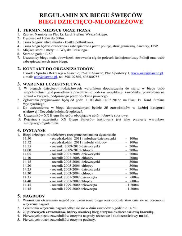 REGULAMIN XX BIEGU ŚWIĘCÓW BIEGI DZIECIĘCO-MŁODZIEŻOWE 1. TERMIN, MIEJSCE ORAZ TRASA 1. 2. 3. 4. 5. 6. 7. Zapisy: Namioty na Plac ks. kard. Stefana Wyszyńskiego. Dystanse od 100m do 600m. Trasa biegów: ulice miasta - kostka polbrukowa. Trasa biegu będzie oznaczona i zabezpieczona przez policję, straż graniczną, harcerzy, OSP. Miejsce startu i mety: ul. Wojska Polskiego. Start od godz. 13.50 Uczestnicy biegu mają obowiązek stosowania się do poleceń funkcjonariuszy Policji oraz osób zabezpieczających trasę biegu. 2. KONTAKT DO ORGANIZATORÓW Ośrodek Sportu i Rekreacji w Sławnie, 76-100 Sławno, Plac Sportowy 1, [email protected]. e-mail: [email protected], tel. 598107565, 603380753 3. WARUNKI UCZESTNICTWA 1. W biegach dziecięco-młodzieżowych warunkiem dopuszczenia do startu w biegu osób niepełnoletnich jest posiadanie i przedłożenie podczas weryfikacji zawodnika, pozwolenia na udział w biegach, podpisanego przez opiekuna prawnego. 2. Zgłoszenia przyjmowane będą od godz. 11.00 dnia 14.05.2016r. na Placu ks. Kard. Stefana Wyszyńskiego. 3. Do uczestnictwa w biegu dopuszczonych będzie 35 zawodników w każdej kategorii wiekowej! Decyduje kolejność zgłoszeń. 4. Uczestników XX Biegu Święców obowiązuje ubiór i obuwie sportowe. 5. Rejestracja uczestnika XX Biegu Święców traktowana jest jako przyjęcie warunków niniejszego regulaminu. 4. DYSTANSE 1. Biegi dziecięco-młodzieżowe rozegrane zostaną na dystansach: 13.50 - przedszkolaki 2011 i młodsze dziewczynki 13.52 - przedszkolaki 2011 i młodsi chłopcy 13.55 - rocznik 2009-2010 dziewczynki 14.00 - rocznik 2009-2010 chłopcy 14.05 - rocznik 2007-2008 dziewczynki 14.10 - rocznik 2007-2008 chłopcy 14.15 - rocznik 2005-2006 dziewczynki 14.20 - rocznik 2005-2006 chłopcy 14.25 - rocznik 2003-2004 dziewczynki 14.30 - rocznik 2003-2004 chłopcy 14.35 - rocznik 2001-2002 dziewczęta 14.40 - rocznik 2001-2002 chłopcy 14.45 - rocznik 1999-2000 dziewczęta 14.45 - rocznik 1999-2000 dziewczęta 5. NAGRODY - 100m - 100m - 200m - 200m - 200m - 200m - 300m - 300m - 300m - 300m - 600m - 600m - 1.200m - 1.200m 1. Warunkiem otrzymania nagród jest ukończenie biegu oraz osobiste stawienie się na ceremonii wręczenia nagród. 2. Ceremonia wręczenia nagród odbędzie się w dniu zawodów o godzinie 14.50. 3. 20 pierwszych zawodników, którzy ukończą bieg otrzyma okolicznościową koszulkę. 4. Pierwszych pięciu zawodników otrzyma nagrody rzeczowe i okolicznościowy medal. 5. Pierwszych trzech zawodników otrzyma puchary. 6. POSTANOWIENIA KOŃCOWE 1. 2. 3. 4. 5. 6. 7. 8. 9. 10. 11. 12. 13. W ramach zawodów organizowanych w dniu 14.05.2016r. odbywać się będą imprezy towarzyszące o rekreacyjnym. XX Bieg Święców odbędzie się bez względu na pogodę. Wszyscy uczestnicy XX Biegu Święców zobowiązani są do przestrzegania niniejszego regulaminu. Podczas trwania biegu wszyscy uczestnicy powinni stosować się do poleceń osób odpowiedzialnych za bezpieczeństwo, sędziów i osób działających w imieniu organizatora. Organizator zapewnia opiekę medyczną w trakcie trwania zawodów. Każdy zawodnik jest ubezpieczony od następstw nieszczęśliwych wypadków. Numer startowy zawodnika winien być przypięty na klatce piersiowej pod rygorem dyskwalifikacji. Zasłanianie numeru startowego grozi dyskwalifikacją. Nieprzestrzeganie zasad określonych w niniejszym regulaminie może być powodem dyskwalifikacji zawodnika. Organizator XX Biegu Święców uznaje, że zgłaszający (opiekun prawny) zapoznał się z niniejszym regulaminem i zobowiązuje się do jego przestrzegania. Zgłaszający (opiekun prawny) wyraża zgodę na przetwarzanie danych osobowych dziecka dla potrzeb organizacji XX Biegu Święców, a także wyrażają zgodę na wykorzystanie ich wizerunku w materiałach informacyjnych i promocyjnych. Interpretacja niniejszego regulaminu należy do organizatora XX Biegu Święców. Dyrektorem biegu jest Krzysztof Kowalczyk - dyrektor Ośrodka Sportu i Rekreacji w Sławnie. Kontakt: e-mail: [email protected], tel. 603380753