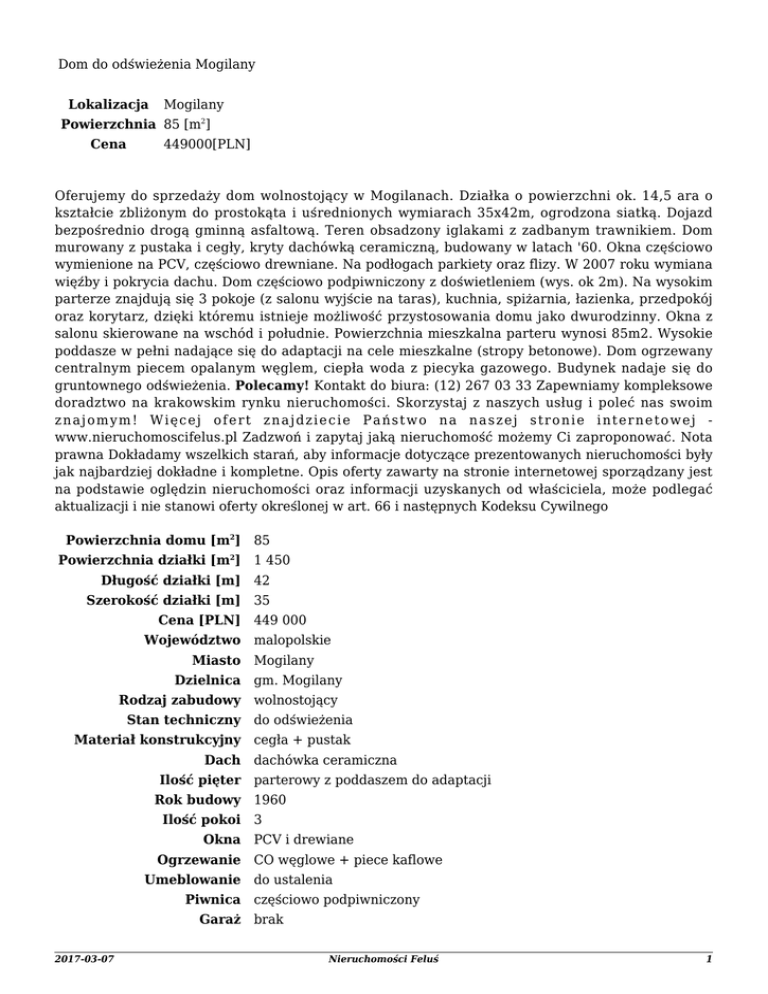 Dom do odświeżenia Mogilany Lokalizacja Mogilany Powierzchnia 85 [m2] Cena 449000[PLN] Oferujemy do sprzedaży dom wolnostojący w Mogilanach. Działka o powierzchni ok. 14,5 ara o kształcie zbliżonym do prostokąta i uśrednionych wymiarach 35x42m, ogrodzona siatką. Dojazd bezpośrednio drogą gminną asfaltową. Teren obsadzony iglakami z zadbanym trawnikiem. Dom murowany z pustaka i cegły, kryty dachówką ceramiczną, budowany w latach '60. Okna częściowo wymienione na PCV, częściowo drewniane. Na podłogach parkiety oraz flizy. W 2007 roku wymiana więźby i pokrycia dachu. Dom częściowo podpiwniczony z doświetleniem (wys. ok 2m). Na wysokim parterze znajdują się 3 pokoje (z salonu wyjście na taras), kuchnia, spiżarnia, łazienka, przedpokój oraz korytarz, dzięki któremu istnieje możliwość przystosowania domu jako dwurodzinny. Okna z salonu skierowane na wschód i południe. Powierzchnia mieszkalna parteru wynosi 85m2. Wysokie poddasze w pełni nadające się do adaptacji na cele mieszkalne (stropy betonowe). Dom ogrzewany centralnym piecem opalanym węglem, ciepła woda z piecyka gazowego. Budynek nadaje się do gruntownego odświeżenia. Polecamy! Kontakt do biura: (12) 267 03 33 Zapewniamy kompleksowe doradztwo na krakowskim rynku nieruchomości. Skorzystaj z naszych usług i poleć nas swoim znajomym! Więcej ofert znajdziecie Państwo na naszej stronie internetowej www.nieruchomoscifelus.pl Zadzwoń i zapytaj jaką nieruchomość możemy Ci zaproponować. Nota prawna Dokładamy wszelkich starań, aby informacje dotyczące prezentowanych nieruchomości były jak najbardziej dokładne i kompletne. Opis oferty zawarty na stronie internetowej sporządzany jest na podstawie oględzin nieruchomości oraz informacji uzyskanych od właściciela, może podlegać aktualizacji i nie stanowi oferty określonej w art. 66 i następnych Kodeksu Cywilnego Powierzchnia domu [m2] 85 Powierzchnia działki [m2] 1 450 Długość działki [m] 42 Szerokość działki [m] 35 Cena [PLN] 449 000 Województwo malopolskie Miasto Mogilany Dzielnica gm. Mogilany Rodzaj zabudowy wolnostojący Stan techniczny do odświeżenia Materiał konstrukcyjny cegła + pustak Dach dachówka ceramiczna Ilość pięter parterowy z poddaszem do adaptacji Rok budowy 1960 Ilość pokoi 3 Okna PCV i drewiane Ogrzewanie CO węglowe + piece kaflowe Umeblowanie do ustalenia Piwnica częściowo podpiwniczony Garaż brak 2017-03-07 Nieruchomości Feluś 1 Zieleń urządzony ogród Zobacz wszystkie oferty z działu: Domy Kraków 2017-03-07 Nieruchomości Feluś 2