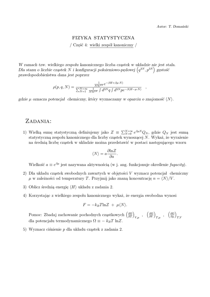 Autor: T. Domański fizyka statystyczna / Cze,ść 4: wielki zespól kanoniczny / W ramach tzw. wielkiego zespolu kanonicznego liczba cza,stek w uk ladzie nie jest stala. 3N 3N Dla stanu o liczbie cza,stek N i konfiguracji polożeniowo-pe,dowej q , p ge,stość prawdopodobieństwa dana jest poprzez 1 e−βH+βµ·N ) N !h3N R R 1 d3N q d3N pe−β(H−µ·N ) N =1 N !h3N ρ(p, q, N ) = PN =∞ , gdzie µ oznacza potencjal chemiczny, który wyznaczamy w oparciu o znajomość hN i. Zadania: =∞ βµN 1) Wielka, sume, statystyczna, definiujemy jako Z ≡ N QN , gdzie QN jest suma, N =0 e statystyczna, zespolu kanonicznego dla liczby cza,stek wynosza,cej N . Wykaż, że wyrażenie na średnia, liczbe, cza,stek w ukladzie można przedstawić w postaci naste,puja,cego wzoru P hN i = a ∂lnZ . ∂a Wielkość a ≡ eβµ jest nazywana aktywnościa, (w j. ang. funkcjonuje określenie fugacity). 2) Dla ukladu cza,stek swobodnych zawartych w obje,tości V wyznacz potencjal chemiczny µ w zależności od temperatury T . Przyjmij jako znana, koncentracje, n = hN i/V . 3) Oblicz średnia, energie, hHi ukladu z zadania 2. 4) Korzystaja,c z wielkiego zespolu kanonicznego wykaż, że energia swobodna wynosi F = −kB T lnZ + µhN i. Pomoc: Zbadaj zachowanie pochodnych cza,stkowych dla potencjalu termodynamicznego Ω ≡ − kB T lnZ. 5) Wyznacz ciśnienie p dla ukladu cza,stek z zadania 2. ∂Ω ∂T V,µ , ∂Ω ∂V T,µ , ∂Ω ∂µ T,V