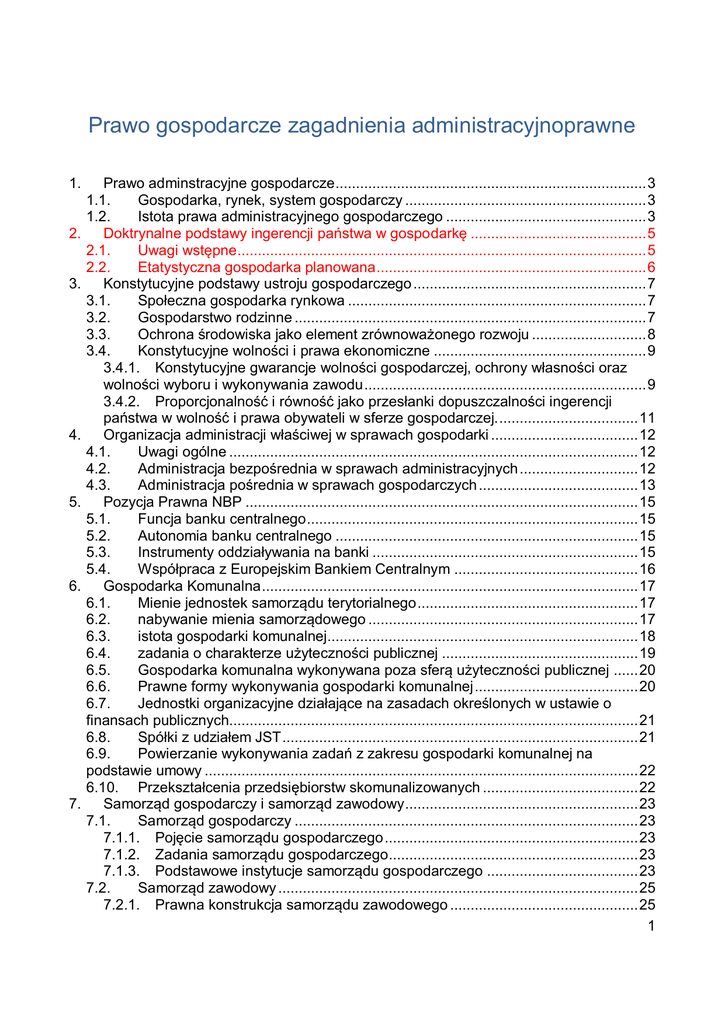 Prawo gospodarcze zagadnienia administracyjnoprawne 1. 2. 3. 4. 5. 6. 7. Prawo adminstracyjne gospodarcze ............................................................................ 3 1.1. Gospodarka, rynek, system gospodarczy ........................................................... 3 1.2. Istota prawa administracyjnego gospodarczego ................................................. 3 Doktrynalne podstawy ingerencji państwa w gospodarkę ........................................... 5 2.1. Uwagi wstępne .................................................................................................... 5 2.2. Etatystyczna gospodarka planowana .................................................................. 6 Konstytucyjne podstawy ustroju gospodarczego ......................................................... 7 3.1. Społeczna gospodarka rynkowa ......................................................................... 7 3.2. Gospodarstwo rodzinne ...................................................................................... 7 3.3. Ochrona środowiska jako element zrównoważonego rozwoju ............................ 8 3.4. Konstytucyjne wolności i prawa ekonomiczne .................................................... 9 3.4.1. Konstytucyjne gwarancje wolności gospodarczej, ochrony własności oraz wolności wyboru i wykonywania zawodu ..................................................................... 9 3.4.2. Proporcjonalność i równość jako przesłanki dopuszczalności ingerencji państwa w wolność i prawa obywateli w sferze gospodarczej. .................................. 11 Organizacja administracji właściwej w sprawach gospodarki .................................... 12 4.1. Uwagi ogólne .................................................................................................... 12 4.2. Administracja bezpośrednia w sprawach administracyjnych ............................. 12 4.3. Administracja pośrednia w sprawach gospodarczych ....................................... 13 Pozycja Prawna NBP ................................................................................................ 15 5.1. Funcja banku centralnego ................................................................................. 15 5.2. Autonomia banku centralnego .......................................................................... 15 5.3. Instrumenty oddziaływania na banki ................................................................. 15 5.4. Współpraca z Europejskim Bankiem Centralnym ............................................. 16 Gospodarka Komunalna ............................................................................................ 17 6.1. Mienie jednostek samorządu terytorialnego ...................................................... 17 6.2. nabywanie mienia samorządowego .................................................................. 17 6.3. istota gospodarki komunalnej............................................................................ 18 6.4. zadania o charakterze użyteczności publicznej ................................................ 19 6.5. Gospodarka komunalna wykonywana poza sferą użyteczności publicznej ...... 20 6.6. Prawne formy wykonywania gospodarki komunalnej ........................................ 20 6.7. Jednostki organizacyjne działające na zasadach określonych w ustawie o finansach publicznych.................................................................................................... 21 6.8. Spółki z udziałem JST ....................................................................................... 21 6.9. Powierzanie wykonywania zadań z zakresu gospodarki komunalnej na podstawie umowy .......................................................................................................... 22 6.10. Przekształcenia przedsiębiorstw skomunalizowanych ...................................... 22 Samorząd gospodarczy i samorząd zawodowy ......................................................... 23 7.1. Samorząd gospodarczy .................................................................................... 23 7.1.1. Pojęcie samorządu gospodarczego .............................................................. 23 7.1.2. Zadania samorządu gospodarczego............................................................. 23 7.1.3. Podstawowe instytucje samorządu gospodarczego ..................................... 23 7.2. Samorząd zawodowy ........................................................................................ 25 7.2.1. Prawna konstrukcja samorządu zawodowego .............................................. 25 1 7.2.2. Charakter prawny samorządu zawodowego ................................................. 25 7.2.3. Zakres władztwa publicznoprawnego samorządu zawodowego ................... 25 8. Funkcje administracji gospodarczej ........................................................................... 26 8.1. Pojęcie funkcji administracji gospodarczej a funkcje państwa i prawa .............. 26 8.2. Klasyfikacje funkcji administracji gospodarczej ................................................. 26 9. Przedsiębiorca........................................................................................................... 31 9.1. Pojęcie przedsiębiorcy w prawie publicznym .................................................... 31 9.2. Definicja przedsiębiorcy oraz działalności gospodarczej w u.s.d.g. .................. 31 9.2.1. Przedsiębiorca .............................................................................................. 31 9.3. Podstawowe prawa przedsiębiorcy ................................................................... 38 9.3.1. Gwarancje wolności działalności gospodarczej w u.s.d.g. ............................ 38 9.3.2. Normy programowe ...................................................................................... 38 9.3.3. Uprawnienia przedsiębior