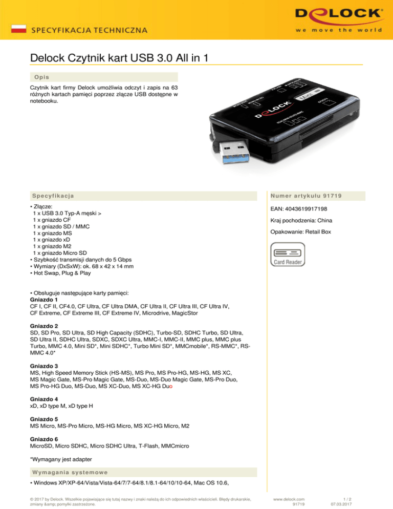 Delock Czytnik kart USB 3.0 All in 1 Opis Czytnik kart firmy Delock umożliwia odczyt i zapis na 63 różnych kartach pamięci poprzez złącze USB dostępne w notebooku. Specyfikacja • Złącze: 1 x USB 3.0 Typ-A męski > 1 x gniazdo CF 1 x gniazdo SD / MMC 1 x gniazdo MS 1 x gniazdo xD 1 x gniazdo M2 1 x gniazdo Micro SD • Szybkość transmisji danych do 5 Gbps • Wymiary (DxSxW): ok. 68 x 42 x 14 mm • Hot Swap, Plug & Play Numer artykułu 91719 EAN: 4043619917198 Kraj pochodzenia: China Opakowanie: Retail Box • Obsługuje następujące karty pamięci: Gniazdo 1 CF I, CF II, CF4.0, CF Ultra, CF Ultra DMA, CF Ultra II, CF Ultra III, CF Ultra IV, CF Extreme, CF Extreme III, CF Extreme IV, Microdrive, MagicStor Gniazdo 2 SD, SD Pro, SD Ultra, SD High Capacity (SDHC), Turbo-SD, SDHC Turbo, SD Ultra, SD Ultra II, SDHC Ultra, SDXC, SDXC Ultra, MMC-I, MMC-II, MMC plus, MMC plus Turbo, MMC 4.0, Mini SD*, Mini SDHC*, Turbo Mini SD*, MMCmobile*, RS-MMC*, RSMMC 4.0* Gniazdo 3 MS, High Speed Memory Stick (HS-MS), MS Pro, MS Pro-HG, MS-HG, MS XC, MS Magic Gate, MS-Pro Magic Gate, MS-Duo, MS-Duo Magic Gate, MS-Pro Duo, MS Pro-HG Duo, MS-Duo, MS XC-Duo, MS XC-HG Duo Gniazdo 4 xD, xD type M, xD type H Gniazdo 5 MS Micro, MS-Pro Micro, MS-HG Micro, MS XC-HG Micro, M2 Gniazdo 6 MicroSD, Micro SDHC, Micro SDHC Ultra, T-Flash, MMCmicro *Wymagany jest adapter Wymagania systemowe • Windows XP/XP-64/Vista/Vista-64/7/7-64/8.1/8.1-64/10/10-64, Mac OS 10.6, © 2017 by Delock. Wszelkie pojawiające się tutaj nazwy i znaki należą do ich odpowiednich właścicieli. Błędy drukarskie, zmiany & pomyłki zastrzeżone. www.delock.com 91719 1/2 07.03.2017 Linux Kernel 2.6 • Komputer osobisty lub laptop z wolnym portem USB Typ-A Zawartość opakowania • Czytnik kart USB 3.0 All in 1 • Instrukcja obsługi Zdjęcia © 2017 by Delock. Wszelkie pojawiające się tutaj nazwy i znaki należą do ich odpowiednich właścicieli. Błędy drukarskie, zmiany & pomyłki zastrzeżone. Powered by TCPDF (www.tcpdf.org) www.delock.com 91719 2/2 07.03.2017
