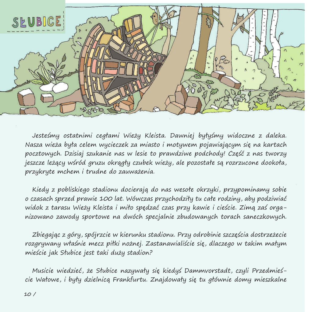 Jesteśmy ostatnimi cegłami Wieży Kleista. Dawniej byłyśmy widoczne z daleka. Nasza wieża była celem wycieczek za miasto i motywem pojawiającym się na kartach pocztowych. Dzisiaj szukanie nas w lesie to prawdziwe podchody! Część z nas tworzy jeszcze leżący wśród gruzu okrągły czubek wieży, ale pozostałe są rozrzucone dookoła, przykryte mchem i trudne do zauważenia. Kiedy z pobliskiego stadionu docierają do nas wesołe okrzyki, przypominamy sobie o czasach sprzed prawie 100 lat. Wówczas przychodziły tu całe rodziny, aby podziwiać widok z tarasu Wieży Kleista i miło spędzać czas przy kawie i cieście. Zimą zaś organizowano zawody sportowe na dwóch specjalnie zbudowanych torach saneczkowych. Zbiegając z góry, spójrzcie w kierunku stadionu. Przy odrobinie szczęścia dostrzeżecie rozgrywany właśnie mecz piłki nożnej. Zastanawialiście się, dlaczego w takim małym mieście jak Słubice jest taki duży stadion? Musicie wiedzieć, że Słubice nazywały się kiedyś Dammvorstadt, czyli Przedmieście Wałowe, i były dzielnicą Frankfurtu. Znajdowały się tu głównie domy mieszkalne 10 / i fabryki, ale także lotnisko i stadion sportowy. W wodę i gaz miasto było zaopatrywane przez rury biegnące pod mostem. Po naszej stronie znajdowały się też Wzgórza Żydowskie (Judenberge), które należały do ulubionych miejsc wypoczynku mieszkańców Frankfurtu. I dlatego już przed 100 laty między centrum miasta a naszą dzielnicą jeździł tramwaj. Potem przyszła druga wojna światowa, która w wielu krajach przyniosła wielkie cierpienie i zniszczenia. W trakcie ostatnich walk o miasto nasza wieża została wysadzona w powietrze. Po wojnie miliony ludzi musiały opuścić swoje rodzinne strony, a w całej Europie pojawiły się nowe granice państwowe. Odra stała się granicą między Polską i Niemcami, a z frankfurckiego przedmieścia powstało miasto Słubice. Wieża Kleista była wtedy ruiną. Nasze nowe miasto nie miało gazu, wody ani połączeń telefonicznych, przestał też jeździć tramwaj. Stadion, który został po naszej stronie, nie był żadną pociechą. Możecie mi wierzyć, wtedy nikt nie myślał o sporcie i zabawie! Większość byłych mieszkańców przedmieścia musiała sobie szukać nowych domów po niemieckiej stronie. Do Słubic powoli przybywali ludzie, z których wielu straciło domy na byłych wschodnich terenach Polski. Nowi mieszkańcy musieli się jakoś urządzić w naszym małym, odciętym od świata miasteczku. Od tych wydarzeń minęło już 70 lat. Jesteście dziś świadkami wielu ciekawych zmian w Europie. Granice zdają się prawie znikać, coraz częściej szuka się tego, co łączy Europejczyków, i planuje się wspólną przyszłość. Frankfurt i Słubice mają od niedawna wspólną linię autobusową i sieć ciepłowniczą. Znowu jest wiele okazji do spotkań mieszkańców. Powstały nawet plany odbudowy Wieży Kleista. Tak długo leżałyśmy niezauważone i rozrzucone w lesie, że teraz mamy nadzieję stać się częścią tej nowej wieży. I że w przyszłości będzie ona znowu celem wycieczek ludzi mieszkających po obu stronach Odry! . / 11 10 / Dzieci zgubiły swoje saneczki. Pomóż im je znaleźć! Znajdź podłużny zbiornik z wodą, leżący niedaleko stadionu. Zmierz jego długość krokami. Jak myślisz, do czego mógł kiedyś służyć? Tak wyglądała kiedyś Wieża Kleista, nazwana na pamiątkę Ewalda von Kleista, poety i oicera, który walczył w bitwie pod Kunowicami. Znajdź jej ruiny i pokoloruj rysunek! Znajdź na cmentarzu część z najstarszymi grobami. Z których lat one pochodzą? Czym różnią się od nowszych nagrobków? Narysuj grób, który podoba ci się najbardziej. / 13