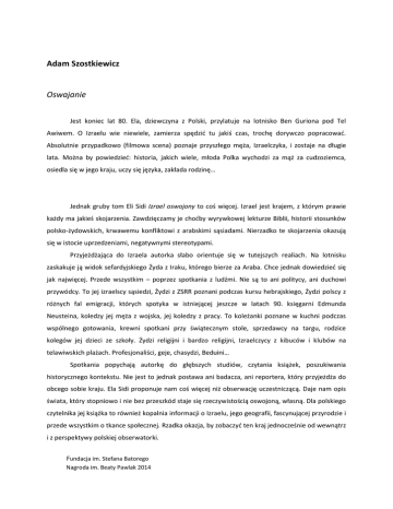 Adam Szostkiewicz Oswajanie Jest koniec lat 80. Ela, dziewczyna z Polski, przylatuje na lotnisko Ben Guriona pod Tel Awiwem. O Izraelu wie niewiele, zamierza spędzić tu jakiś czas, trochę dorywczo popracować. Absolutnie przypadkowo (filmowa scena) poznaje przyszłego męża, Izraelczyka, i zostaje na długie lata. Można by powiedzieć: historia, jakich wiele, młoda Polka wychodzi za mąż za cudzoziemca, osiedla się w jego kraju, uczy się języka, zakłada rodzinę… Jednak gruby tom Eli Sidi Izrael oswojony to coś więcej. Izrael jest krajem, z którym prawie każdy ma jakieś skojarzenia. Zawdzięczamy je choćby wyrywkowej lekturze Biblii, historii stosunków polsko-żydowskich, krwawemu konfliktowi z arabskimi sąsiadami. Nierzadko te skojarzenia okazują się w istocie uprzedzeniami, negatywnymi stereotypami. Przyjeżdżająca do Izraela autorka słabo orientuje się w tutejszych realiach. Na lotnisku zaskakuje ją widok sefardyjskiego Żyda z Iraku, którego bierze za Araba. Chce jednak dowiedzieć się jak najwięcej. Przede wszystkim – poprzez spotkania z ludźmi. Nie są to ani politycy, ani duchowi przywódcy. To jej izraelscy sąsiedzi, Żydzi z ZSRR poznani podczas kursu hebrajskiego, Żydzi polscy z różnych fal emigracji, których spotyka w istniejącej jeszcze w latach 90. księgarni Edmunda Neusteina, koledzy jej męża z wojska, jej koledzy z pracy. To koleżanki poznane w kuchni podczas wspólnego gotowania, krewni spotkani przy świątecznym stole, sprzedawcy na targu, rodzice kolegów jej dzieci ze szkoły. Żydzi religijni i bardzo religijni, Izraelczycy z kibuców i klubów na telawiwskich plażach. Profesjonaliści, geje, chasydzi, Beduini… Spotkania popychają autorkę do głębszych studiów, czytania książek, poszukiwania historycznego kontekstu. Nie jest to jednak postawa ani badacza, ani reportera, który przyjeżdża do obcego sobie kraju. Ela Sidi proponuje nam coś więcej niż obserwację uczestniczącą. Daje nam opis świata, który stopniowo i nie bez przeszkód staje się rzeczywistością oswojoną, własną. Dla polskiego czytelnika jej książka to również kopalnia informacji o Izraelu, jego geografii, fascynującej przyrodzie i przede wszystkim o tkance społecznej. Rzadka okazja, by zobaczyć ten kraj jednocześnie od wewnątrz i z perspektywy polskiej obserwatorki. Fundacja im. Stefana Batorego Nagroda im. Beaty Pawlak 2014 Ela Sidi prowadzi również blog internetowy. Inspirowana blogowym stylem narracja jest wielkim walorem książki. Polityczne i historyczne analizy sąsiadują tu z anegdotą, soczystym opisem sytuacji, wyrazistym portretem spotkanych postaci. Blogowa narracja pozwala na wyrażenie własnych emocji, czasem zdziwień, niekiedy powściągliwych ocen. Obserwujemy z bliska przemianę zagubionej emigrantki w Izraelkę, choć z przywiezioną do jej nowego kraju polską perspektywą i wrażliwością. Ela Sidi, Izrael oswojony, Wydawnictwo MUZA S.A., Warszawa 2013, s. 560. Adam Szostkiewicz (ur. 1952) – publicysta i tłumacz. Redaktor „Polityki”, a wcześniej „Tygodnika Powszechnego”. Działacz opozycji w okresie PRL. Wykładał dziennikarstwo w Collegium Civitas. Publikacja udostępniana jest na zasadach licencji Creative Commons (CC) Uznanie autorstwa – Na tych samych warunkach 3.0 Polska[CC BY-SA 3.0 PL] Fundacja im. Stefana Batorego Nagroda im. Beaty Pawlak 2014