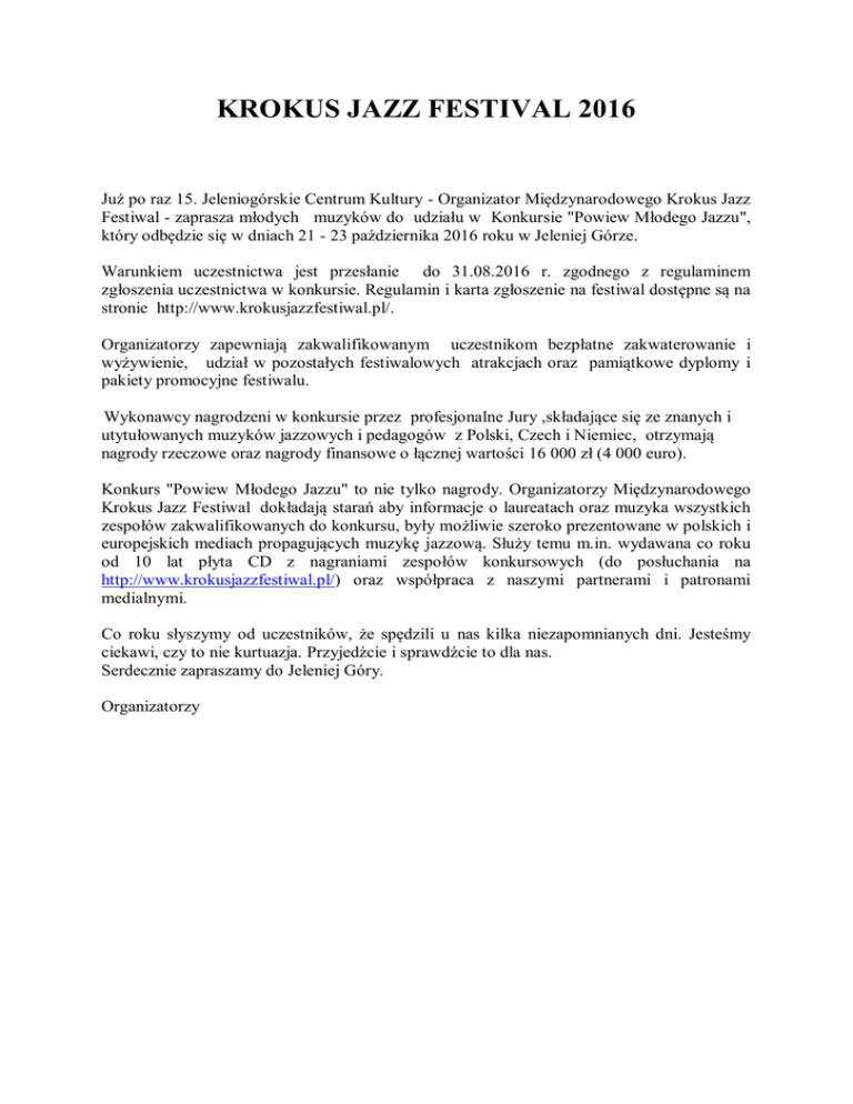 KROKUS JAZZ FESTIVAL 2016 Już po raz 15. Jeleniogórskie Centrum Kultury - Organizator Międzynarodowego Krokus Jazz Festiwal - zaprasza młodych muzyków do udziału w Konkursie "Powiew Młodego Jazzu", który odbędzie się w dniach 21 - 23 października 2016 roku w Jeleniej Górze. Warunkiem uczestnictwa jest przesłanie do 31.08.2016 r. zgodnego z regulaminem zgłoszenia uczestnictwa w konkursie. Regulamin i karta zgłoszenie na festiwal dostępne są na stronie http://www.krokusjazzfestiwal.pl/. Organizatorzy zapewniają zakwalifikowanym uczestnikom bezpłatne zakwaterowanie i wyżywienie, udział w pozostałych festiwalowych atrakcjach oraz pamiątkowe dyplomy i pakiety promocyjne festiwalu. Wykonawcy nagrodzeni w konkursie przez profesjonalne Jury ,składające się ze znanych i utytułowanych muzyków jazzowych i pedagogów z Polski, Czech i Niemiec, otrzymają nagrody rzeczowe oraz nagrody finansowe o łącznej wartości 16 000 zł (4 000 euro). Konkurs "Powiew Młodego Jazzu" to nie tylko nagrody. Organizatorzy Międzynarodowego Krokus Jazz Festiwal dokładają starań aby informacje o laureatach oraz muzyka wszystkich zespołów zakwalifikowanych do konkursu, były możliwie szeroko prezentowane w polskich i europejskich mediach propagujących muzykę jazzową. Służy temu m.in. wydawana co roku od 10 lat płyta CD z nagraniami zespołów konkursowych (do posłuchania na http://www.krokusjazzfestiwal.pl/) oraz współpraca z naszymi partnerami i patronami medialnymi. Co roku słyszymy od uczestników, że spędzili u nas kilka niezapomnianych dni. Jesteśmy ciekawi, czy to nie kurtuazja. Przyjedźcie i sprawdźcie to dla nas. Serdecznie zapraszamy do Jeleniej Góry. Organizatorzy
