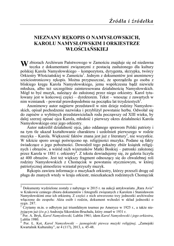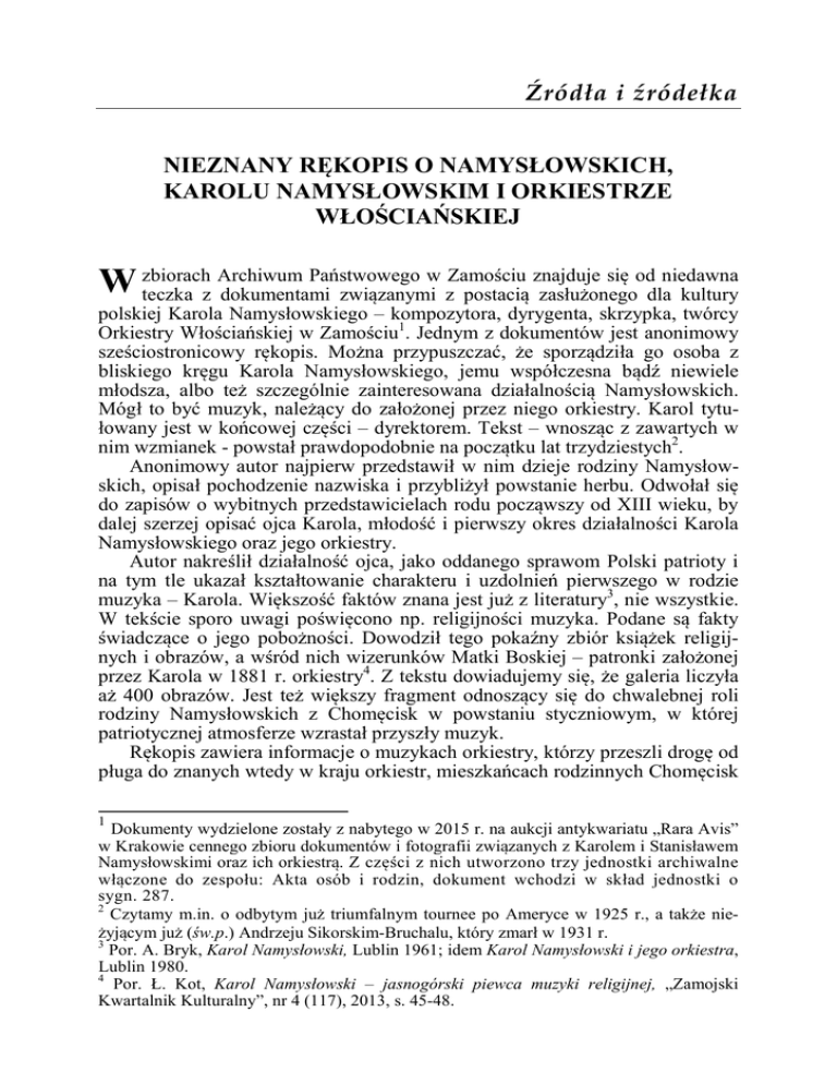 Źródła i źródełka NIEZNANY RĘKOPIS O NAMYSŁOWSKICH, KAROLU NAMYSŁOWSKIM I ORKIESTRZE WŁOŚCIAŃSKIEJ zbiorach Archiwum Państwowego w Zamościu znajduje się od niedawna W teczka z dokumentami związanymi z postacią zasłużonego dla kultury polskiej Karola Namysłowskiego – kompozytora, dyrygenta, skrzypka, twórcy Orkiestry Włościańskiej w Zamościu1. Jednym z dokumentów jest anonimowy sześciostronicowy rękopis. Można przypuszczać, że sporządziła go osoba z bliskiego kręgu Karola Namysłowskiego, jemu współczesna bądź niewiele młodsza, albo też szczególnie zainteresowana działalnością Namysłowskich. Mógł to być muzyk, należący do założonej przez niego orkiestry. Karol tytułowany jest w końcowej części – dyrektorem. Tekst – wnosząc z zawartych w nim wzmianek - powstał prawdopodobnie na początku lat trzydziestych2. Anonimowy autor najpierw przedstawił w nim dzieje rodziny Namysłowskich, opisał pochodzenie nazwiska i przybliżył powstanie herbu. Odwołał się do zapisów o wybitnych przedstawicielach rodu począwszy od XIII wieku, by dalej szerzej opisać ojca Karola, młodość i pierwszy okres działalności Karola Namysłowskiego oraz jego orkiestry. Autor nakreślił działalność ojca, jako oddanego sprawom Polski patrioty i na tym tle ukazał kształtowanie charakteru i uzdolnień pierwszego w rodzie muzyka – Karola. Większość faktów znana jest już z literatury3, nie wszystkie. W tekście sporo uwagi poświęcono np. religijności muzyka. Podane są fakty świadczące o jego pobożności. Dowodził tego pokaźny zbiór książek religijnych i obrazów, a wśród nich wizerunków Matki Boskiej – patronki założonej przez Karola w 1881 r. orkiestry4. Z tekstu dowiadujemy się, że galeria liczyła aż 400 obrazów. Jest też większy fragment odnoszący się do chwalebnej roli rodziny Namysłowskich z Chomęcisk w powstaniu styczniowym, w której patriotycznej atmosferze wzrastał przyszły muzyk. Rękopis zawiera informacje o muzykach orkiestry, którzy przeszli drogę od pługa do znanych wtedy w kraju orkiestr, mieszkańcach rodzinnych Chomęcisk 1 Dokumenty wydzielone zostały z nabytego w 2015 r. na aukcji antykwariatu „Rara Avis” w Krakowie cennego zbioru dokumentów i fotografii związanych z Karolem i Stanisławem Namysłowskimi oraz ich orkiestrą. Z części z nich utworzono trzy jednostki archiwalne włączone do zespołu: Akta osób i rodzin, dokument wchodzi w skład jednostki o sygn. 287. 2 Czytamy m.in. o odbytym już triumfalnym tournee po Ameryce w 1925 r., a także nieżyjącym już (św.p.) Andrzeju Sikorskim-Bruchalu, który zmarł w 1931 r. 3 Por. A. Bryk, Karol Namysłowski, Lublin 1961; idem Karol Namysłowski i jego orkiestra, Lublin 1980. 4 Por. Ł. Kot, Karol Namysłowski – jasnogórski piewca muzyki religijnej, „Zamojski Kwartalnik Kulturalny”, nr 4 (117), 2013, s. 45-48. Nieznany rękopis o Namysłowskich, Karolu Namysłowskim... i okolic, których Namysłowski angażował do powstającej orkiestry. Uczył ich grać, śpiewać, czytać nuty. Opisane są sukcesy Namysłowiaków oraz ich losy w trudnych czasach, gdy Polska pozostawała pod zaborami. Ten nieznany dotychczas tekst nie został dokończony, albo po prostu nie zachował się do dzisiaj w całości5. Niewątpliwie wzbogaca dotychczasową wiedzę o orkiestrze i jej założycielu o kilka faktów. Ciekawy epizod stanowi opisane tu spotkanie z carem. Do tej pory w monografiach orkiestry nie był znany fakt odwiedzenia kilku innych dużych miast poza krajem, np. Helsinek. dr Agnieszka Szykuła-Żygawska, Andrzej Kędziora Karol Namysłowski, jego działalność 6 -1Z rodziny zasłużonej ojczyźnie piękną i ofiarna pracą wywodził się Karol Namysłowski. Nazwisko nie topograficznego pochodzenia, nie od Namysłowa, lecz imienne od Namysława rycerza (Rycerstwo Wielkopolskie – Piekosiński7). Namysław jest założycielem Namysłowa a z Namysłowa dopiero Namysłowscy. Herbem miejscowości już w XII i XIII wieku dotychczas używanym była pięcioramienna gwiazda srebrna w niebieskim polu, sięga ona samego Namysława. Już w r. 1278 jeden z edyktów księcia Przemysława księcia na Kaliszu w Poznaniu podpisuje Jaśko z Namysłowa i Ekhaus (Kodeks Wielkopolski). Uniwersytet Krakowski w XV w. zna około 10 studentów piszących się z Namysłowa (Wieczkowski – statut [nieczyt.] promotionum) otrzymujących stopnie doktorskie. Już pod koniec XVI w. występuje Jan z Namysłowa vel Jan Licinius Namysłowski jeden z wybitnych twórców polskiego arjanizmu – był on rektorem szkół arjańskich (pow. Oszmiański) i ministrem arjańskim8. Znakomity mówca pisał po łacinie i po polsku – wierszem i prozą. Wojował na publicznych dysputach i miał bezwzględny wpływ na szlachtę (Grabowski – Arjanie polscy – nakład Akademii Umiejętności). Zostawił sporo dzieł niektóre z nich bezcenne dla swej rzadkości, np. „Do braci ministrów ku przyjęciu zgody upomnień”. Nowogródek 1597. Jak również i z wierzenia, np. „Wszyscy do rozkosznego żądają iść nieba A mało tych co myślą, że wprzód cierpieć trzeba.”Umarł w r. 1616. Równocześnie z nim Theodor Licinius 5 Tekst nie zawiera zakończenia, na ostatniej stronie zachował się skrawek wolnego miejsca dopisek tą samą ręką dalszy ciąg, co mogłoby oznaczać zamierzoną później kontynuację tej opowieści. 6 Oryginalny tytuł rękopisu, stanowią go jednostronnie zapisane karty formatu 23x26 cm. Zaznaczono miejsca, w których nie udało się odczytać nieczytelnych wyrazów. 7 Wśród prac słynnego historyka Franciska Piekosińskiego nie ma publikacji poświęconej rycerstwu welkopolskiemu. 8 Był „ministrem zboru”, wg współczesnych opracowań zm. po 1633 r. 114 Karol Namysłowski, jego działalność Namysłowski autor: „Plac na którym shyzmatyk się nie ostoi” Wilno 1628 r. i Józef Licinius Namysłowski, o którym mowa w dziele