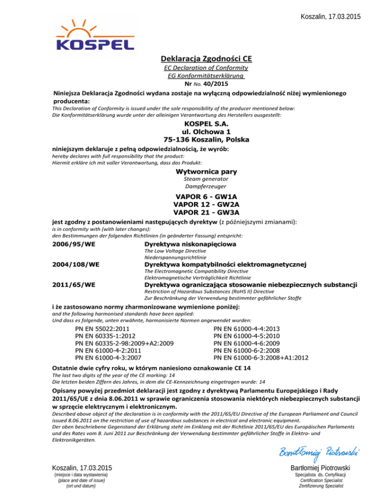 Koszalin, 17.03.2015 Deklaracja Zgodności CE EC Declaration of Conformity EG Konformitätserklärung Nr No. 40/2015 Niniejsza Deklaracja Zgodności wydana zostaje na wyłączną odpowiedzialność niżej wymienionego producenta: This Declaration of Conformity is issued under the sole responsibility of the producer mentioned below: Die Konformitätserklärung wurde unter der alleinigen Verantwortung des Herstellers ausgestellt: KOSPEL S.A. ul. Olchowa 1 75-136 Koszalin, Polska niniejszym deklaruje z pełną odpowiedzialnością, że wyrób: hereby declares with full responsibility that the product: Hiermit erkläre ich mit voller Verantwortung, dass das Produkt: Wytwornica pary Steam generator Dampferzeuger VAPOR 6 - GW1A VAPOR 12 - GW2A VAPOR 21 - GW3A jest zgodny z postanowieniami następujących dyrektyw (z późniejszymi zmianami): is in conformity with (with later changes): den Bestimmungen der folgenden Richtlinien (in geänderter Fassung) entspricht: 2006/95/WE Dyrektywa niskonapięciowa 2004/108/WE Dyrektywa kompatybilności elektromagnetycznej 2011/65/WE Dyrektywa ograniczająca stosowanie niebezpiecznych substancji The Low Voltage Directive Niederspannungsrichtlinie The Electromagnetic Compatibility Directive Elektromagnetische Verträglichkeit Richtlinie Restriction of Hazardous Substances (RoHS II) Directive Zur Beschränkung der Verwendung bestimmter gefährlicher Stoffe i że zastosowano normy zharmonizowane wymienione poniżej: and the following harmonised standards have been applied: Und dass es folgende, unten erwähnte, harmonisierte Normen angewendet wurden: PN PN PN PN PN EN EN EN EN EN 55022:2011 60335-1:2012 60335-2-98:2009+A2:2009 61000-4-2:2011 61000-4-3:2007 PN PN PN PN PN EN EN EN EN EN 61000-4-4:2013 61000-4-5:2010 61000-4-6:2009 61000-6-2:2008 61000-6-3:2008+A1:2012 Ostatnie dwie cyfry roku, w którym naniesiono oznakowanie CE 14 The last two digits of the year of the CE marking: 14 Die letzten beiden Ziffern des Jahres, in dem die CE-Kennzeichnung eingetragen wurde: 14 Opisany powyżej przedmiot deklaracji jest zgodny z dyrektywą Parlamentu Europejskiego i Rady 2011/65/UE z dnia 8.06.2011 w sprawie ograniczenia stosowania niektórych niebezpiecznych substancji w sprzęcie elektrycznym i elektronicznym. Described above object of the declaration is in conformity with the 2011/65/EU Directive of the European Parliament and Council issued 8.06.2011 on the restriction of use of hazardous substances in electrical and electronic equipment. Der oben beschriebene Gegenstand der Erklärung steht im Einklang mit der Richtlinie 2011/65/EU des Europäischen Parlaments und des Rates vom 8. Juni 2011 zur Beschränkung der Verwendung bestimmter gefährlicher Stoffe in Elektro- und Elektronikgeräten. Koszalin, 17.03.2015 Bartłomiej Piotrowski (miejsce i data wystawienia) (place and date of issue) (ort und datum) Specjalista ds. Certyfikacji Certification Specialist Zertifizierung Spezialist