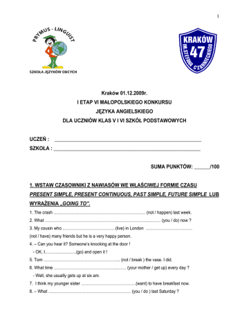 1 Kraków 01.12.2009r. I ETAP VI MAŁOPOLSKIEGO KONKURSU JĘZYKA ANGIELSKIEGO DLA UCZNIÓW KLAS V I VI SZKÓŁ PODSTAWOWYCH UCZEŃ : _______________________________________________________ SZKOŁA : _______________________________________________________ SUMA PUNKTÓW: ______/100 1. WSTAW CZASOWNIKI Z NAWIASÓW WE WŁAŚCIWEJ FORMIE CZASU PRESENT SIMPLE, PRESENT CONTINUOUS, PAST SIMPLE, FUTURE SIMPLE LUB WYRAśENIA „GOING TO”. 1. The crash ……………………………………………………….… (not / happen) last week. 2. What ……………………………………………..…………………..……… (you / do) now ? 3. My cousin who ……………………………….. (live) in London ……………………………. (not / have) many friends but he is a very happy person. 4. – Can you hear it? Someone’s knocking at the door ! - OK, I…………………..(go) and open it ! 5. Tom ……………………………………………….. (not / break ) the vase. I did. 6. What time ………………………………………..…… (your mother / get up) every day ? - Well, she usually gets up at six am. 7. I think my younger sister ………………………………….(want) to have breakfast now. 8. – What …………………………………………………… (you / do ) last Saturday ? 2 - I …………………………….. (spend) that Saturday with my friends in the mountains. 9. - Are you going to the party tonight ? - Oh, yes. Of course. - What …………………………………………………….. (you / wear) ? - Well, I’m going to wear a nice pink dress. 10. She …………………………………………. (always / have) a ham sandwich for lunch. _____/12 2. WSTAW ODPOWIEDNI PRZYIMEK (at, on, in) LUB (-) W MIEJSCU, GDZIE PRZYIMEK JEST NIEPOTRZEBNY. 1. She has lunch ……………….. noon. 2. What are you doing …………… the evening ? 3. We met at the party ……………. New Year’s Day. 4. What do you usually eat …………… Christmas ? 5. We were in Italy ……………. December. 6. I was born ……………. the first of April. 7. I start my English classes …………………… 6 o’clock. 8. We often go swimming …………………… Saturday morning. 9. Peter and Alice spent two weeks in Madrid ……………….last winter. 10. He’s working on his essay …………….. the moment. _____/10 3. WSTAW ODPOWIEDNIĄ FORMĘ WYRAśENIA THERE IS / THERE ARE. UśYJ PRAWIDŁOWEGO CZASU. 1. …………………………………… twenty students in our class this year ? 2. I live in a small, strange town. ……………………………………. a school with six teachers. …………………………………. any cars – people do not need them because they all have bikes. In the past …………………………………….. any shops but now …………………………………… three small shops. Of course, now …………………………….. a cinema but ……………………… a hospital. Everybody asks me “…………………………………….. any snow in winter ?”, but unfortunately …………………………………. any snow. 3. How many days ………………………………………… in a week ? _____/10 3 4. PRZETŁUMACZ NA JĘZYK ANGIELSKI ZWROTY Z NAWIASÓW. 1. She …………………………………………… (nie powinna) cheat during the exam. 2. He …………………………………………….. (potrafił) run very fast when he was young. 3. You ……………………………………………. (nie musisz) tell me the secret. 4. (Nie wolno nam) …………………………………………. run at school. 5. What time ………………………………………………… (będziesz musiał) get up tomorrow ? 6. (Czy mogę) ………………………………………….. sit on this chair, please ? 7. Last winter we …………………………………………………. (nie musieliśmy) write any tests. 8. I’m thirsty. I ………………………………………. (muszę) drink something. 9. We …………………………………………….. (powinniśmy) go on a long trip and relax. 10. ……………………………………………………. (Czy ona potrafi) sing really well ? _____/10 5. PRZETŁUMACZ POLSKIE FRAGMENTY NA JĘZYK ANGIELSKI. 1. This is ……………………………………………………….. (twojego brata) bike. 2. What is the………………………………………………………. (imię chłopca) ? 3. Whose house is this ? It’s …………………………………………….. (dom moich przyjaciół). 4. James is …………………………………………………….. (bratem mojej mamy). 5. Andy is going to ………………………………………………. (przyjęcie Toma). 6. These are ………………………………………………… (komputery dziewczynek). 7. His ……………………………………………… (siostry imię) is Mary. 8. Whose horse is this ? It’s …………………………….. (Heleny). _____/8 6. UŁÓś PYTANIA DO PODKREŚLONYCH CZĘŚCI ZDANIA. 1. ………………………………………………………………………………………………………………… My mother sometimes cooks fish for lunch. 2. ………………………………………………………………………………………………………………… We’re going to have a party on Saturday. 3. ………………………………………………………………………………………………………………… Peter is sad because he doesn’t know how to do his homework. 4 4………………………………………………………………………………………………………………….. My best friend’s name is Joanna. 5. …………