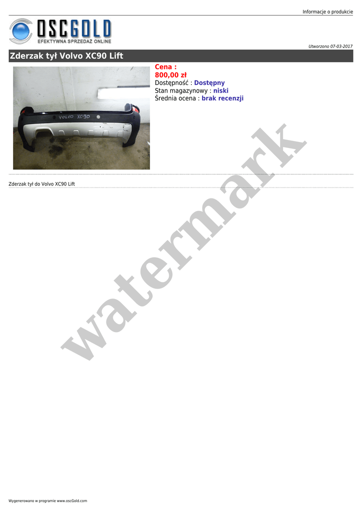 Informacje o produkcie Utworzono 07-03-2017 Zderzak tył Volvo XC90 Lift Cena : 800,00 zł w at Zderzak tył do Volvo XC90 Lift er m ar k Dostępność : Dostępny Stan magazynowy : niski Średnia ocena : brak recenzji Wygenerowano w programie www.oscGold.com