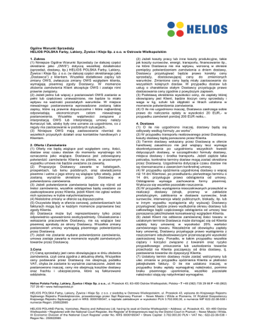 Ogólne Warunki Sprzedaży HELIOS POLSKA Farby, Lakiery, Żywice i Kleje Sp. z o.o. w Ostrowie Wielkopolskim 1. Zakres (1) Niniejsze Ogólne Warunki Sprzedaży (w dalszej części określane jako „OWS”) dotyczą wszelkiej działalności (sprzedaż, dostawy, itp.) HELIOS POLSKA Farby, Lakiery, Żywice i Kleje Sp. z o.o. (w dalszej części określanego jako „Dostawca”) z klientem. Wszelkie dodatkowe zapisy lub zmiany OWS, zwłaszcza zmiany OWS względem klienta, wymagają pisemnej zgody Dostawcy. W momencie złożenia zamówienia Klient akceptuje OWS i zostaje nimi prawnie związany. (2) Jeżeli jedno lub więcej z postanowień OWS zostanie w pełni lub częściowo unieważnione, nie będzie to miało wpływu na ważność pozostałych warunków. W miejsce nieważnego postanowienia wprowadzone zostaną takie zapisy, które są prawnie dopuszczalne i które najbardziej odpowiadają ekonomicznym celom nieważnego postanowienia. Wszelkie wątpliwości związane z interpretacją OWS lub interpretacją umowy należy tłumaczyć tak, ażeby były one uznane za uzgodnione, co z reguły ma zastosowanie w podobnych sytuacjach.. (3) Niniejsze OWS mają zastosowanie również do wszelkich przyszłych działań oraz kontaktów handlowych z Klientem. 2. Oferta i Zamówienie (1) Oferty nie będą wiążące pod względem ceny, ilości, dostaw oraz czasu dostaw do momentu wyraźnego ich oznaczenia jako wiążące. Dostawca jest zobowiązany potwierdzić zamówienie Klienta na piśmie, w przeciwnym wypadku umowa nie będzie uważana za zawartą. (2) Propozycje Dostawcy zawarte w katalogach, prospektach, lub temu podobnych, oraz oświadczenia pisemne i ustne z jego strony są wiążące tylko wtedy, jeżeli zostaną wyraźnie określone przez Dostawcę w potwierdzeniu zamówienia. (3) Jeżeli potwierdzenie zamówienia będzie się różnić od treści zamówienia, wszelkie odstępstwa będą uważane za zaakceptowane przez Klienta, jeżeli Klient nie zgłosi wobec nich sprzeciwu w trybie natychmiastowym. (4) Nieistotne zmiany w ofercie są dopuszczalne. (5) Oczywiste błędy w ofercie cenowej, potwierdzeniach lub fakturach mogą być w każdym momencie poprawiane bez zgody Klienta. (6) Dostawca może być reprezentowany tylko przez odpowiednio upoważnione osoby/podmioty. Oświadczenia i wskazania pracowników Dostawcy, nie są wiążące bez pisemnej aprobaty ze strony Dostawcy. Wszelkie zmiany postanowień umowy wymagają pisemnego potwierdzenia przez Dostawcę. (7) Jeżeli nie zostanie wydane potwierdzenie zamówienia, umowa zostaje zawarta w momencie wysyłki zamówionych towarów przez Dostawcę. 3.Cena (1) Ceną sprzedaży jest cena obowiązująca w dniu złożenia zamówienia, czyli cena zgodna z aktualną ofertą. Wszystkie ceny podawane przez Dostawcę nie obejmują podatku VAT, chyba że zostanie to wyraźnie zaznaczone. Jeżeli nie postanowiono inaczej, ceny nie obejmują kosztów dostawy oraz frachtu i ubezpieczenia, które są fakturowane oddzielnie. (2) Jeżeli koszty pracy lub inne koszty produkcyjne, takie jak koszty surowców, energii, transportu, finansowanie itp., na które Dostawca nie ma wpływu, wzrosną w okresie pomiędzy potwierdzeniem zamówienia a dniem dostawy, Dostawcy przysługiwać będzie prawo korekty ceny sprzedaży, dostosowującej ceny do zmienionych warunków. Zmienione ceny będą miały zastosowanie do wszystkich kolejnych dostaw. W przypadku dostaw lub usług o charakterze stałym Dostawcy przysługuje prawo dostosowania ceny zgodnie z powyższym zapisem. (3) Podstawą określenia wysokości ceny, do zapłaty której obowiązany jest Klient, będzie iloczyn ceny sprzedaży i waga w kg, sztuki lub objętość w litrach ustalona w momencie potwierdzenia zamówienia. (4) O ile nie uzgodniono inaczej, Dostawca zastrzega sobie prawo do naliczenia opłaty w wysokości 20 EUR,- w przypadku zamówień poniżej 200 EUR netto,-. 4. Dostawa (1) O ile nie uzgodniono inaczej, dostawy będą się odbywały według formuły „ex works”. (2) W przypadku transportu realizowanego przez Dostawcę, koszty dostawy będą ponoszone przez Klienta. (3) Termin dostawy wskazany przez Dostawcę w ofercie handlowej zasadniczo nie jest wiążący lecz wymaga skonkretyzowania po uzgodnieniu wszystkich kwestii dotyczących dostawy, w szczególności formuły dostawy, miejsca dostawy i środka transportu. Jeżeli zajdzie taka potrzeba, konkretne terminy dostaw mogą zostać określone przez Dostawcę. Uzgodnienia dotyczące czasu dostaw nie są równoznaczne z zawarciem konkretnej umowy. (4) W przypadku opóźnienia uzgodnionej dostawy o więcej niż 14 dni Klientowi, po przedłużeniu pierwotnego terminu o 14 dni, przysługuje prawo odstąpienia od umowy. Odstąpienie wymaga zachowania formy pisemnej. Wyklucza się wszelkie pozostałe roszczenia. (5) W przypadku wystąpienia nieoczekiwanych przeszkód w realizacji dostawy (strajk, przerwy w zakładzie produkcyjnym, zakłócenia w dostawie surowców, brak surowców, interwencja władz publicznych, blokady, itp. lub w innym wypadku wystąpienia siły wyższej) Dostawcy przysługiwać będzie prawo wydłużenia okresu dostawy lub całkowitego bądź częściowego odstąpienia od umowy bez ponoszenia jakichkolwiek konsekwencji względem Klienta. (6) Jeżeli Klient nie odbierze zamówionej ilości towaru w ustalonym terminie Dostawca może domagać się od Klienta zapłaty kary umownej w wysokości 25% wartości zamówionego towaru. Niezależnie od obowiązku zapłaty kary umownej, Dostawcy przysługuje prawo wystąpienia z roszczeniami odszkodowawczymi przenoszącymi wysokość zastrzeżonej kary. Ponadto, w takim przypadku wszelkie ciężary i korzyści związane z towarem oraz ryzyko przypadkowego zniszczenia lub uszkodzenia towarów przechodzi na Klienta począwszy od dnia dostawy, tj. postawienia towarów do dyspozycji Klienta. (7) Ustalony termin dostawy może zostać wstrzymany lub ulec zmianie w przypadku opóźnienia Klienta w pła