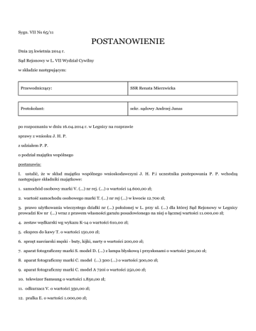 Sygn. VII Ns 65/11 POSTANOWIENIE Dnia 25 kwietnia 2014 r. Sąd Rejonowy w L. VII Wydział Cywilny w składzie następującym: Przewodniczący: SSR Renata Mierzwicka Protokolant: sekr. sądowy Andrzej Janas po rozpoznaniu w dniu 16.04.2014 r. w Legnicy na rozprawie sprawy z wniosku J. H. P. z udziałem P. P. o podział majątku wspólnego postanawia: I. ustalić, że w skład majątku wspólnego wnioskodawczyni J. H. P.i uczestnika postepowania P. P. wchodzą następujące składniki majątkowe: 1. samochód osobowy marki V. (...) nr rej. (...) o wartości 14.600,00 zł; 2. wartość samochodu osobowego marki T. (...) nr rej (...) w kwocie 12.700 zł; 3. prawo użytkowania wieczystego działki nr (...) położonej w L. przy ul. (...) dla której Sąd Rejonowy w Legnicy prowadzi Kw nr (...) wraz z prawem własności garażu posadowionego na niej o łącznej wartości 11.000,00 zł; 4. zestaw wędkarski wg wykazu K-14 o wartości 610,00 zł; 5. ekspres do kawy T. o wartości 150,00 zł; 6. sprzęt narciarski męski - buty, kijki, narty o wartości 200,00 zł; 7. aparat fotograficzny marki S. model D. (...) z lampa błyskową i przysłonami o wartości 300,00 zł; 8. aparat fotograficzny marki C. model (...) 300 (...) o wartości 300,00 zł; 9. aparat fotograficzny marki C. model A 720i o wartości 250,00 zł; 10. telewizor Samsung o wartości 1.850,00 zł; 11. odkurzacz V. o wartości 350,00 zł; 12. pralka E. o wartości 1.000,00 zł; 13. robot kuchenny T. o wartości 450,00 zł; 14. zestaw komputerowy - jednostka centralna z 2 dyskami i kartami rozszerzeń , monitor, mysz, klawiatura o łącznej wartości 510,00 zł; 15. żelazko P. o wartości 50 zł; 16. wersalka o wartości 200,00 zł; 17. dwie sztuki odtwarzaczy DVD o łącznej wartości 100,00 zł 18. akwarela B. M. o wartości 1.000,00 zł; 19. obraz olejny autorstwa K. o wartości 1.000,00 zł; 20. obraz pastelowy autorstwa D. P. o wartości 300,00 zł; 21. wyposażenie mieszkania położonego w L. przy ul. (...)-szafa w zabudowie Komandor, dywany, chodniki ,czajnik elektryczny, pościel, prześcieradło, komplet naczyń o łącznej wartości 1.500,00 zł; 22. rower damski o wartości 100,00 zł; 23. środki zgromadzone w: a. Otwartym Funduszu Emerytalnym w (...) w W. na rachunku wnioskodawczyni - 1.366, (...) jednostek o wartości na 19.12.2010 r.-o wartości 41.468,15 zł; b. Otwartym Funduszu Emerytalnym w (...) w W. na rachunku uczestnika postępowania - (...), (...) jednostek o wartości na 19.12.2010 r.-86.858,79 zł; c. Banku (...) SA we W. na rachunku wnioskodawczyni i uczestnika postępowania nr (...) 0000 0000 2301 (...) w kwocie 37,22 zł; d. Banku (...) SA we W. na rachunku wnioskodawczyni i uczestnika postępowania nr (...) w kwocie 6.935,93 zł; e. (...)SA w W. na subfunduszu uczestnika postępowania obligacje 2 o nr 100-474-926 , 1, (...) jednostek o wartości na 18.12.2010 r. - 4.969,93 zł; f. Banku (...) SA w G. na rachunku uczestnika postepowania nr (...) w kwocie 8.197,56 zł; g. (...) w W. z tytułu grupowego ubezpieczenia na życie uczestnika postępowania na dzień 18.12.2010 r. w kwocie 930,78 zł; h. (...) Bank (...) SA w W. na rachunku wnioskodawczyni o nr (...) w kwocie 1.828,67 zł; i. (...) Banku (...) SA na rachunku uczestnika postępowania o nr (...)- (...) w kwocie 2.821,30 zł; j. postaci dewiz 430 EU o wartości 1.712,99 zł k. postaci dewiz 180 USD o wartości 537,12 zł; l. postaci dewiz 400 CK o wartości 63,40 zł; m. postaci dewiz 55 (...) o wartości 256,44 zł; n. Banku (...) SA w G. na E-lokacie uczestnika postępowania o nr (...) w kwocie 7.585,49 zł; o. Banku (...) SA w G. na E-lokacie uczestnika postępowania o nr (...) w kwocie 6.540,87 zł; p. wartość dochodów z papierów wartościowych w kwocie 2.019,30 zł; q. wartość strat z papierów wartościowych w kwocie 55.138,24 zł; r. wartość lokat terminowych w łącznej kwocie 18.183,74 zł; tj. składniki majątkowe o łącznej wartości 294.605,92 zł (dwieście dziewięćdziesiąt cztery tysiące sześćset pięć złotych 92/100); II. ustalić, że udziały stron w majątku wspólnym są równe; III. ustalić, że strony poczyniły nakłady z majątku wspólnego na majątek odrębny wnioskodawczyni w kwocie 8.398,35 zł; IV. dokonać podziału majątku wspólnego stron po ustaniu między nimi wspólności ustawowej małżeńskiej w po rozwiązaniu ich małżeństwa wyrokiem Sądu Okręgowego w Legnicy z dnia 25.11.2010 r. sygn. akt I RC 1428/10 , w ten sposób że przyznać na wyłączną własność wnioskodawczyni składniki majątkowe opisane w pkt I ppkt 2,5,9-14,16-18,21,23a,23d,23h,23l,23ł o łącznej wartości 70.612,59 zł (siedemdziesiąt tysięcy sześćset dwanaście złotych 59/100), a uczestnikowi postepowania składniki majątkowe opisane w pkt I ppkt 1,3,4,6,8,15,19,20,22,23b,23c,23e,23f,23g,23i,23j,23k,23m,23n,23o,23 p,23 r o łącznej wartości 223.993,33 zł (dwieście dwadzieścia trzy tysiące dziewięćset dziewięćdziesiąt trzy złote 33/100); V. nakazać stronom wzajemne wydanie sobie składników majątkowych przyznanych im na wyłączną własność; VI. zasądzić od uczestnika postępowania na rzecz wnioskodawczyni kwotę 72.491,20 zł (siedemdziesiąt dwa tysiące czterysta dziewięćdziesiąt jeden złotych 20/100) tytułem spłaty udziału w majątku wspólnym oraz rozliczenia nakładów z majątku wspólnego na majątek odrębny wnioskodawczyni; VII. zasądzić od uczestnika postępowania na rzecz wnioskodawczyni kwotę 500,00 zł tytułem zwrotu kosztów postępowania z tym, że koszty zastępstwa procesowego między stronami wzajemnie znieść; VIII. przyznać Bankowi (...) S.A. we W. wynagrodzenie w kwocie 1.390,00 zł tytułem kosztów udzielonych informacji bankowych; IX. oddalić wniosek Banku (...) S.A. we W. o wynagrodzenie w kwocie 2.270,00 zł; X. nakazać wnioskodawczyni i uczestnikowi postępowania aby uiścili na rzecz Skarbu Państwa (Sąd Rejonowy w L.) kwoty po 1.734,16 zł tytu