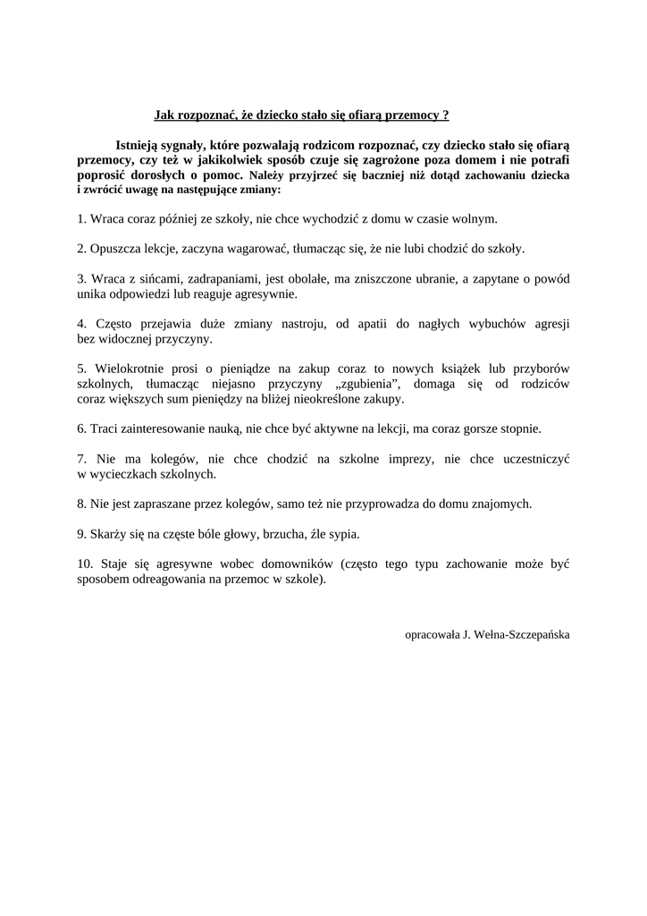 Jak rozpoznać, że dziecko stało się ofiarą przemocy ? Istnieją sygnały, które pozwalają rodzicom rozpoznać, czy dziecko stało się ofiarą przemocy, czy też w jakikolwiek sposób czuje się zagrożone poza domem i nie potrafi poprosić dorosłych o pomoc. Należy przyjrzeć się baczniej niż dotąd zachowaniu dziecka i zwrócić uwagę na następujące zmiany: 1. Wraca coraz później ze szkoły, nie chce wychodzić z domu w czasie wolnym. 2. Opuszcza lekcje, zaczyna wagarować, tłumacząc się, że nie lubi chodzić do szkoły. 3. Wraca z sińcami, zadrapaniami, jest obolałe, ma zniszczone ubranie, a zapytane o powód unika odpowiedzi lub reaguje agresywnie. 4. Często przejawia duże zmiany nastroju, od apatii do nagłych wybuchów agresji bez widocznej przyczyny. 5. Wielokrotnie prosi o pieniądze na zakup coraz to nowych książek lub przyborów szkolnych, tłumacząc niejasno przyczyny „zgubienia”, domaga się od rodziców coraz większych sum pieniędzy na bliżej nieokreślone zakupy. 6. Traci zainteresowanie nauką, nie chce być aktywne na lekcji, ma coraz gorsze stopnie. 7. Nie ma kolegów, nie chce chodzić na szkolne imprezy, nie chce uczestniczyć w wycieczkach szkolnych. 8. Nie jest zapraszane przez kolegów, samo też nie przyprowadza do domu znajomych. 9. Skarży się na częste bóle głowy, brzucha, źle sypia. 10. Staje się agresywne wobec domowników (często tego typu zachowanie może być sposobem odreagowania na przemoc w szkole). opracowała J. Wełna-Szczepańska