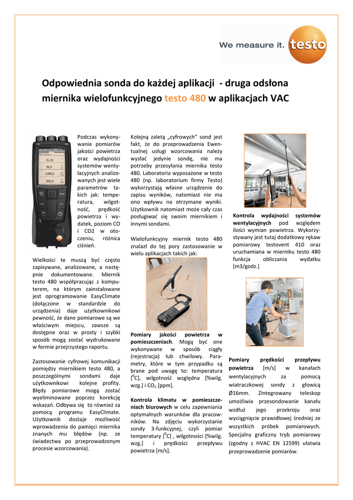 Odpowiednia sonda do każdej aplikacji - druga odsłona miernika wielofunkcyjnego testo 480 w aplikacjach VAC Podczas wykonywania pomiarów jakości powietrza oraz wydajności systemów wentylacyjnych analizowanych jest wiele parametrów takich jak: temperatura, wilgotność, prędkość powietrza i wydatek, poziom CO i CO2 w otoczeniu, różnica ciśnień. Wielkości te muszą być często zapisywane, analizowane, a następnie dokumentowane. Miernik testo 480 współpracując z komputerem, na którym zainstalowane jest oprogramowanie EasyClimate (dołączone w standardzie do urządzenia) daje użytkownikowi pewność, że dane pomiarowe są we właściwym miejscu, zawsze są dostępne oraz w prosty i szybki sposób mogą zostać wydrukowane w formie przejrzystego raportu. Zastosowanie cyfrowej komunikacji pomiędzy miernikiem testo 480, a poszczególnymi sondami daje użytkownikowi kolejne profity. Błędy pomiarowe mogą zostać wyeliminowane poprzez korekcję wskazań. Odbywa się to również za pomocą programu EasyClimate. Użytkownik dostaje możliwość wprowadzenia do pamięci miernika znanych mu błędów (np. ze świadectwa po przeprowadzonym procesie wzorcowania). Kolejną zaletą „cyfrowych” sond jest fakt, że do przeprowadzenia Ewentualnej usługi wzorcowania należy wysłać jedynie sondę, nie ma potrzeby przesyłania miernika testo 480. Laboratoria wyposażone w testo 480 (np. laboratorium firmy Testo) wykorzystają własne urządzenie do zapisu wyników, natomiast nie ma ono wpływu na otrzymane wyniki. Użytkownik natomiast może cały czas posługiwać się swoim miernikiem i innymi sondami. Wielofunkcyjny miernik testo 480 znalazł do tej pory zastosowanie w wielu aplikacjach takich jak: Pomiary jakości powietrza w pomieszczeniach. Mogą być one wykonywane w sposób ciągły (rejestracja) lub chwilowy. Parametry, które w tym przypadku są brane pod uwagę to: temperatura 0 [ C], wilgotność względna [%wilg. wzg.] i CO2 [ppm]. Kontrola klimatu w pomieszczeniach biurowych w celu zapewniania optymalnych warunków dla pracowników. Na zdjęciu wykorzystanie sondy 3-funkcyjnej, czyli pomiar 0 temperatury [ C] , wilgotności [%wilg. wzg.] i prędkości przepływu powietrza [m/s]. Kontrola wydajności systemów wentylacyjnych pod względem ilości wymian powietrza. Wykorzystywany jest tutaj dodatkowy rękaw pomiarowy testovent 410 oraz uruchamiana w mierniku testo 480 funkcja obliczania wydatku [m3/godz.] Pomiary prędkości przepływu powietrza [m/s] w kanałach wentylacyjnych za pomocą wiatraczkowej sondy z głowicą Ø16mm. Zintegrowany teleskop umożliwia przesondowanie kanału wzdłuż jego przekroju oraz wyciągnięcie prawidłowej średniej ze wszystkich próbek pomiarowych. Specjalny graficzny tryb pomiarowy (zgodny z HVAC EN 12599) ułatwia przeprowadzenie pomiarów. Niezależnie od podłączonej sondy oraz trybu pomiarowego, przeprowadzenie pomiaru jest wyjątkowo proste. Miernik testo 480 prowadzi użytkownika „krok po kroku” co pozwala zaoszczędzić czas i koszty. Przyrząd charakteryzuje się nowoczesnym wyglądem i najnowszą technologią „made in Germany”. Jednakże w celu rozszerzenia funkcjonalności, firma Testo wprowadziła do oferty kolejne sondy wykorzystujące dostępne metody pomiarowe. Tym samym testo 480 stało się urządzeniem, które jest wszystkim, czego potrzebuje użytkownik. Składają się na niego: poczerniony termometr kulisty, termometr „mokry”, termometr „suchy” oraz statyw. Pomiary przepływu w kanałach wentylacyjnych za pomocą termoanemometrycznej sondy opartej na „grzanej kulce”. Jest to sonda o bezkierunkowej charakterystyce, dzięki czemu pomiary stają się jeszcze prostsze. Pomiary przepływu powietrza w dygestoriach za pomocą sondy termoanemometrycznej spełniającej wymagania normy EN 14175-3 /-4 Pomiary komfortu cieplnego na stanowiskach pracy za pomocą zestawu sond WBGT. Pomiary komfortu cieplnego PMV (Preducted Mean Vote) oraz PPD (Predicted Percentage Dissatisfied) za pomocą następującego zestawu sond: poczerniony termometr kulisty, sonda temperatury i wilgotności powietrza oraz sonda poziomu turbulencji. Miernik testo 480 jest w tym momencie jedynym na świecie przyrządem, który kalkuluje obydwa parametry (PMV i PPD) bez udziału dodatkowego, specjalistycznego programowania. Wynik pomiaru jest przedstawiany bezpośrednio na wyświetlaczu, natomiast program EasyClimate umożliwia sporządzenie raportu z pomiarów. Pracownicy firmy Testo, będący od wielu lat partnerem profesjonalistów w dziedzinie klimatyzacji i wentylacji na całym świecie, doskonale zdają sobie sprawę z potrzeb specjalistów tej branży i wyzwań, którym muszą stawić czoła. Wiedze tę wykorzystano w praktyce, tworząc miernik testo 480. Testo Sp. z o.o.