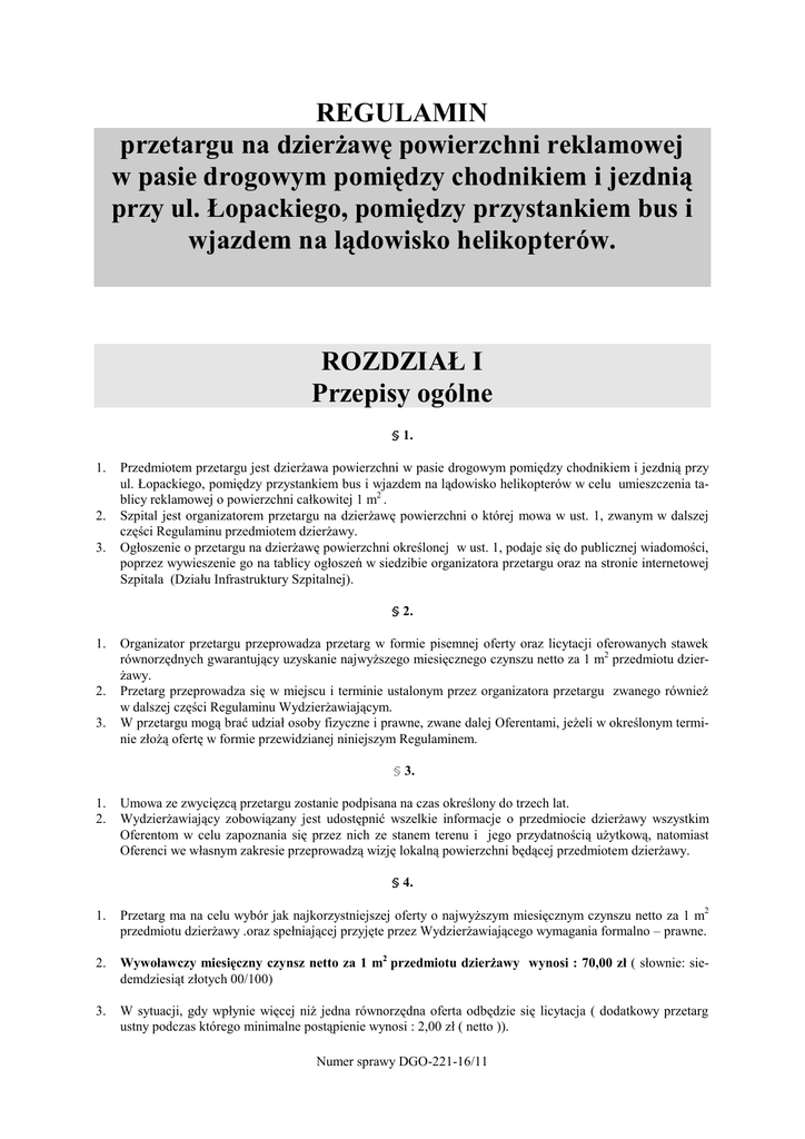 REGULAMIN przetargu na dzierżawę powierzchni reklamowej w pasie drogowym pomiędzy chodnikiem i jezdnią przy ul. Łopackiego, pomiędzy przystankiem bus i wjazdem na lądowisko helikopterów. ROZDZIAŁ I Przepisy ogólne § 1. 1. 2. 3. Przedmiotem przetargu jest dzierżawa powierzchni w pasie drogowym pomiędzy chodnikiem i jezdnią przy ul. Łopackiego, pomiędzy przystankiem bus i wjazdem na lądowisko helikopterów w celu umieszczenia tablicy reklamowej o powierzchni całkowitej 1 m2 . Szpital jest organizatorem przetargu na dzierżawę powierzchni o której mowa w ust. 1, zwanym w dalszej części Regulaminu przedmiotem dzierżawy. Ogłoszenie o przetargu na dzierżawę powierzchni określonej w ust. 1, podaje się do publicznej wiadomości, poprzez wywieszenie go na tablicy ogłoszeń w siedzibie organizatora przetargu oraz na stronie internetowej Szpitala (Działu Infrastruktury Szpitalnej). § 2. 1. 2. 3. Organizator przetargu przeprowadza przetarg w formie pisemnej oferty oraz licytacji oferowanych stawek równorzędnych gwarantujący uzyskanie najwyższego miesięcznego czynszu netto za 1 m2 przedmiotu dzierżawy. Przetarg przeprowadza się w miejscu i terminie ustalonym przez organizatora przetargu zwanego również w dalszej części Regulaminu Wydzierżawiającym. W przetargu mogą brać udział osoby fizyczne i prawne, zwane dalej Oferentami, jeżeli w określonym terminie złożą ofertę w formie przewidzianej niniejszym Regulaminem. § 3. 1. 2. Umowa ze zwycięzcą przetargu zostanie podpisana na czas określony do trzech lat. Wydzierżawiający zobowiązany jest udostępnić wszelkie informacje o przedmiocie dzierżawy wszystkim Oferentom w celu zapoznania się przez nich ze stanem terenu i jego przydatnością użytkową, natomiast Oferenci we własnym zakresie przeprowadzą wizję lokalną powierzchni będącej przedmiotem dzierżawy. § 4. 1. Przetarg ma na celu wybór jak najkorzystniejszej oferty o najwyższym miesięcznym czynszu netto za 1 m2 przedmiotu dzierżawy .oraz spełniającej przyjęte przez Wydzierżawiającego wymagania formalno – prawne. 2. Wywoławczy miesięczny czynsz netto za 1 m2 przedmiotu dzierżawy wynosi : 70,00 zł ( słownie: siedemdziesiąt złotych 00/100) 3. W sytuacji, gdy wpłynie więcej niż jedna równorzędna oferta odbędzie się licytacja ( dodatkowy przetarg ustny podczas którego minimalne postąpienie wynosi : 2,00 zł ( netto )). Numer sprawy DGO-221-16/11 4. W sytuacji, gdy wpłynie tylko jedna ważna oferta, Wydzierżawiający zobowiązuje się do zawarcia umowy dzierżawy z tym Oferent § 5. 1. 2. 1. 2. Czynsz dzierżawny wyliczony zgonie z § 4 regulaminu płatny będzie miesięcznie „z góry” do 10 dnia każdego miesiąca, na podstawie faktury VAT wystawionej przez Wydzierżawiającego do 5-tego dnia każdego miesiąca. Od pierwszego stycznia każdego następnego roku miesięczny czynsz netto za 1 m2 będzie waloryzowany raz w roku, zgodnie z opublikowanym na początku roku przez GUS wskaźnikiem cen towarów i usług konsumpcyjnych nie żywnościowych za poprzedni rok ( w związku z tym, że wskaźnik GUS jest publikowany pod koniec stycznia, faktura za miesiąc styczeń zostanie wystawiona wg poprzedniej stawki czynszu , a waloryzacja nastąpi na podstawie faktury korygującej ). § 6. Wydzierżawiający zezwala Dzierżawcy na umieszczenie tablicy reklamowej zgodnej z wzorem graficznym i z materiałów opisanych w złożonej ofercie. Zwycięzca przetargu gwarantuje, że przedmiot dzierżawy będzie wykorzystywany zgodnie z przeznaczeniem i warunkami umowy. § 7. 1. 2. 3. 4. Przed podpisaniem umowy dzierżawy zwycięzca przetargu zobowiązany jest wnieść Wydzierżawiającemu kaucję ( w formie gotówki lub weksla in blanco ) w wysokości trzykrotnego ustalonego przetargiem czynszu dzierżawnego ( brutto ) za przedmiot dzierżawy Z wyjątkiem przypadku, o którym mowa w ust. 3 kaucja może być zaliczona na poczet miesięcznego czynszu dzierżawnego brutto za ostatnie trzy miesiące. W przypadku gdy Dzierżawca zalega z zapłatą czynszu dzierżawnego przez kolejne dwa miesiące Wydzierżawiający uprawniony jest do zatrzymania wniesionej kaucji. Wniesiona kaucja w formie gotówki, pomniejszona o ewentualne należności i koszty obsługi bankowej oraz powiększona o odsetki będzie zwrócona w terminie jednego miesiąca po zakończeniu umowy i obustronnym podpisaniu protokołu zdawczo – odbiorczego. § 8. 1 2 1. 2. Zwycięzca przetargu lub jedyny oferent , który złożył ofertę zobowiązany jest zawrzeć umowę dzierżawy w terminie do 14 dni od daty ogłoszenia o wyborze oferty, pod rygorem utraty wadium i utraty prawa do zawarcia umowy. W przypadku nie zawarcia umowy ze zwycięzcą przetargu lub jedynym Oferentem w terminie określonym w ust. 1 Wydzierżawiający może do 7 dni zawrzeć umowę z Oferentem, którego oferta będzie druga w kolejności najkorzystniejsza. § 9. Inne zasady dotyczące przetargu nie ujęte niniejszym regulaminem określa Wydzierżawiający. Bez podania przyczyn, Wydzierżawiający może odstąpić od przeprowadzenia przetargu lub unieważnić go na każdym etapie. W powyższej sytuacji Wydzierżawiający niezwłocznie zwróci wpłacone przez Oferentów wadium. Numer sprawy : DGO-221-16/11 ROZDZIAŁ II Przetarg pisemny § 10. 1. Ogłoszenie o przetargu zawiera : a ) opis przedmiotu dzierżawy, b) termin i miejsce przetargu, c) wywoławczy miesięczny czynsz netto za 1 m2 przedmiotu dzierżawy d) wysokość wadium § 11. 1. 2. 3. 4. 5. 6. 7. 8. 9. Ofertę złożoną w formie pisemnej należy sporządzić w języku polskim na maszynie do pisania, komputerze lub nieścieralnym atramentem. Oferta powinna być podpisana przez Oferenta, a każda strona oferty zaparafowana. Kopie dokumentów muszą być opatrzone klauzulą „potwierdzam za zgodność z oryginałem” i podpisane czytelnie przez upoważnioną osobę. Oferent, który dostarczy nieprawdziwe informacje zostanie wykluczon