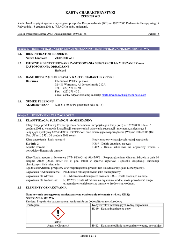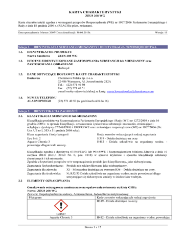 KARTA CHARAKTERYSTYKI ZEUS 208 WG Karta charakterystyki zgodna z wymogami przepisów Rozporządzenia (WE) nr 1907/2006 Parlamentu Europejskiego i Rady z dnia 18 grudnia 2006 r. (REACH)z późn. zmianami. Data sporządzenia: Marzec 2007/ Data aktualizacji: 30.06.2015r. Sekcja 1. Wersja: 15 IDENTYFIKACJA SUBSTANCJI/MIESZANINY I IDENTYFIKACJA PRZEDSIĘBIORSTWA 1.1. IDENTYFIKATOR PRODUKTU Nazwa handlowa ZEUS 208 WG 1.2. ISTOTNE ZIDENTYFIKOWANE ZASTOSOWANIA SUBSTANCJI lub MIESZANINY oraz ZASTOSOWANIA ODRADZANE Herbicyd 1.3. DANE DOTYCZĄCE DOSTAWCY KARTY CHARAKTERYSTYKI Dostawca Cheminova Polska Sp. z o.o. 02-486 Warszawa, Al. Jerozolimskie 212A Tel.: (22) 571 40 50 Fax: (22) 571 40 51 e-mail osoby odpowiedzialnej za kartę: [email protected] 1.4. NUMER TELEFONU ALARMOWEGO (22) 571 40 50 (w godzinach od 8 do 16) Sekcja 2. 2.1. IDENTYFIKACJA ZAGROŻEŃ KLASYFIKACJA SUBSTANCJI lub MIESZANINY Klasyfikacja produktu wg Rozporządzenia Parlamentu Europejskiego i Rady (WE) nr 1272/2008 z dnia 16 grudnia 2008 r. w sprawie klasyfikacji, oznakowania i pakowania substancji i mieszanin, zmieniające i uchylające dyrektywy 67/548/EWG i 1999/45/WE oraz zmieniające rozporządzenie (WE) nr 1907/2006 (Dz. Urz. UE nr L 353 z 31 grudnia 2008 roku). Klasa zagrożenia i kody kategorii Kody zwrotów wskazujących rodzaj zagrożenia Eye Irrit. 2 H319 - Działa drażniąco na oczy Aquatic Chronic 3 H412 - Działa szkodliwie na organizmy wodne. powodując długotrwałe zmiany. 2.2 Klasyfikacja zgodna z dyrektywą 67/548/EWG lub 99/45/WE i Rozporządzeniem Ministra Zdrowia z dnia 10 sierpnia 2012r (Dz.U. 2012r Nr. 0, poz. 1018) w sprawie kryteriów i sposobu klasyfikacji substancji chemicznych i ich mieszanin. Zgodnie z kryteriami przepisów w/w rozporządzenia produkt jest klasyfikowany, jako niebezpieczny. Zagrożenia fizykochemiczne: Produkt nie zaklasyfikowano jako niebezpieczny. Zagrożenia dla zdrowia: Xi – Mieszanina drażniąca ze zwrotem R36 – Działa drażniąco na oczy. Zagrożenia dla środowiska: N; R52/53 Działa szkodliwie na organizmy wodne; może powodować długo utrzymujące się niekorzystne zmiany w środowisku wodnym. ELEMENTY OZNAKOWANIA Oznakowanie ostrzegawcze zamieszczane na opakowaniu (elementy etykiety GHS): Nazwa: ZEUS 208 WG Zawiera: Propoksykarbazon sodowy, Amidosulfuron, Jodosulfuron metylosodowy Piktogram Kody zwrotów wskazujących rodzaj zagrożenia H319 - Działa drażniąco na oczy. GHS07 Aquatic Chronic 3 H412 - Działa szkodliwie na organizmy wodne, powodując Strona 1 z 12 KARTA CHARAKTERYSTYKI ZEUS 208 WG Karta charakterystyki zgodna z wymogami przepisów Rozporządzenia (WE) nr 1907/2006 Parlamentu Europejskiego i Rady z dnia 18 grudnia 2006 r. (REACH)z późn. zmianami. Data sporządzenia: Marzec 2007/ Data aktualizacji: 30.06.2015r. Wersja: 15 długotrwałe zmiany. Uwaga EUH401: W celu uniknięcia zagrożeń dla zdrowia ludzi i środowiska, należy postępować zgodnie z instrukcją użycia. P101 – W razie konieczności zasięgnięcia porady lekarza, należy pokazać pojemnik lub etykietę P102 - Chronić przed dziećmi Zwroty wskazujące środki ostrożności. Zapobieganie: P261 P280 P273 Reagowanie P302 + P352 P363 Unikać wdychania par Stosować rękawice ochronne Unikać uwolnienia do środowiska W PRZYPADKU DOSTANIA SIĘ NA SKORĘ: Umyć dużą ilością wody z mydłem. Wyprać zanieczyszczoną odzież przed ponownym użyciem. Przechowywanie Usuwanie: P501 Zawartość/pojemnik usuwać zgodnie z miejscowymi przepisami. W celu uniknięcia zagrożeń dla zdrowia ludzi i środowiska, należy postępować zgodnie z instrukcją użycia. 2.3. INNE ZAGROŻENIA Produkt nie zawiera składników PBT lub vPvB. Sekcja 3. 3.1. 3.2. SKŁAD/INFORMACJA O SKŁADNIKACH Substancja – Produkt nie jest substancją. MIESZANINA - Charakterystyka chemiczna Mieszanina Produkt zawiera substancję aktywną, sulkotrion techniczny, emulgatory, adjuwanty, wodę i niżej wyszczególnione składniki. Łączna masa emulgatorów i dodatków wynosi 74% wagowo. Strona 2 z 12 KARTA CHARAKTERYSTYKI ZEUS 208 WG Karta charakterystyki zgodna z wymogami przepisów Rozporządzenia (WE) nr 1907/2006 Parlamentu Europejskiego i Rady z dnia 18 grudnia 2006 r. (REACH)z późn. zmianami. Data sporządzenia: Marzec 2007/ Data aktualizacji: 30.06.2015r. Numer CAS Numer WE Numer Indeksowy 181274-157 - 011-00700-3 120923-377 407-380-0 64742-94-5 265-198-5 649-42500-9 Wersja: 15 Nazwa składnika % (m/m) Propoksykarbazon sodowy 10-20 Klasyfikacja N; R50/53 Amidosulfuron 5-10 Solwent nafta (ropa naftowa), węglowodory ciężkie aromatyczne; Frakcja naftowa - niepecyfikowana 5-10 Aquatic Chronic1 H410, Acute 1 H400 R52/53, Aquatic Chronic3 H412 Xn- R65, N; R51/53, R66, Nota H Asp. Tox. 1-H304, 2-H411, EUH066, 144550-367 - 616-10800-1 jodosulfuron metylosodowy Aquatic Aquatic Chronic 1 N; R50/53 Aquatic Chronic1 H410, Acute 1 H400 135590-919 - - Mefenpir dietylu 2-5 Aquatic N; R51/53 Aquatic Chronic2 H411 SKŁADNIKI NIEBEZPIECZNE Znaczenie zwrotów R i H – patrz sekcja 16 Substancje (inne niż wymienione w 3.2), dla których ustalono wspólnotowe najwyższe dopuszczalne stężenia w środowisku pracy Brak. Substancje PBT / vPvB Produkt nie zawiera substancji zliczonych do PBT i vPvB. Sekcja 4. 4.1. ŚRODKI PIERWSZEJ POMOCY OPIS ŚRODKÓW PIERWSZEJ POMOCY Zalecenia ogólne W przypadku narażenia nie czekaj do chwili ujawnienia się jakichkolwiek objawów. Niezwłocznie wyprowadź osobę poszkodowaną na świeże powietrze i wykonaj opisane poniżej procedury. Zdjąć niezwłocznie zanieczyszczoną odzież i starannie umyć zanieczyszczoną skórę. Strona 3 z 12 KARTA CHARAKTERYSTYKI ZEUS 208 WG Karta charakterystyki zgodna z wymogami przepisów Rozporządzenia (WE) nr 1907/2006 Parlamentu Europejskiego i Rady z dnia 18 grudnia 2006 r. (REACH)z późn. zmianami. Data sporządzenia: Marzec 2007/ Data aktualizacji: 30.06.2015r. Wersja: 15 Kontakt z okiem Przy podwiniętych powiekach natychmiast przemyć oczy dużą ilo