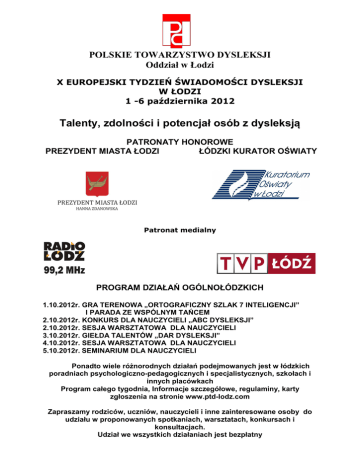 POLSKIE TOWARZYSTWO DYSLEKSJI Oddział w Łodzi X EUROPEJSKI TYDZIEŃ ŚWIADOMOŚCI DYSLEKSJI W ŁODZI 1 -6 października 2012 Talenty, zdolności i potencjał osób z dysleksją PATRONATY HONOROWE PREZYDENT MIASTA ŁODZI ŁÓDZKI KURATOR OŚWIATY Patronat medialny PROGRAM DZIAŁAŃ OGÓLNOŁÓDZKICH 1.10.2012r. GRA TERENOWA „ORTOGRAFICZNY SZLAK 7 INTELIGENCJI” I PARADA ZE WSPÓLNYM TAŃCEM 2.10.2012r. KONKURS DLA NAUCZYCIELI „ABC DYSLEKSJI” 2.10.2012r. SESJA WARSZTATOWA DLA NAUCZYCIELI 3.10.2012r. GIEŁDA TALENTÓW „DAR DYSLEKSJI” 4.10.2012r. SESJA WARSZTATOWA DLA NAUCZYCIELI 5.10.2012r. SEMINARIUM DLA NAUCZYCIELI Ponadto wiele różnorodnych działań podejmowanych jest w łódzkich poradniach psychologiczno-pedagogicznych i specjalistycznych, szkołach i innych placówkach Program całego tygodnia, Informacje szczegółowe, regulaminy, karty zgłoszenia na stronie www.ptd-lodz.com Zapraszamy rodziców, uczniów, nauczycieli i inne zainteresowane osoby do udziału w proponowanych spotkaniach, warsztatach, konkursach i konsultacjach. Udział we wszystkich działaniach jest bezpłatny