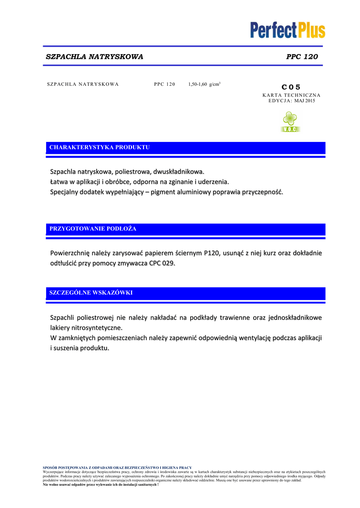 SZPACHLA NATRYSKOWA S Z P AC H L A N A T R Y S K O W A PPC 120 PPC 120 1,50-1,60 g/cm3 C05 K A R T A T E C H N IC Z N A E D Y C J A : MAJ 2015 CHARAKTERYSTYKA PRODUKTU Szpachla natryskowa, poliestrowa, dwuskładnikowa. Łatwa w aplikacji i obróbce, odporna na zginanie i uderzenia. Specjalny dodatek wypełniający – pigment aluminiowy poprawia przyczepność. PRZYGOTOWANIE PODŁOŻA Powierzchnię należy zarysować papierem ściernym P120, usunąć z niej kurz oraz dokładnie odtłuścić przy pomocy zmywacza CPC 029. SZCZEGÓLNE WSKAZÓWKI Szpachli poliestrowej nie należy nakładać na podkłady trawienne oraz jednoskładnikowe lakiery nitrosyntetyczne. W zamkniętych pomieszczeniach należy zapewnić odpowiednią wentylację podczas aplikacji i suszenia produktu. SPOSÓB POSTĘPOWANIA Z ODPADAMI ORAZ BEZPIECZEŃSTWO I HIGIENA PRACY Wyczerpujące informacje dotyczące bezpieczeństwa pracy, ochrony zdrowia i środowiska zawarte są w kartach charakterystyk substancji niebezpiecznych oraz na etykietach poszczególnych produktów. Podczas pracy należy używać zalecanego wyposażenia ochronnego. Po zakończonej pracy należy dokładnie umyć narzędzia przy pomocy odpowiedniego środka myjącego. Odpady produktów wodorozcieńczalnych i produktów zawierających rozpuszczalniki organiczne należy składować oddzielnie. Muszą one być usuwane przez uprawniony do tego zakład. Nie wolno usuwać odpadów przez wylewanie ich do instalacji sanitarnych ! SZPACHLA NATRYSKOWA CHARAKTERYSTYKA PPC 120 GRUBOŚĆ SUCHEJ poliester POWŁOKI do 500 μm CZAS ODPAROWANIA WYGLĄD w 20°C KOLOR ZAWARTOŚĆ LZO PYŁOSUCHOŚĆ szary metaliczny w 23°C 60 min SUCHY W DOTYKU 239 g/l w 20°C GOTOWY DO STOSUNEK MIESZANIA WAGOWY szpachla utwardzacz 100 5 MONTAŻU w 20°C CETOX 40 OE 120 min WYSUSZONY OBJĘTOŚCIOWY CZAS PRZYDATNOŚCI DO UŻYCIA w 23°C NASTĘPNA POWŁOKA 40 min „mokro na mokro” LEPKOŚĆ ROBOCZA SZLIFOWANIE RĘCZNE w 20°C NA SUCHO P120 P150-P240 SZLIFOWANIE RĘCZNE DYSZA PISTOLETU GRAWITACYJNEGO w 23°C CAŁKOWICIE STOSUNEK MIESZANIA 1,8-2,2 NA MOKRO SZLIFOWANIE DYSZA PISTOLETU MECHANICZE NA PODCIŚNIENIOWEGO SUCHO SZLIFOWANIE CIŚNIENIE POWIETRZA 3-4 bar MECHANICZE NA MOKRO LICZBA POWŁOK WYDAJNOŚĆ APLIKACJA SZPACHLI MAGAZYNOWANIE 12 miesięcy w suchym i chłodnym miejscu PRODUKT PRZEZNACZONY TYLKO DO UŻYTKU PROFESJONALNEGO ! Podane informacje są jedynie wskazówką do prawidłowego zastosowania produktu. Wszystkie osoby stosujące niniejszy produkt bez uprzedniego zapoznania się z dalszymi informacjami i profesjonalnego przeszkolenia, czynią na własne ryzyko. Firma PRONET COLOR Sp. z o.o. nie ponosi w takim przypadku żadnej odpowiedzialności za powstający efekt końcowy oraz szkody spowodowane niewłaściwym użyciem produktu. Zawarte w niniejszej karcie informacje mogą być na bieżąco uaktualniane zgodnie z naszą dewizą stałego udoskonalania produktu. Podane w niniejszej karcie parametry stosowania produktu są zależne od czynników zewnętrznych, takich jak: temperatura otoczenia, wilgotność, grubość aplikowanych warstw oraz parametrów pracy kabiny. Pronet-Color Sp. z o.o. Turkusowa 12A 81-158 Gdynia TEL. 58 625 09 99 FAX 58 665 39 99 E-MAIL [email protected]