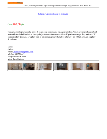 Dane pochodzą ze strony: http://www.ogloszenia-kielce.pl/. Wygenerowano dnia: 07-03-2017. ładne nowe mieszkanie w centrum Cena:900,00 pln wynajmę spokojnym osobą nowe 3 pokojowe mieszkanie na Jagiellońskiej. Umeblowana (obecnie brak lodówki) kuchnia i łazienka. Inne pokoje nieumeblowane- możliwość podstawowego doposażenia. W oknach rolety dzień-noc. Opłaty 900 zł czynszu najmu w tym tv i internet+ ok 400 zł czynszu i opłaty licznikowe. Dane: Judyta email: [email protected] telefon: 696378449 Miejscowość: Kielce ulica: Jagiellońska