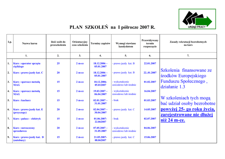 PLAN SZKOLEŃ na I półrocze 2007 R. ilość osób do przeszkolenia Orientacyjny czas szkolenia Terminy zapisów Wymogi stawiane kandydatom Przewidywany termin rozpoczęcie Zasady rekrutacji bezrobotnych na kurs 1. 2. 3. 4. 5. 6. 7. 1. Kurs : operator sprzętu ciężkiego 25 2 m-ce 18.12.2006 – 05.01.2007 - prawo jazdy kat. B 22.01.2007 2. Kurs : prawo jazdy kat. C 20 2 m-ce 18.12.2006 – 05.01.2007 - prawo jazdy kat. B 22..01.2007 3. Kurs : spawacz metodą MAG 15 2 m-ce 18.12.200605.012007 - wykształcenie zawodowe lub średnie 01.02.2007 4. Kurs : spawacz metodą MAG 15 2 m-ce 19.03.2007 – 06.04.2007 - wykształcenie zawodowe lub średnie 16.04.2007 5. Kurs : kucharz 15 3 m-ce 02.01.2007 – 31.01.2007 - brak 01.03.2007 6. Kurs : prawo jazdy kat. E (przyczepy) 20 2 m-ce 02.04.2007 – 30.04.2007 - prawo jazdy kat. C 14.05.2007 7. Kurs : palacz – elektryk 15 2 m-ce 01.06.200722.062007 - brak 02.07.2007 8. Kurs : nowoczesny sprzedawca 20 2 m-ce 07.05.2007 – 31.05.2007 - wykształcenie zawodowe lub średnie 04.06.2007 9. Kurs : prawo jazdy kat. D (autobusy) 15 2 m-ce 21.05.200708.062007 - prawo jazdy kat. C 15.06.2007 Lp. Nazwa kursu Szkolenia finansowane ze środków Europejskiego Funduszu Społecznego , działanie 1.3 W szkoleniach tych mogą bać udział osoby bezrobotne powyżej 25- go roku życia, zarejestrowane nie dłużej niż 24 m-ce. 10. Kurs : ABC własnego biznesu 50 1 m-c 18.12.2006 – 31.05.2007 Rozpoczęcie działalności gospodarczej po szkoleniu 01.02.2007 01.03.2007 02.04.2007 07.05.2007 01.06.2007 11. Kurs : kierowca wózków widłowych 20 2 m-ce 02.01.2007 – 31.01.2007 - prawo jazdy kat. B 15.02.2007 12. Kurs : piekarz – ciastkarz 10 3 m-ce 18.12.2006 – 22.01.2007 - brak 19.02.2007 13. Kurs : prawo jazdy kat. C 20 2 m-ce 21.05.2007 – 15.06.2007 - prawo jazdy kat. B 02.07.2007 14. Kurs : operator sprzętu ciężkiego 20 2 m-ce 01.02.2007 – 21.02.2007 - prawo jazdy kat. B 05.03.2007 15. Kurs : ABC własnego biznesu 20 1 m-c 02.01.2007 – 31.03.2007 Rozpoczęcie działalności gospodarczej po szkoleniu 01.02.2007 02.04.2007 16. Kurs : ABC własnego biznesu 20 1 m-c 04.12.2006 – 31.01.2007 Rozpoczęcie działalności gospodarczej po szkoleniu 08.01.2007 05.02.2007 17. Kurs : księgowość komputerowa 15 04.12.2006 – 05.01.2007 - wykształcenie średnie lub wyższe 18. Kurs : nowoczesny sprzedawca 20 04.12.2006 – 05.01.2007 - wykształcenie średnie lub wyższe 2 m-ce 2 m-ce Szkolenia finansowane ze środków Europejskiego Funduszu Społecznego , działanie 1.2 W szkoleniach tych mogą brać udział osoby bezrobotne do 25 roku życia zarejestrowane nie dłużej niż 24 miesiące. Szkolenia finansowane ze środków Europejskiego Funduszu Społecznego , działanie 1.6 15.01.2007 15.01.2007 W szkoleniach tych mogą brać udział osoby bezrobotne – kobiety ZAPISY W POKOJU 02 (piwnica)
