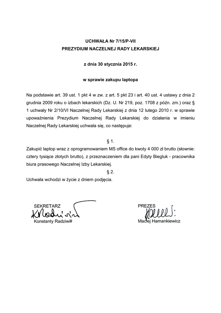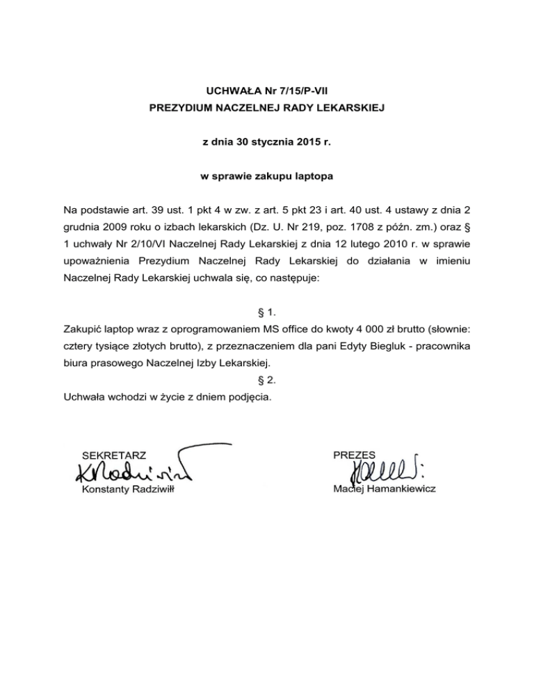 UCHWAŁA Nr 7/15/P-VII PREZYDIUM NACZELNEJ RADY LEKARSKIEJ z dnia 30 stycznia 2015 r. w sprawie zakupu laptopa Na podstawie art. 39 ust. 1 pkt 4 w zw. z art. 5 pkt 23 i art. 40 ust. 4 ustawy z dnia 2 grudnia 2009 roku o izbach lekarskich (Dz. U. Nr 219, poz. 1708 z późn. zm.) oraz § 1 uchwały Nr 2/10/VI Naczelnej Rady Lekarskiej z dnia 12 lutego 2010 r. w sprawie upoważnienia Prezydium Naczelnej Rady Lekarskiej do działania w imieniu Naczelnej Rady Lekarskiej uchwala się, co następuje: § 1. Zakupić laptop wraz z oprogramowaniem MS office do kwoty 4 000 zł brutto (słownie: cztery tysiące złotych brutto), z przeznaczeniem dla pani Edyty Biegluk - pracownika biura prasowego Naczelnej Izby Lekarskiej. § 2. Uchwała wchodzi w życie z dniem podjęcia.