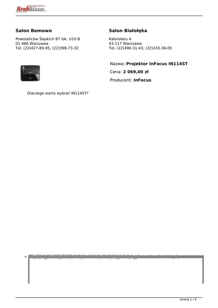 Salon Bemowo Salon Białołęka Powstańców Śląskich 87 lok. U10 B 01-466 Warszawa Tel. (22)427-89-95, (22)398-73-32 Kabrioletu 4 03-117 Warszawa Tel. (22)490-31-43, (22)243-36-05 Nazwa: Projektor InFocus IN114ST Cena: 2 069,00 zł Producent: InFocus Dlaczego warto wybrać IN114ST? Atrakcyjna Duża Obiektyw Wysoka Rozdzielczość Kompaktowa Dokładne Wsparcie BrilliantColor™ żywotność rozdzielczość 3D typu i żywe cena przy budowa XGA short-throw lampy odwzorowanie 120 i-Hz niska aż 4000:1 częstotliwości do (krótkiego waga 6,000 kolorów (2.17 godzin rzutu) wyświetlania poprzez kg) technologię klatek strona 1 / 4 Znakomita technologia projekcji obrazu wysoka jasność i duży kontrast 2500 Współczynnik Dobrej Wbudowane ciemniejszymi technologi ścianie, lumenów jakości kolorowej InFocus tryby kontrastu zdjęcia ciemnymi zapewnia wyświetlania powierzchni, BrilliantColor i żywe ojasny, odcieniami wysokości kolory czysty tablicy dająpoprzez 4000:1 inajlepszą jaśniejszymi obraz lub innej DLP® ratio przy jakość płaszczyźnie. nadaje włączonym zjasnymi zastosowaniem obrazu ostrości na świetle z strona 2 / 4 Funkcja 3D-ready niskie koszty użytkowania zaoszczędź teraz i w przyszłości Tryb Przeciętna i zużywa Eko Eco Eco,i mniej idealny 5000 żywotność przy energii przy normalnym lampy słabym tooświetleniu, 6000 trybie godzinwydłuża przy włączonym żywotność trybie lampy łatwy w użyciu Brak filtrów do wymiany, kupna i czyszczenia strona 3 / 4 Przystosowany Otwór do wymiany do nieprzerwanej lampy znajduję pracy się w24/7 łatwo dostępnym miejscu Prostota instalacji wszechstronność zastosowań dzięki krótkiemu rzutowi projekcji Jego Wspó?czynnik Idealna uchwycie waga opcja wynosi dla projekcji interaktywnych tylko 0.6:1 2.17 kg pozwala ekranów na monta? na ?cianie lub innym strona 4 / 4 Powered by TCPDF (www.tcpdf.org)