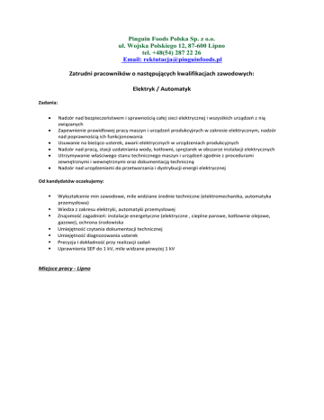 Pinguin Foods Polska Sp. z o.o. ul. Wojska Polskiego 12, 87-600 Lipno tel. +48(54) 287 22 26 Email: [email protected] Zatrudni pracowników o następujących kwalifikacjach zawodowych: Elektryk / Automatyk Zadania: Nadzór nad bezpieczeństwem i sprawnością całej sieci elektrycznej i wszystkich urządzeń z nią związanych Zapewnienie prawidłowej pracy maszyn i urządzeń produkcyjnych w zakresie elektrycznym, nadzór nad poprawnością ich funkcjonowania Usuwanie na bieżąco usterek, awarii elektrycznych w urządzeniach produkcyjnych Nadzór nad pracą, stacji uzdatniania wody, kotłowni, sprężarek w obszarze instalacji elektrycznych Utrzymywanie właściwego stanu technicznego maszyn i urządzeń zgodnie z procedurami zewnętrznymi i wewnętrznymi oraz dokumentacją techniczną Nadzór nad urządzeniami do przetwarzania i dystrybucji energii elektrycznej Od kandydatów oczekujemy: Wykształcenie min zawodowe, mile widziane średnie techniczne (elektromechanika, automatyka przemysłowa) Wiedza z zakresu elektryki, automatyki przemysłowej Znajomość zagadnień: instalacje energetyczne (elektryczne , cieplne parowe, kotłownie olejowe, gazowe), ochrona środowiska Umiejętność czytania dokumentacji technicznej Umiejętność diagnozowania usterek Precyzja i dokładność przy realizacji zadań Uprawnienia SEP do 1 kV, mile widzane powyżej 1 kV Miejsce pracy - Lipno