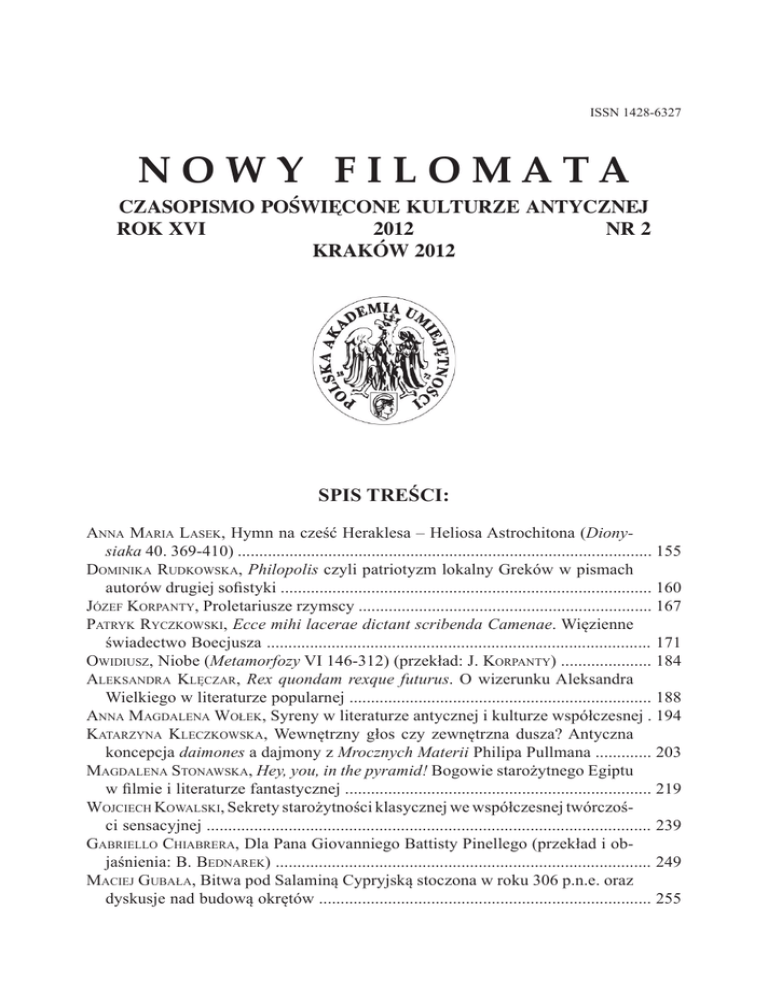 ISSN 1428-6327 NOWY FILOMATA CZASOPISMO POŚWIĘCONE KULTURZE ANTYCZNEJ ROK XVI 2012 NR 2 KRAKÓW 2012 SPIS TREŚCI: Anna Maria Lasek, Hymn na cześć Heraklesa – Heliosa Astrochitona (Dionysiaka 40. 369-410) ................................................................................................ 155 Dominika Rudkowska, Philopolis czyli patriotyzm lokalny Greków w pismach autorów drugiej sofistyki ...................................................................................... 160 Józef Korpanty, Proletariusze rzymscy .................................................................... 167 Patryk Ryczkowski, Ecce mihi lacerae dictant scribenda Camenae. Więzienne świadectwo Boecjusza ......................................................................................... 171 Owidiusz, Niobe (Metamorfozy VI 146-312) (przekład: J. Korpanty) ..................... 184 Aleksandra Klęczar, Rex quondam rexque futurus. O wizerunku Aleksandra Wielkiego w literaturze popularnej ...................................................................... 188 Anna Magdalena Wołek, Syreny w literaturze antycznej i kulturze współczesnej . 194 Katarzyna Kleczkowska, Wewnętrzny głos czy zewnętrzna dusza? Antyczna koncepcja daimones a dajmony z Mrocznych Materii Philipa Pullmana ............. 203 Magdalena Stonawska, Hey, you, in the pyramid! Bogowie starożytnego Egiptu w filmie i literaturze fantastycznej ....................................................................... 219 Wojciech Kowalski, Sekrety starożytności klasycznej we współczesnej twórczości sensacyjnej ....................................................................................................... 239 Gabriello Chiabrera, Dla Pana Giovanniego Battisty Pinellego (przekład i objaśnienia: B. Bednarek) ....................................................................................... 249 Maciej Gubała, Bitwa pod Salaminą Cypryjską stoczona w roku 306 p.n.e. oraz dyskusje nad budową okrętów ............................................................................. 255 154 Nowy Filomata XVI 2012 (1) Bartosz Jan Kołoczek, Propaganda sullańska ........................................................ 267 Artur Ryszard Jęcka, Karol Kłodziński, Praepotentes liberti Augusti za panowania Flawiuszy .................................................................................................. 277 Joachim Śliwa, Kornal Ujejski, „pogrzeb pańszczyzny” i egipska piramida w Pawłowie ................................................................................................................. 293 Anna Kotłowska, Lennart Rydén (1931-2002) i bizantynistyka w Szwecji ........... 303 Recenzje: Paweł Woliński, Nie tylko Goliat. Filistyni na kartach Starego Testamentu (Bartłomiej Grzywniak) ............................................................................................. 313 Petroniusz Arbiter, Satyrikon, tłumaczenie polskie i komentarz Leszek Wysocki (Józef Korpanty) ................................................................................................. 316 Informacje: Konkurs dla licealistów (K. Głogowska, H. Sygnet) .............................................. 319 INFORMACJE DLA AUTORÓW Materiały zgłaszane do druku należy kierować na adres elektroniczny sekretarza redakcji ([email protected]). Przyjmowane są wyłącznie oryginalne artykuły, przekłady utworów literackich z języków starożytnych i nowożytnych, komunikaty i recenzje. Dołączany do tekstu materiał ilustracyjny (zdjęcia, rysunki, mapy przesyłane w formacie .jpg lub .tif) nie może być wcześniej opublikowany w żadnej postaci (drukowanej lub elektronicznej). Redakcja nie zwraca nadsyłanych materiałów. Cytaty łacińskie należy zaznaczyć kursywą (w przypadku dłuższych przytoczeń wskazane jest dodanie przekładu polskiego wraz z nazwiskiem tłumacza), wyrazy greckie zamieścić w łacińskiej transkrypcji, cytaty polskie ująć w cudzysłów. Odniesienia do autorów starożytnych powinny być podane w ogólnie przyjętej skróconej formie (np. Hom. Od. 3.98-101; Thuc. 1.22; Ovid. Am.1.3.1-4). Adresy bibliograficzne należy zamieszczać w przypisach, np.: K. Galinsky, Augustan Culture. An Interpretative Introduction, Princeton 1996, s. 103107 (dalej: Galinsky, op. cit., s. 133, ewentualnie: Galinsky, Augustan Culture…, s. 133); M. Brożek, Kolor w elegiach Propercjusza, Meander 40, 1985, s. 369; E. Wipszycka, Grecki Egipt czasów hellenistycznych: imigracja czy hellenizacja, [w:] Wędrówka i etnogeneza w starożytności i średniowieczu, red. M. Salamon i J. Strzelczyk, Kraków 2004, s. 81-82; należy zasadniczo unikać podawania bibliografii w postaci oddzielnej listy. Do nadsyłanych recenzji powinien być dołączony pełny opis bibliograficzny recenzowanej pozycji łącznie z numerem ISBN.