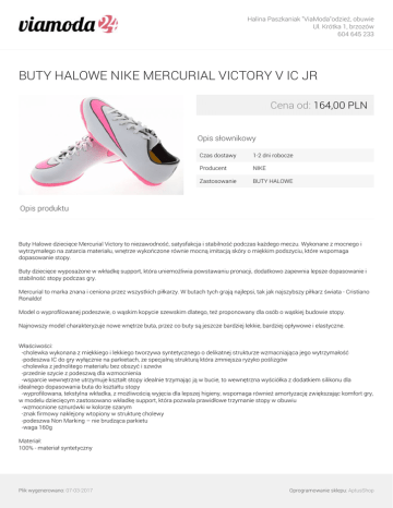 Halina Paszkaniak "ViaModa"odzież, obuwie Ul. Krótka 1, brzozów 604 645 233 BUTY HALOWE NIKE MERCURIAL VICTORY V IC JR Cena od: 164,00 PLN Opis słownikowy Czas dostawy 1-2 dni robocze Producent NIKE Zastosowanie BUTY HALOWE Opis produktu Buty Halowe dziecięce Mercurial Victory to niezawodność, satysfakcja i stabilność podczas każdego meczu. Wykonane z mocnego i wytrzymałego na zatarcia materiału, wnętrze wykończone równie mocną imitacją skóry o miękkim podszyciu, które wspomaga dopasowanie stopy. Buty dziecięce wyposażone w wkładkę support, która uniemożliwia powstawaniu pronacji, dodatkowo zapewnia lepsze dopasowanie i stabilność stopy podczas gry. Mercurial to marka znana i ceniona przez wszystkich piłkarzy. W butach tych grają najlepsi, tak jak najszybszy piłkarz świata - Cristiano Ronaldo! Model o wyprofilowanej podeszwie, o wąskim kopycie szewskim dlatego, też proponowany dla osób o wąskiej budowie stopy. Najnowszy model charakteryzuje nowe wnętrze buta, przez co buty są jeszcze bardziej lekkie, bardziej opływowe i elastyczne. Właściwości: -cholewka wykonana z miękkiego i lekkiego tworzywa syntetycznego o delikatnej strukturze wzmacniająca jego wytrzymałość -podeszwa IC do gry wyłącznie na parkietach, ze specjalną strukturą która zmniejsza ryzyko poślizgów -cholewka z jednolitego materiału bez obszyć i szwów -przednie szycie z podeszwą dla wzmocnienia -wsparcie wewnętrzne utrzymuje kształt stopy idealnie trzymając ją w bucie, to wewnętrzna wyściółka z dodatkiem silikonu dla idealnego dopasowania buta do kształtu stopy -wyprofilowana, tekstylna wkładka, z możliwością wyjęcia dla lepszej higieny, wspomaga również amortyzację zwiększając komfort gry, w modelu dziecięcym zastosowano wkładkę support, która pozwala prawidłowe trzymanie stopy w obuwiu -wzmocnione sznurówki w kolorze szarym -znak firmowy naklejony wtopiony w strukturę cholewy -podeszwa Non Marking – nie brudząca parkietu -waga 160g Materiał: 100% - materiał syntetyczny Plik wygenerowano: 07-03-2017 Oprogramowanie sklepu: AptusShop Halina Paszkaniak "ViaModa"odzież, obuwie Ul. Krótka 1, brzozów 604 645 233 Kolor: całość stalowa, znak firmowy oraz podeszwa w kolorze zdecydowanym różowym Parametry WYBIERZ ROZMIAR 38 1/2 Warianty produktu BUTY HALOWE NIKE MERCURIAL VICTORY V IC JR 164,00 PLN BUTY HALOWE NIKE MERCURIAL VICTORY V IC JR 651639-060 Galeria Plik wygenerowano: 07-03-2017 Powered by TCPDF (www.tcpdf.org) Oprogramowanie sklepu: AptusShop