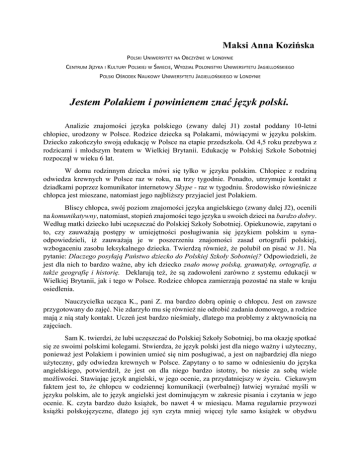 Maksi Anna Kozińska POLSKI UNIWERSYTET NA OBCZYŹNIE W LONDYNIE CENTRUM JĘZYKA I KULTURY POLSKIEJ W ŚWIECIE, WYDZIAŁ POLONISTYKI UNIWERSYTETU JAGIELLOŃSKIEGO POLSKI OŚRODEK NAUKOWY UNIWERSYTETU JAGIELLOŃSKIEGO W LONDYNIE Jestem Polakiem i powinienem znać język polski. Analizie znajomości języka polskiego (zwany dalej J1) został poddany 10-letni chłopiec, urodzony w Polsce. Rodzice dziecka są Polakami, mówiącymi w języku polskim. Dziecko zakończyło swoją edukację w Polsce na etapie przedszkola. Od 4,5 roku przebywa z rodzicami i młodszym bratem w Wielkiej Brytanii. Edukację w Polskiej Szkole Sobotniej rozpoczął w wieku 6 lat. W domu rodzinnym dziecka mówi się tylko w języku polskim. Chłopiec z rodziną odwiedza krewnych w Polsce raz w roku, na trzy tygodnie. Ponadto, utrzymuje kontakt z dziadkami poprzez komunikator internetowy Skype - raz w tygodniu. Środowisko rówieśnicze chłopca jest mieszane, natomiast jego najbliższy przyjaciel jest Polakiem. Bliscy chłopca, swój poziom znajomości języka angielskiego (zwany dalej J2), ocenili na komunikatywny, natomiast, stopień znajomości tego języka u swoich dzieci na bardzo dobry. Według matki dziecko lubi uczęszczać do Polskiej Szkoły Sobotniej. Opiekunowie, zapytani o to, czy zauważają postępy w umiejętności posługiwania się językiem polskim u synaodpowiedzieli, iż zauważają je w poszerzeniu znajomości zasad ortografii polskiej, wzbogaceniu zasobu leksykalnego dziecka. Twierdzą również, że polubił on pisać w J1. Na pytanie: Dlaczego posyłają Państwo dziecko do Polskiej Szkoły Sobotniej? Odpowiedzieli, że jest dla nich to bardzo ważne, aby ich dziecko znało mowę polską, gramatykę, ortografię, a także geografię i historię. Deklarują też, że są zadowoleni zarówno z systemu edukacji w Wielkiej Brytanii, jak i tego w Polsce. Rodzice chłopca zamierzają pozostać na stałe w kraju osiedlenia. Nauczycielka ucząca K., pani Z. ma bardzo dobrą opinię o chłopcu. Jest on zawsze przygotowany do zajęć. Nie zdarzyło mu się również nie odrobić zadania domowego, a rodzice mają z nią stały kontakt. Uczeń jest bardzo nieśmiały, dlatego ma problemy z aktywnością na zajęciach. Sam K. twierdzi, że lubi uczęszczać do Polskiej Szkoły Sobotniej, bo ma okazję spotkać się ze swoimi polskimi kolegami. Stwierdza, że język polski jest dla niego ważny i użyteczny, ponieważ jest Polakiem i powinien umieć się nim posługiwać, a jest on najbardziej dla niego użyteczny, gdy odwiedza krewnych w Polsce. Zapytany o to samo w odniesieniu do języka angielskiego, potwierdził, że jest on dla niego bardzo istotny, bo niesie za sobą wiele możliwości. Stawiając język angielski, w jego ocenie, za przydatniejszy w życiu. Ciekawym faktem jest to, że chłopcu w codziennej komunikacji (werbalnej) łatwiej wyrażać myśli w języku polskim, ale to język angielski jest dominującym w zakresie pisania i czytania w jego ocenie. K. czyta bardzo dużo książek, bo nawet 4 w miesiącu. Mama regularnie przywozi książki polskojęzyczne, dlatego jej syn czyta mniej więcej tyle samo książek w obydwu językach. Uczeń deklaruje, że w domu rozmawia z rodzicami i rodzeństwem po polsku, ale bawiąc się z bratem używa sformułowań anglojęzycznych. Ze znajomymi, natomiast rozmawia głównie po angielsku. K. chce zostać w Wielkiej Brytanii, bo jak twierdzi jest więcej ciekawych rzeczy. K. napisał pracę na temat Moja rodzina za 15 lat, która została poddana analizie pod względem gramatycznym, składniowym, także stylistycznym poprzez pryzmat wpływów angielskich. Chłopiec stara się pisać całymi zdaniami, szyk zdań jest zazwyczaj poprawny. Nie odnotowuję rażących podobieństw do szyku zdań występujących w J2. Zaobserwowałam jednak nadużycie partykuły także, może to wskazywać na kalkę z języka angielskiego w zakresie użycia formy as well (Chciałbym także / I would like as well). Zdania, które tworzy K., są zazwyczaj złożone. Popełnia on błędy ortograficzne, ale nie zakłócają one odbioru komunikatu (mażenie zamiast marzenie, napewno zamiast na pewno). Praca pod względem fleksji jest bardzo poprawna występuje tylko jeden błąd w zakresie odmiany marki samochodu. Chłopiec nieumiejętnie używa spójnika lub. Problem ilustruje fraza: będę na dobrych lub muzycznych studiach. Użycie interpunkcji jest niekonsekwentne, nie zakłóca ono jednak przekazu informacji. Zasada użycia przecinka przed wyrazem więc niejako odpowiada swojemu anglojęzycznemu odpowiednikowi so (w J2 stosujemy przecinki ze spójnikami współrzędnymi, jakim jest so, or). Niepoprawnie stawia przecinki przed spójnikiem lub (or) w myśl tej samej angielskiej zasady interpunkcyjnej, co w przypadku więc (so). Uczeń wykazuje jednak elementarną wiedzę na temat zastosowania przecinków. Zapis przymiotników angielski i polski z wielkiej litery, przez K., jest zapożyczeniem zasady występującej w języku angielskim o zapisie nazw języków, właśnie z wielkiej litery (Polish, English). Dodatkowo, zapisuje wyrazy wchodzące w skład tytułu z wielkiej litery, wzorując się tym samym na zasadach panujących w J2. W zaprezentowanym fragmencie tekstu zobrazowany jest graficzny zapis języka potocznego ((…) bo jest szalony i szybki jak takie BMW.). Dowodem na to, że chłopiec pisze jak słyszy są liczne opuszczenia litery „ę”(pietnaście zamiast piętnaście). Zdarza mu się również realizować głoski J1 poprzez zapis ich odpowiedników literami odpowiadającymi tej głosce w J2 (senceja zamiast senseia). K. zabrakło słów w języku polskim, więc użył słowa drama oznaczającego zajęcia aktorskie. Niemniej jednak, zasób leksykalny chłopca jest przyzwoity. Wypracowanie K., w mojej ocenie, jest bardzo dobrą i solidną pracą. Wiem, że włożył wiele wysiłku i czasu, aby ją napisać. Ponadto, napisał ją odręcznie, po czym przepisał ją na 
