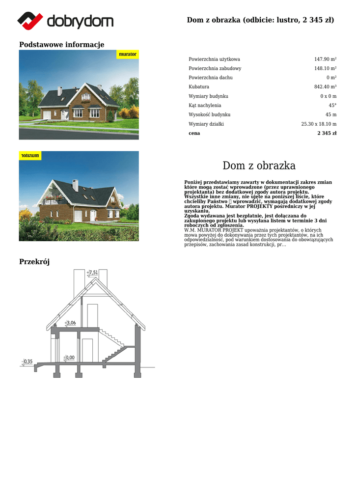 Dom z obrazka (odbicie: lustro, 2 345 zł) Podstawowe informacje Powierzchnia użytkowa 147.90 m² Powierzchnia zabudowy 148.10 m² Powierzchnia dachu Kubatura 0 m² 842.40 m³ Wymiary budynku Kąt nachylenia 0x0m 45° Wysokość budynku Wymiary działki cena 45 m 25.30 x 18.10 m 2 345 zł Dom z obrazka Poniżej przedstawiamy zawarty w dokumentacji zakres zmian które mogą zostać wprowadzone (przez uprawnionego projektanta) bez dodatkowej zgody autora projektu. Wszystkie inne zmiany, nie ujęte na poniższej liście, które chcieliby Państwo wprowadzić, wymagają dodatkowej zgody autora projektu. Murator PROJEKTY pośredniczy w jej uzyskaniu. Zgoda wydawana jest bezpłatnie, jest dołączana do zakupionego projektu lub wysyłana listem w terminie 3 dni roboczych od zgłoszenia. W.M. MURATOR PROJEKT upoważnia projektantów, o których mowa powyżej do dokonywania przez tych projektantów, na ich odpowiedzialność, pod warunkiem dostosowania do obowiązujących przepisów, zachowania zasad konstrukcji, pr… Przekrój Dom z obrazka (odbicie: lustro, 2 345 zł) Rzuty Parter 0 m² przedsionek 4.10 m² taras 0.00 m² hol 6.80 m² pokój dzienny 39.40 m² kuchnia 10.70 m² sypialnia 12.10 m² łazienka 2.60 m² kotłownia 4.90 m² garaż 20.80 m² taras 0.00 m² Poddasze 0 m² schody 6.40 m² hol 7.40 m² sypialnia 9.60 m² sypialnia 10.30 m² sypialnia 14.80 m² łazienka 4.70 m² sypialnia 15.50 m² łazienka 3.50 m² loggia 0.00 m²