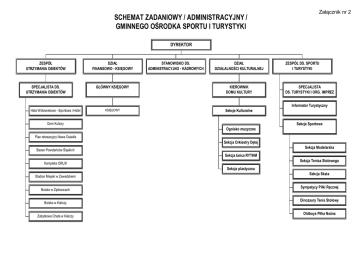 SCHEMAT ZADANIOWY / ADMINISTRACYJNY / GMINNEGO OŚRODKA SPORTU I TURYSTYKI Załącznik nr 2 DYREKTOR ZESPÓŁ UTRZYMANIA OBIEKTÓW DZIAŁ FINANSOWO - KSIĘGOWY SPECJALISTA DS. UTRZYMANIA OBIEKTÓW GŁÓWNY KSIĘGOWY KIEROWNIK DOMU KULTURY KSIĘGOWY Sekcje Kulturalne STANOWISKO DS. ADMINISTRACYJNO - KADROWYCH DZIAŁ DZIAŁALNOŚCI KULTURALNEJ ZESPÓŁ DS. SPORTU I TURYSTYKI SPECJALISTA DS. TURYSTYKI I ORG. IMPREZ Informator Turystyczny Hala Widowiskowo - Sportowa i Hotel Dom Kultury Sekcje Sportowe Ognisko muzyczne Plac rekreacyjny Nowe Osiedle Sekcja Orkiestry Dętej Sekcja Modelarska Basen Powstańców Śląskich Sekcja tańca RYTHM Sekcja Tenisa Stołowego Kompleks ORLIK Sekcje plastyczna Stadion Miejski w Zawadzkiem Boisko w Żędowicach Boisko w Kielczy Zabytkowa Chata w Kielczy Sekcja Skata Sympatycy Piłki Ręcznej Dinozaury Tenis Stołowy Oldboys Piłka Nożna